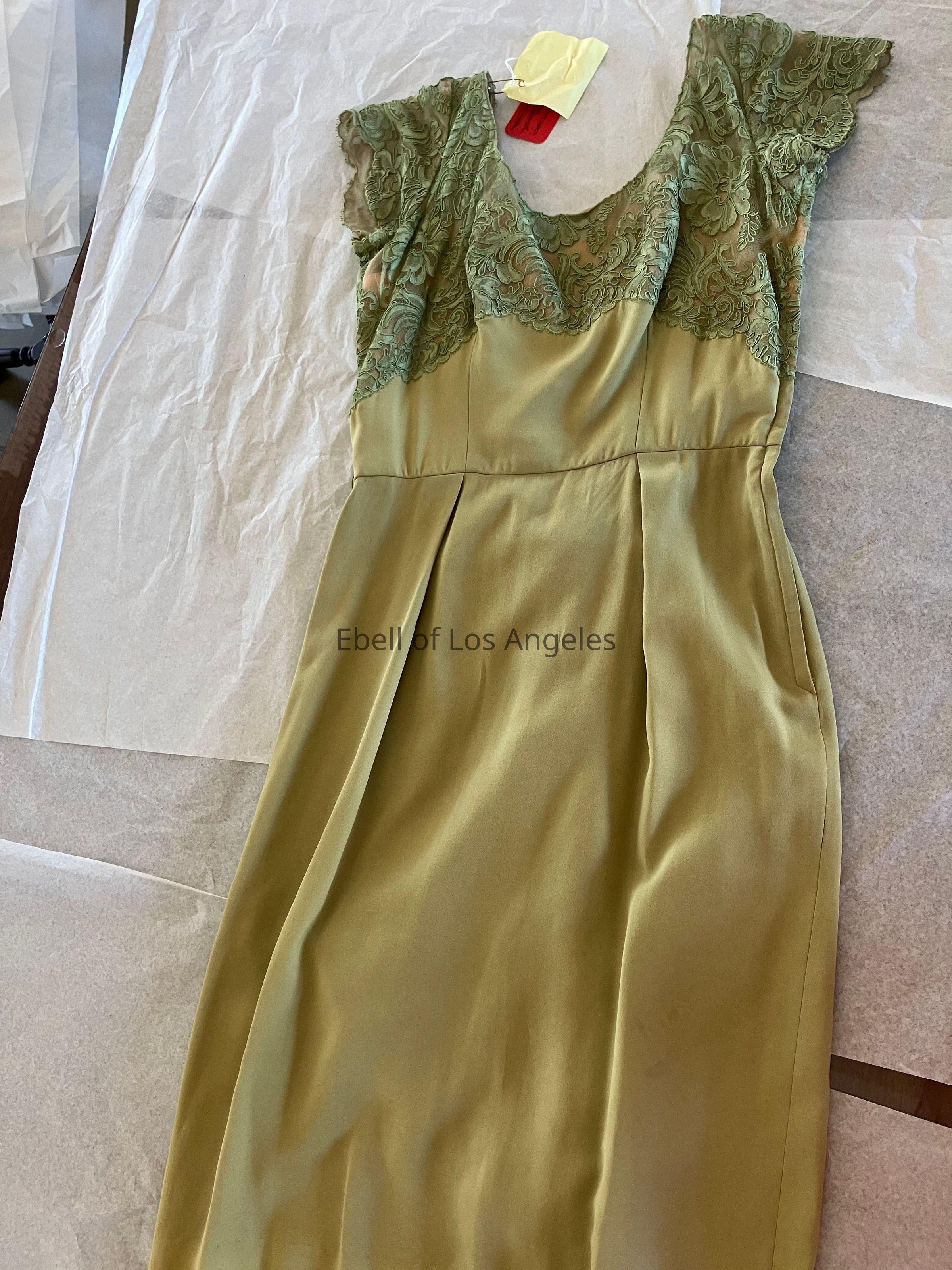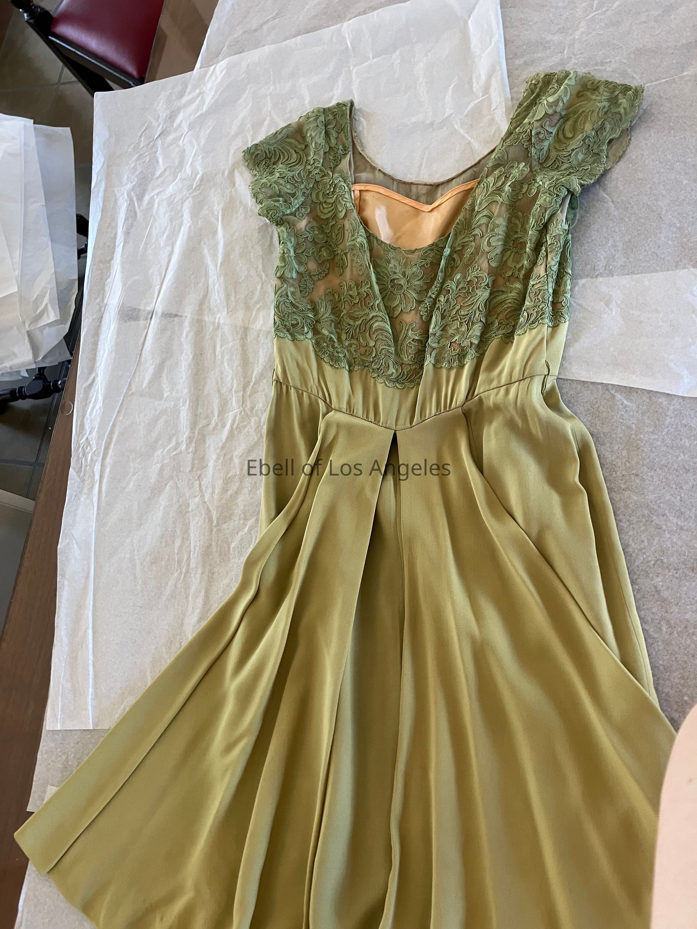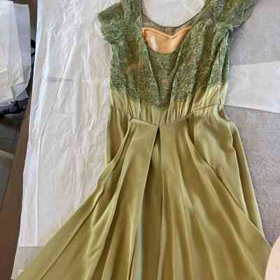Green silk dress with lace on upper bodice and sleeve, back short train