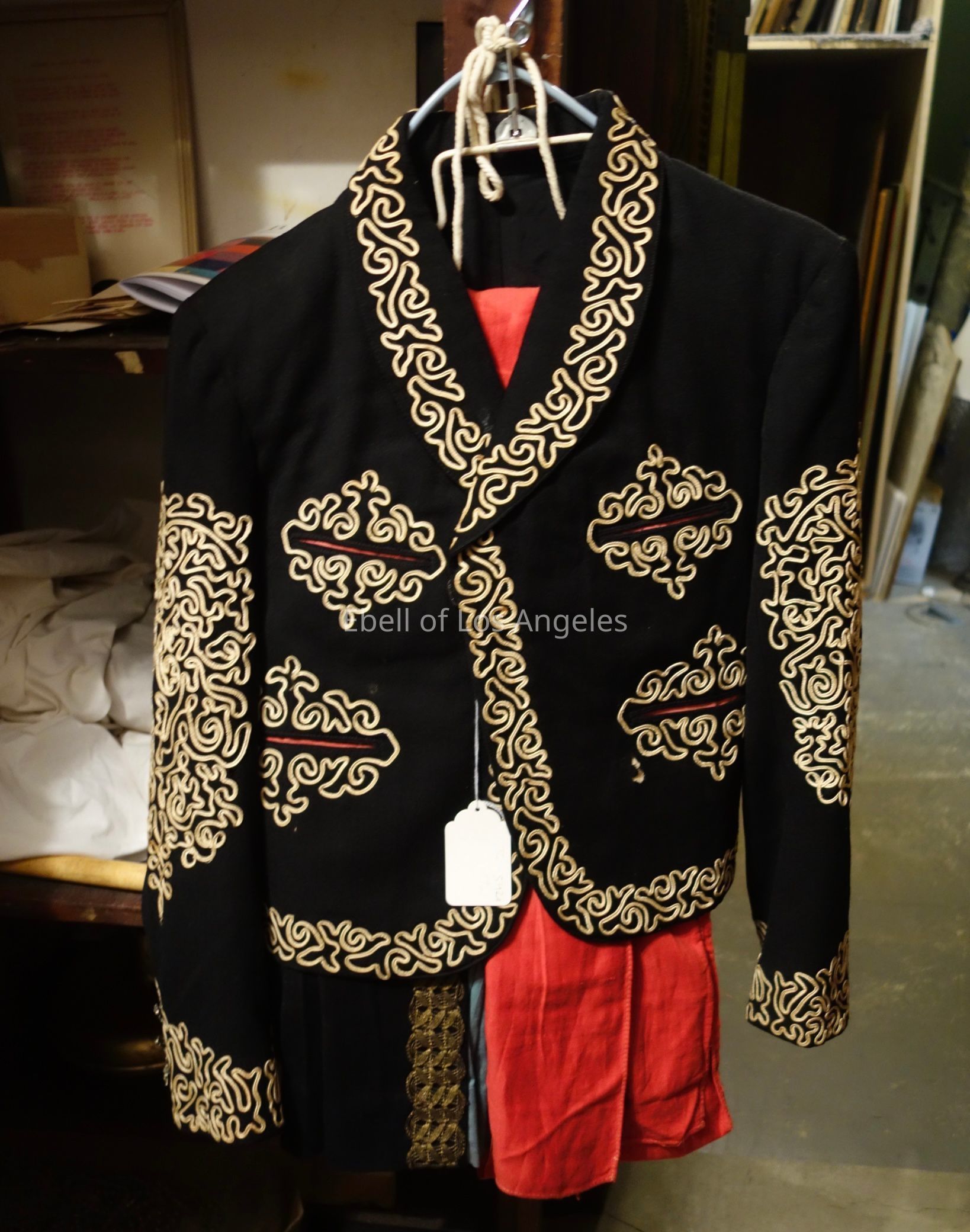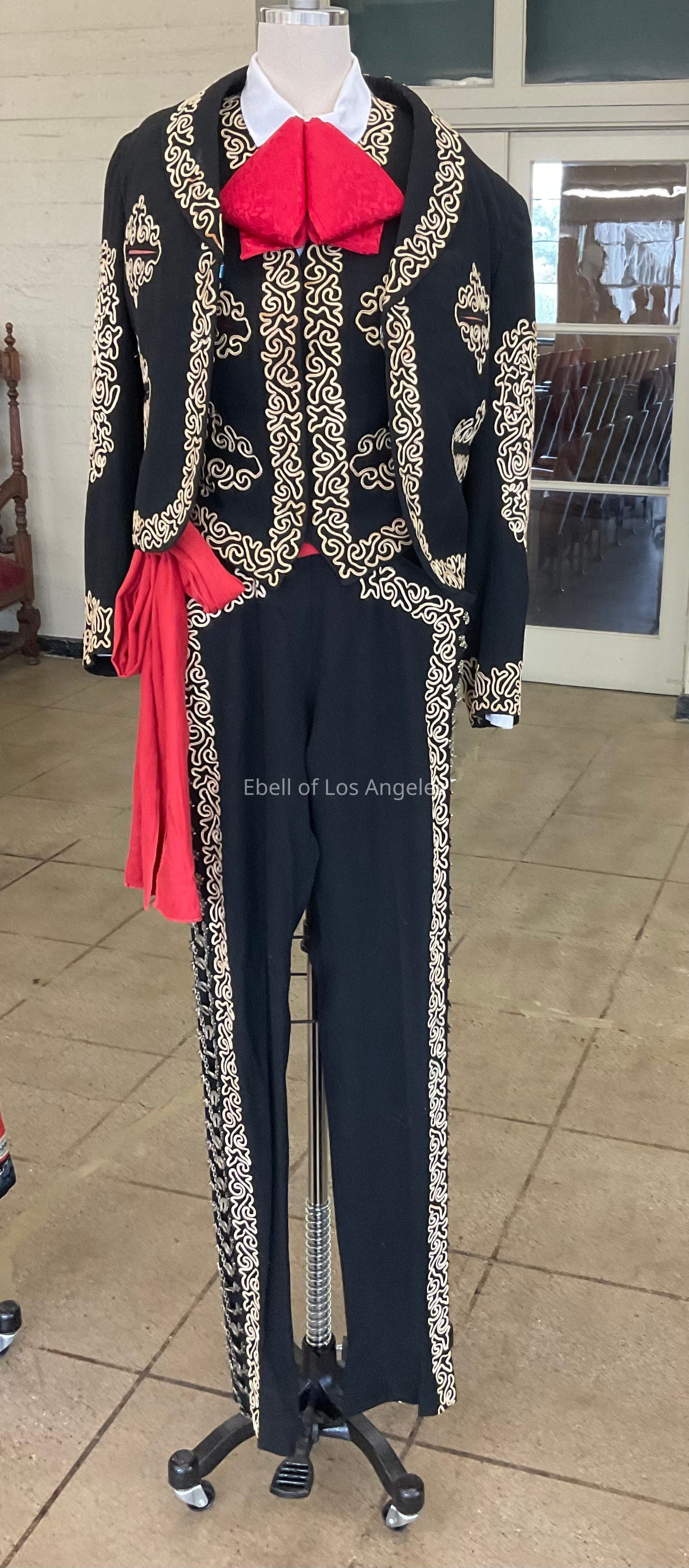 Mariachi 3 piece suit with gold embroidery, welt pockets lined in red, metal horse shoe and chain trim on side of pants and jacket cuffs, red sashCollection