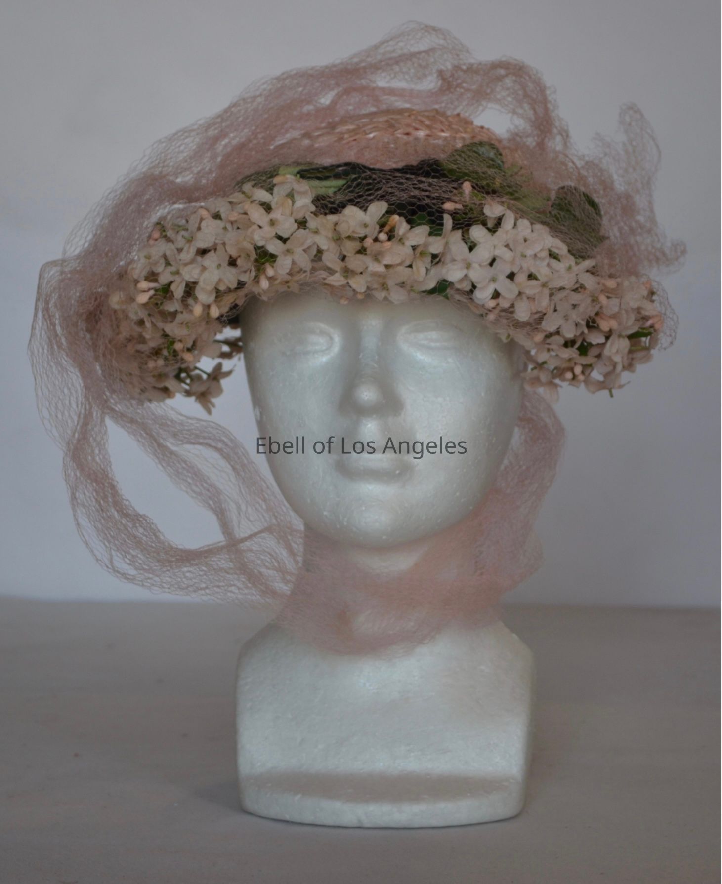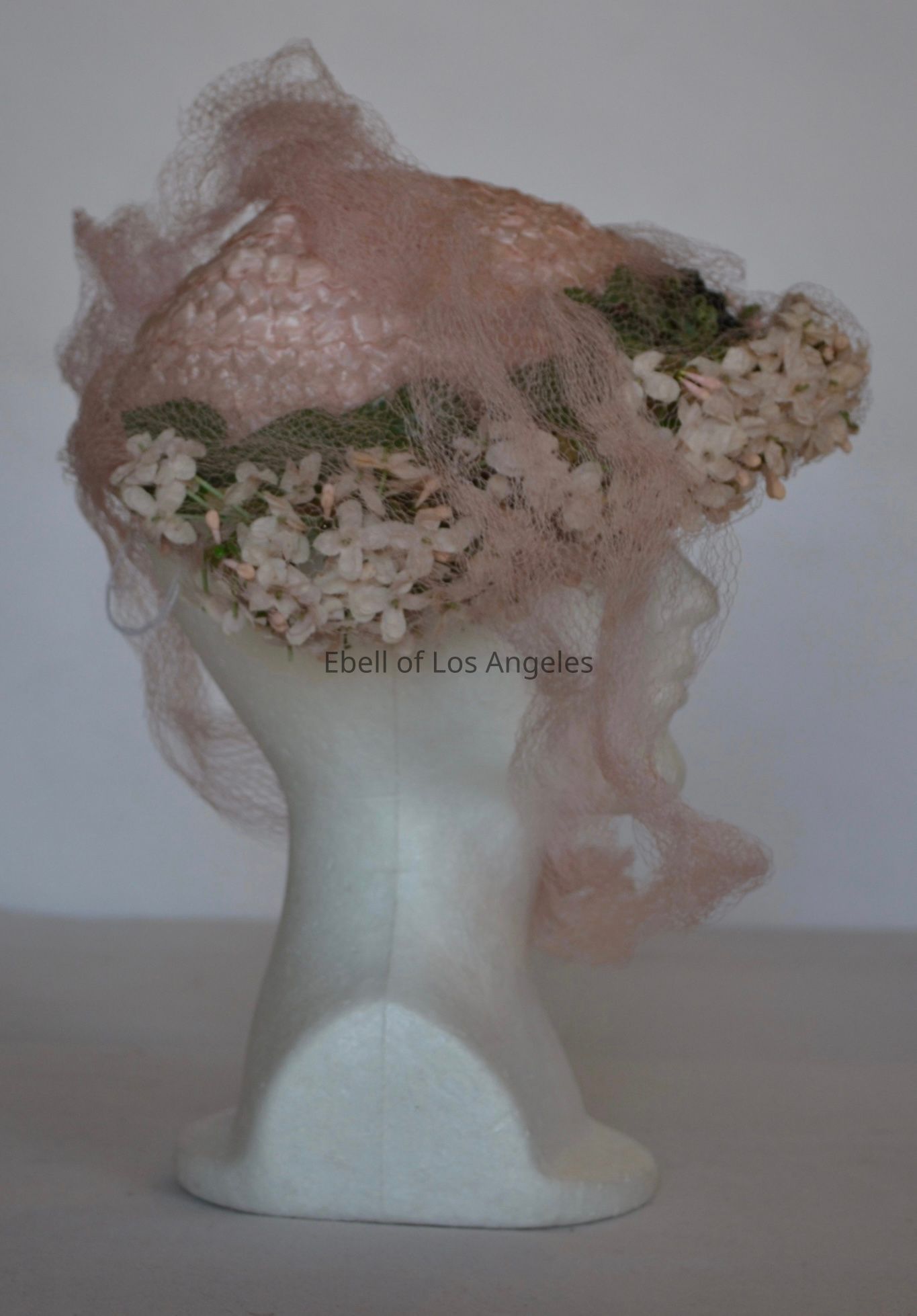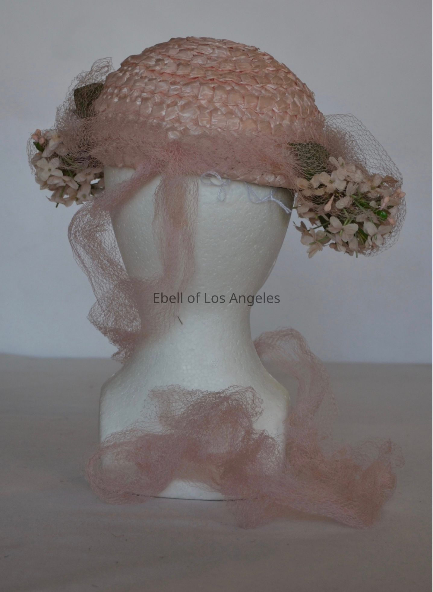 Pink straw bonnet with small white flowers and leaves embellishing front and sides, pink netting ties