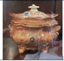 Porcelain (?) bowl with lid, feet and handles, decorated in floral pattern on tan ground.