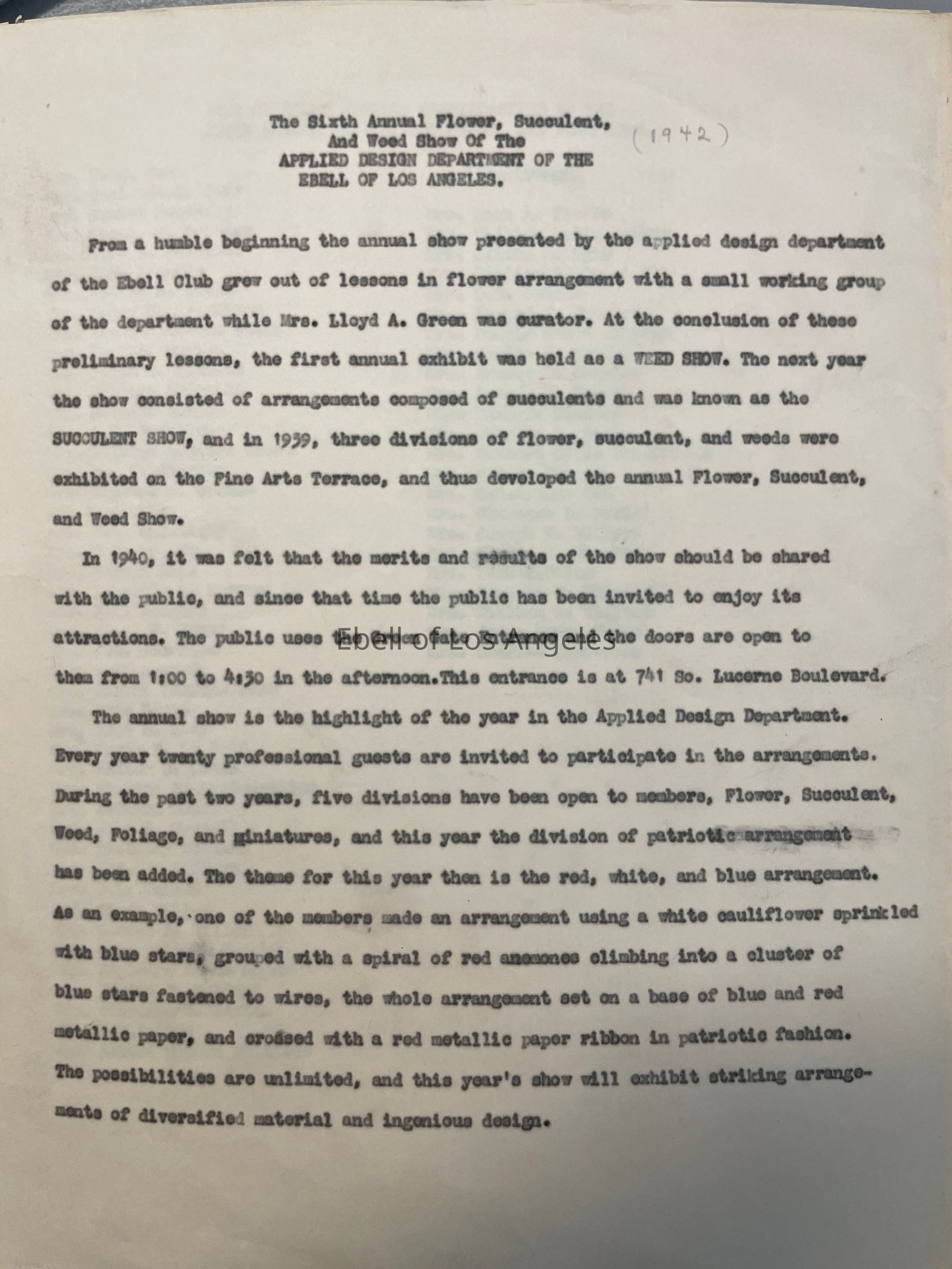 Applied Design. Undated notes on classes, decorating events for the Barker Brothers and Bullocks, donation of silver decor, decoration for the Ebell living room, and a list of Federated Clubs.Container