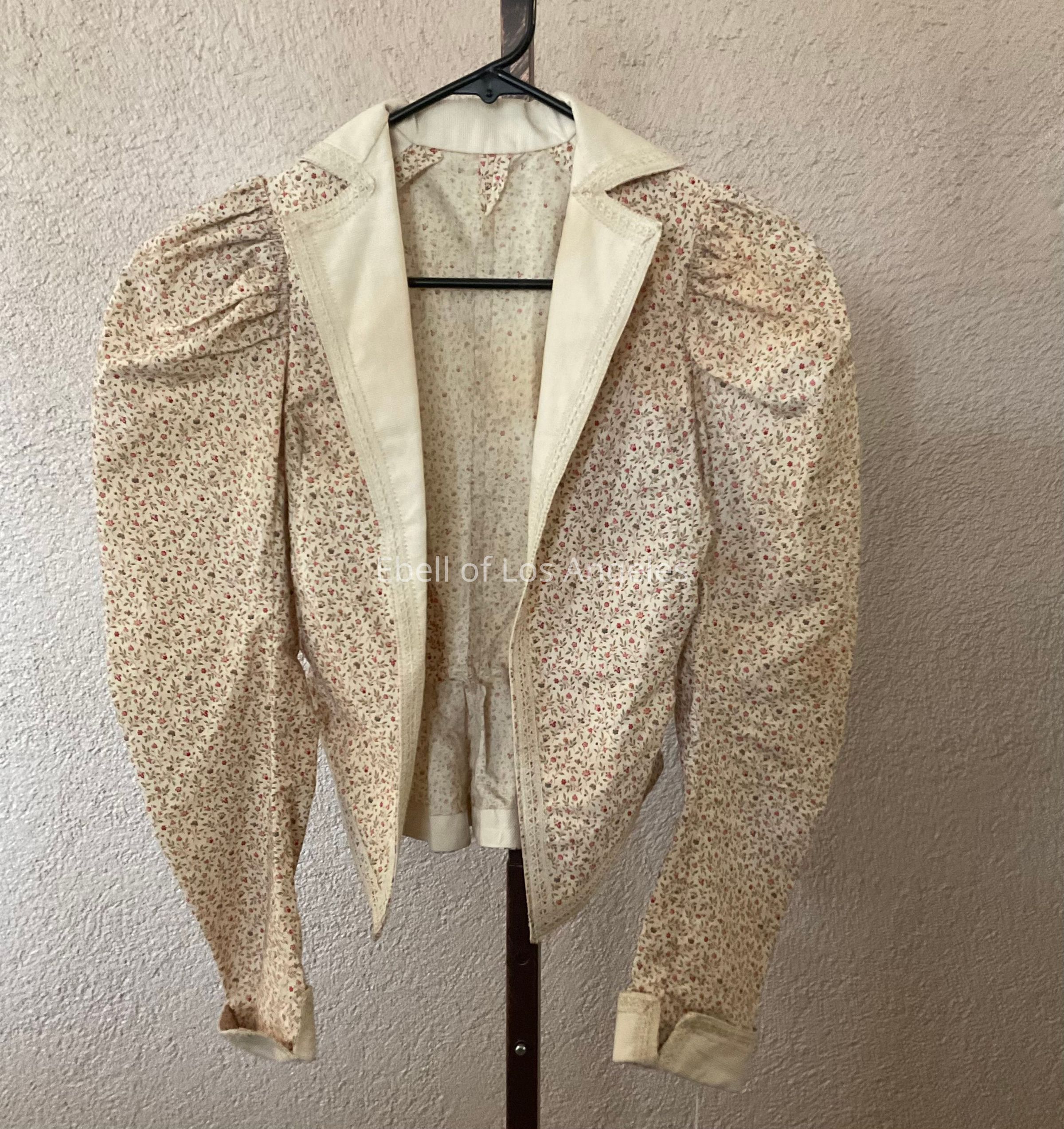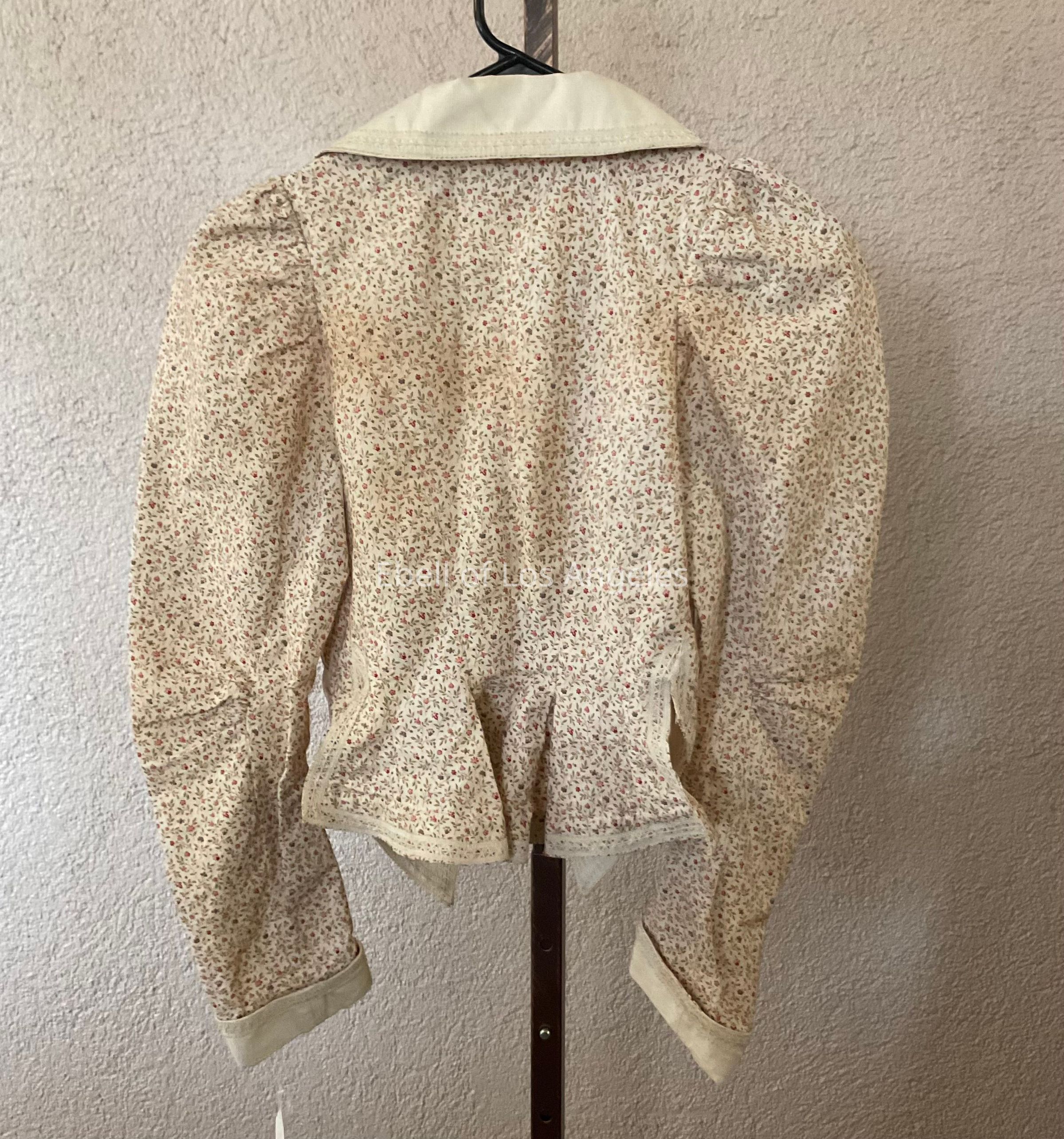 Floral jacket, leg o'mutton sleeves, large contrast notched collar and lapel, and sleeve cuffs, trim on lapels and cuffsEntry/Object ID