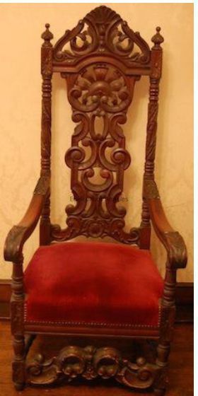 Baroque style elaborately carved mahogany armchair with peaked top, turned frame, scrolled base and stretcher and fitted upholster seat in red velvet.Collection
