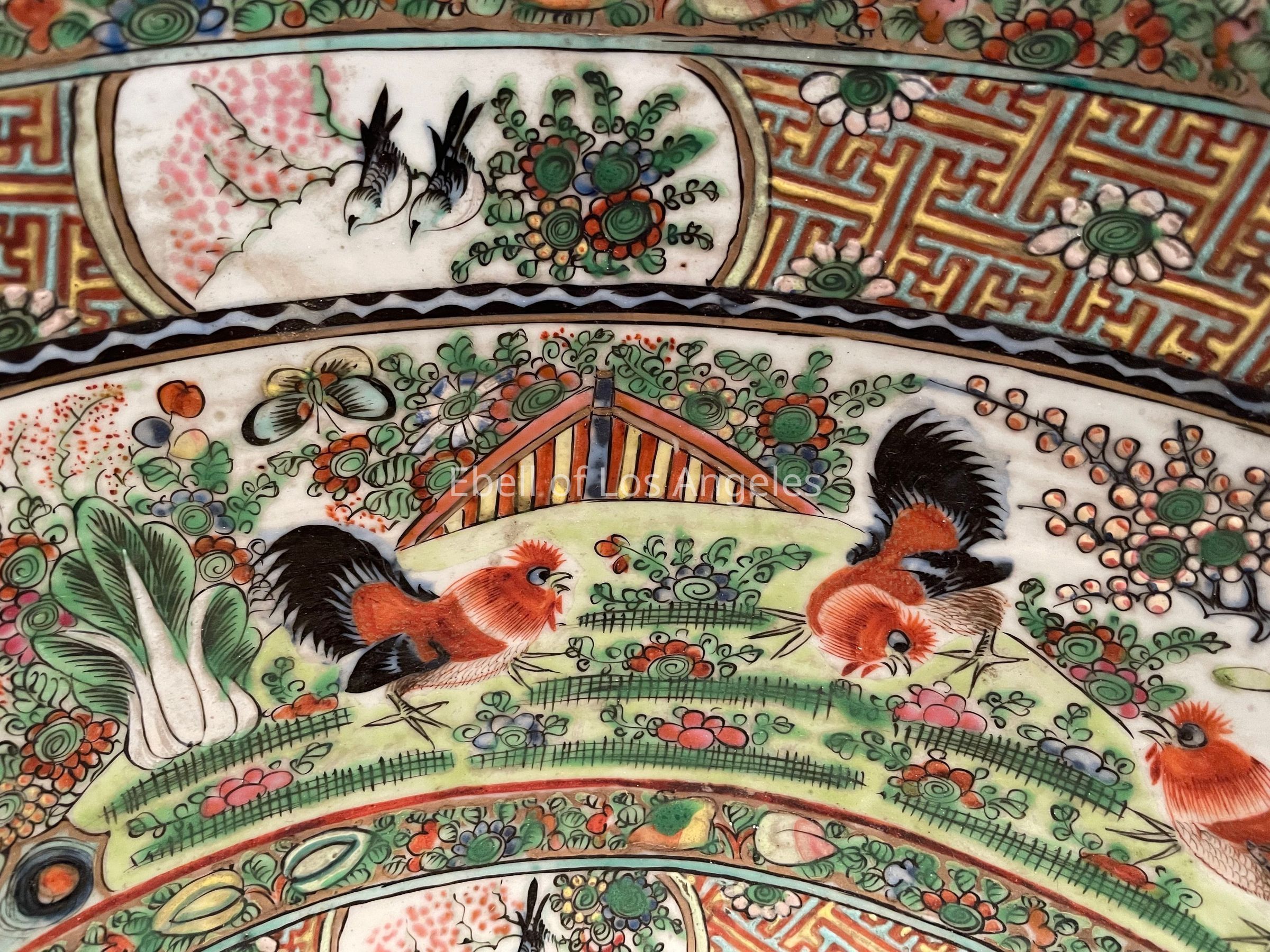 Porcelain bowl, multicolor pattern on white ground, interior and exterior. Chickens and landscape.