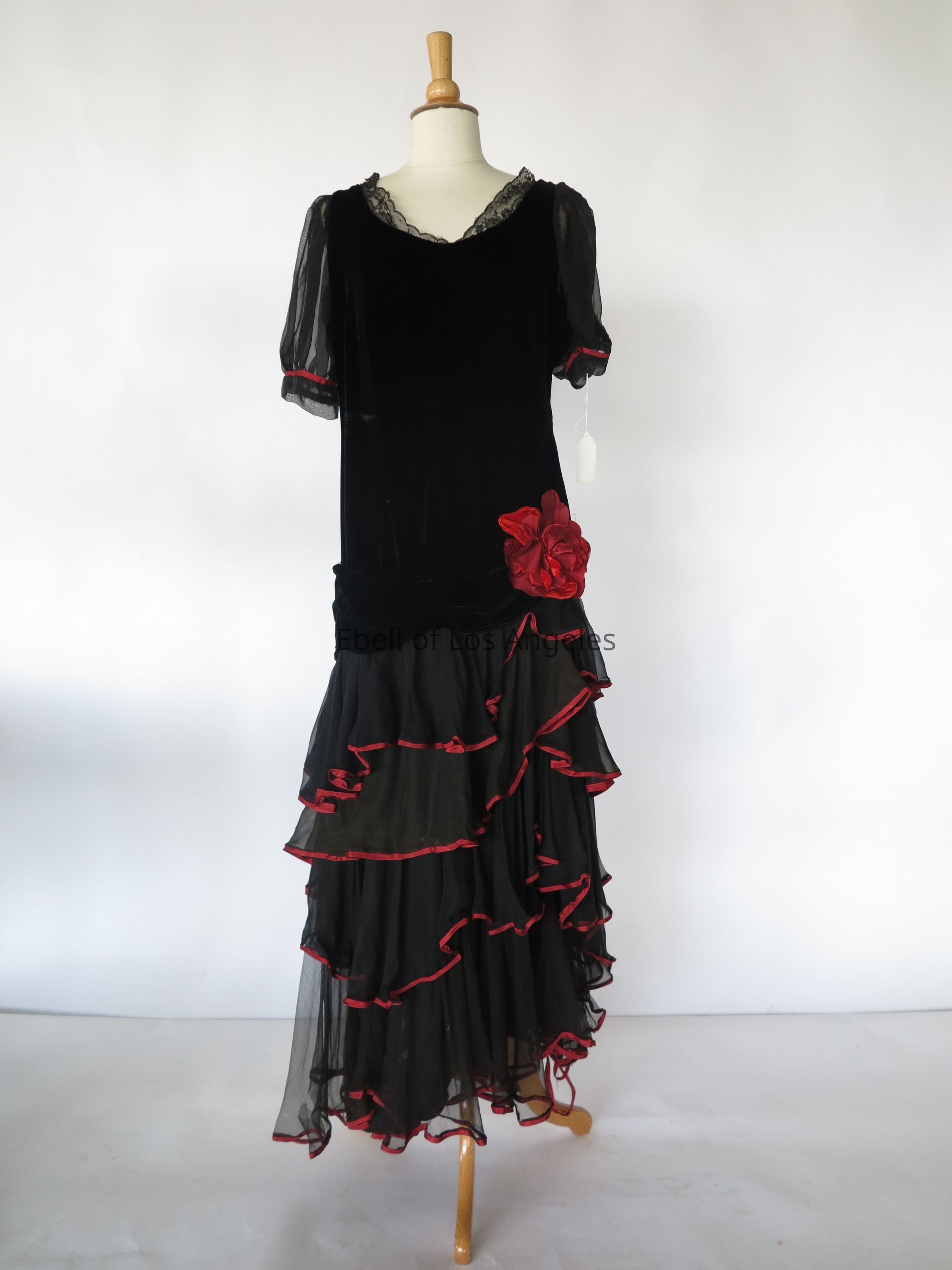 Velvet drop waist dress with chiffon puff sleeves, ruffled skirt with red bias binding, red velvet and satin flower on left hip, ruched details at dropped waist, lace trim at neckCollection