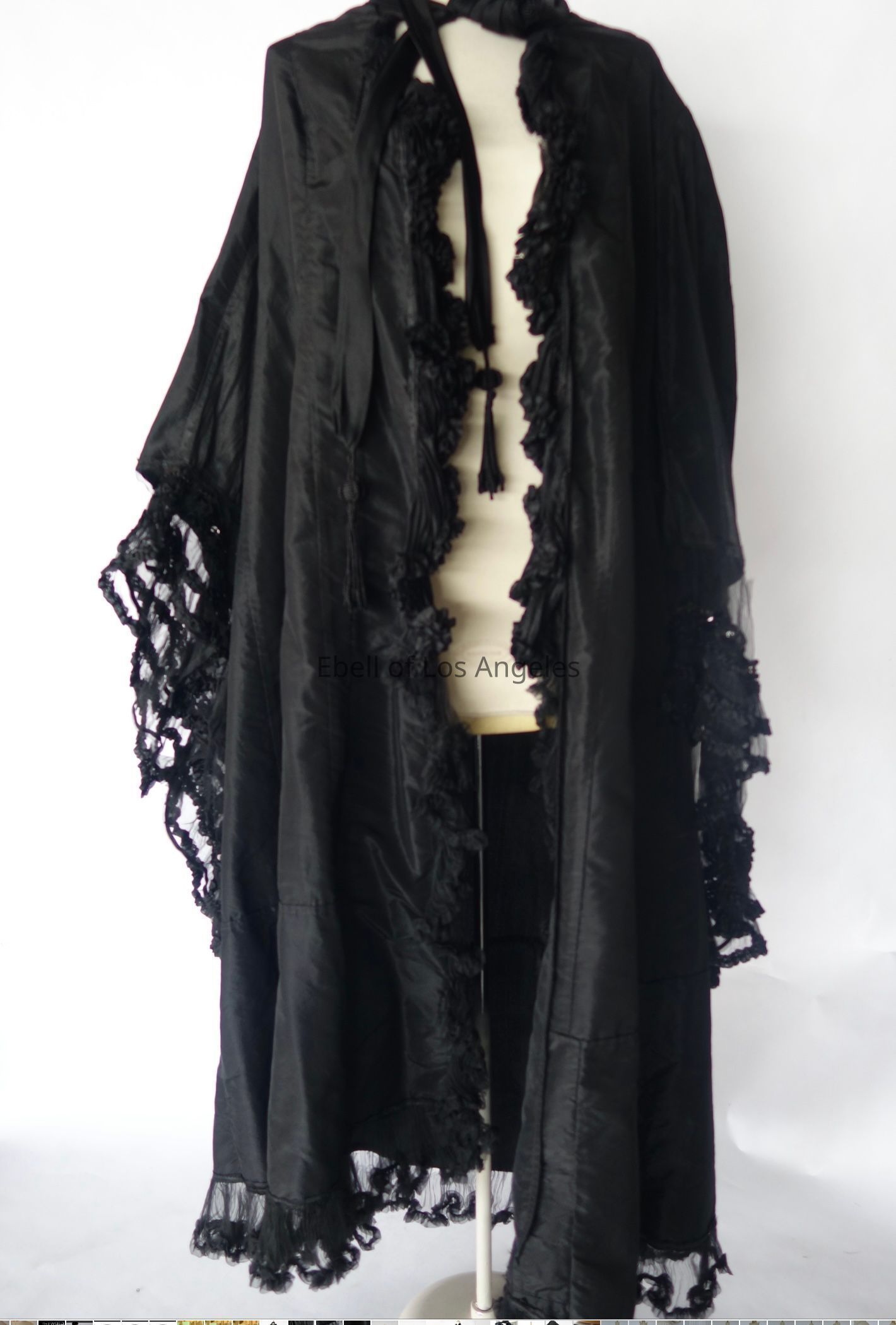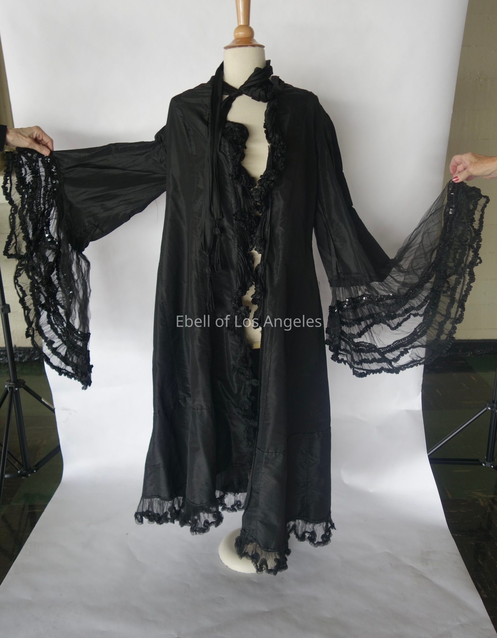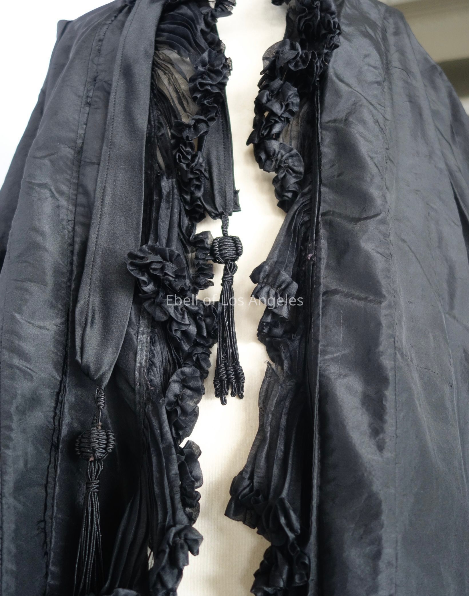 Taffeta long coat with fringed tie and chiffon trim at sleeve cuffs and hem
