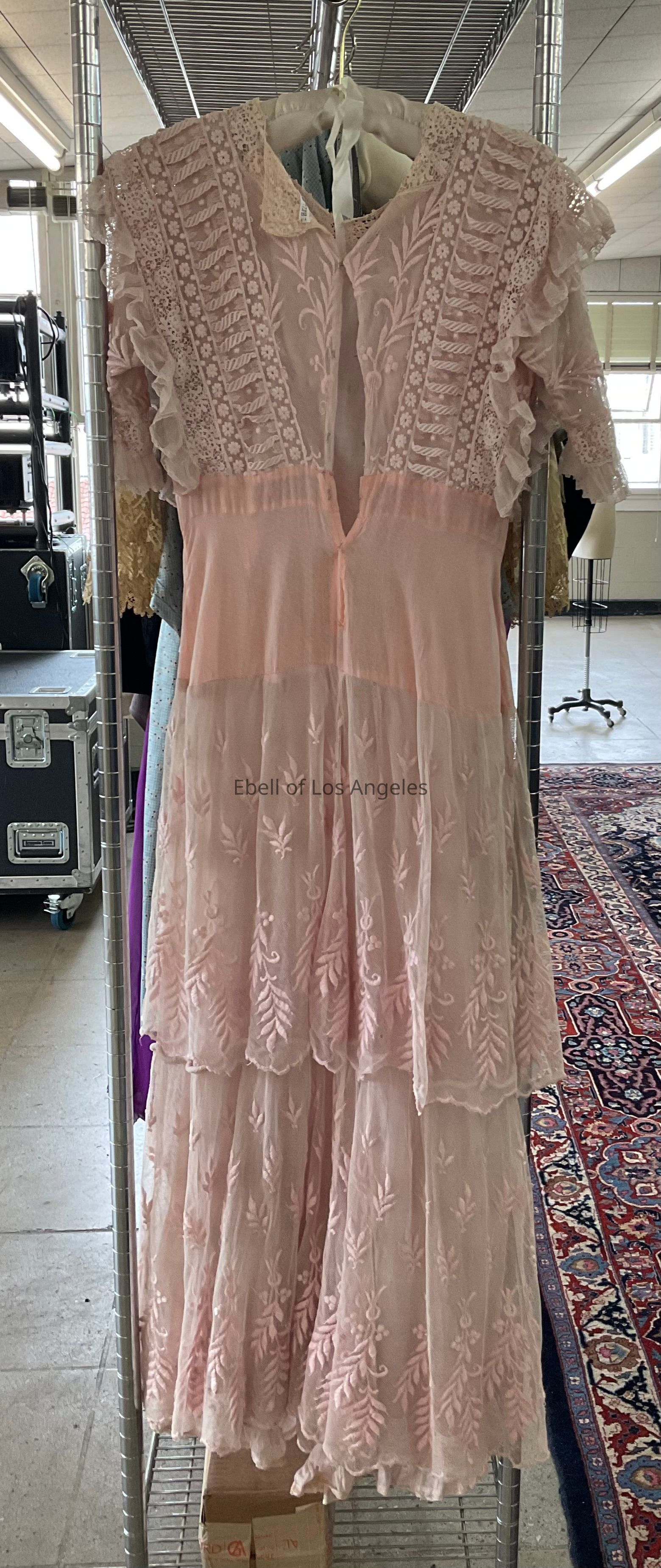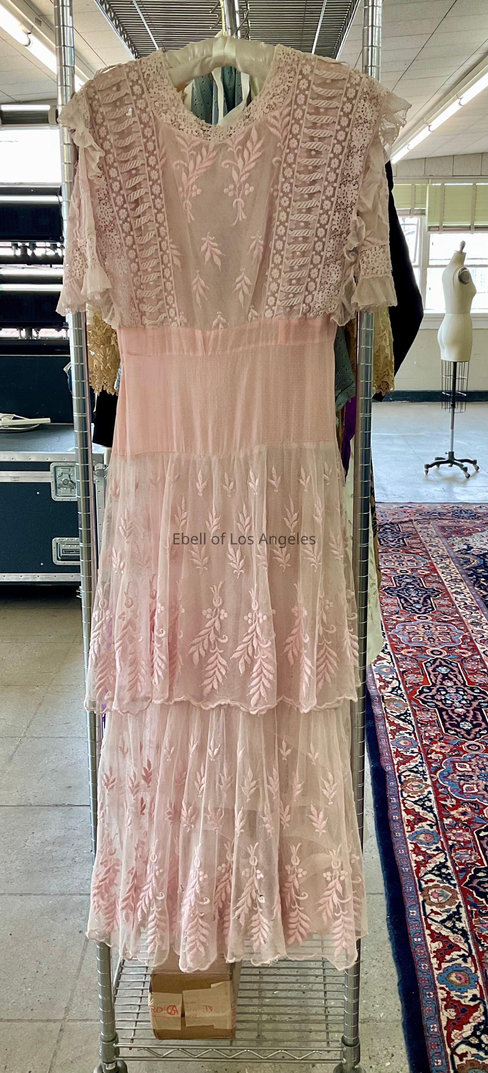 Full length short sleeve lace embellished dress with dotted Swiss waist panel and tiered skirt over matching under dressEntry/Object ID