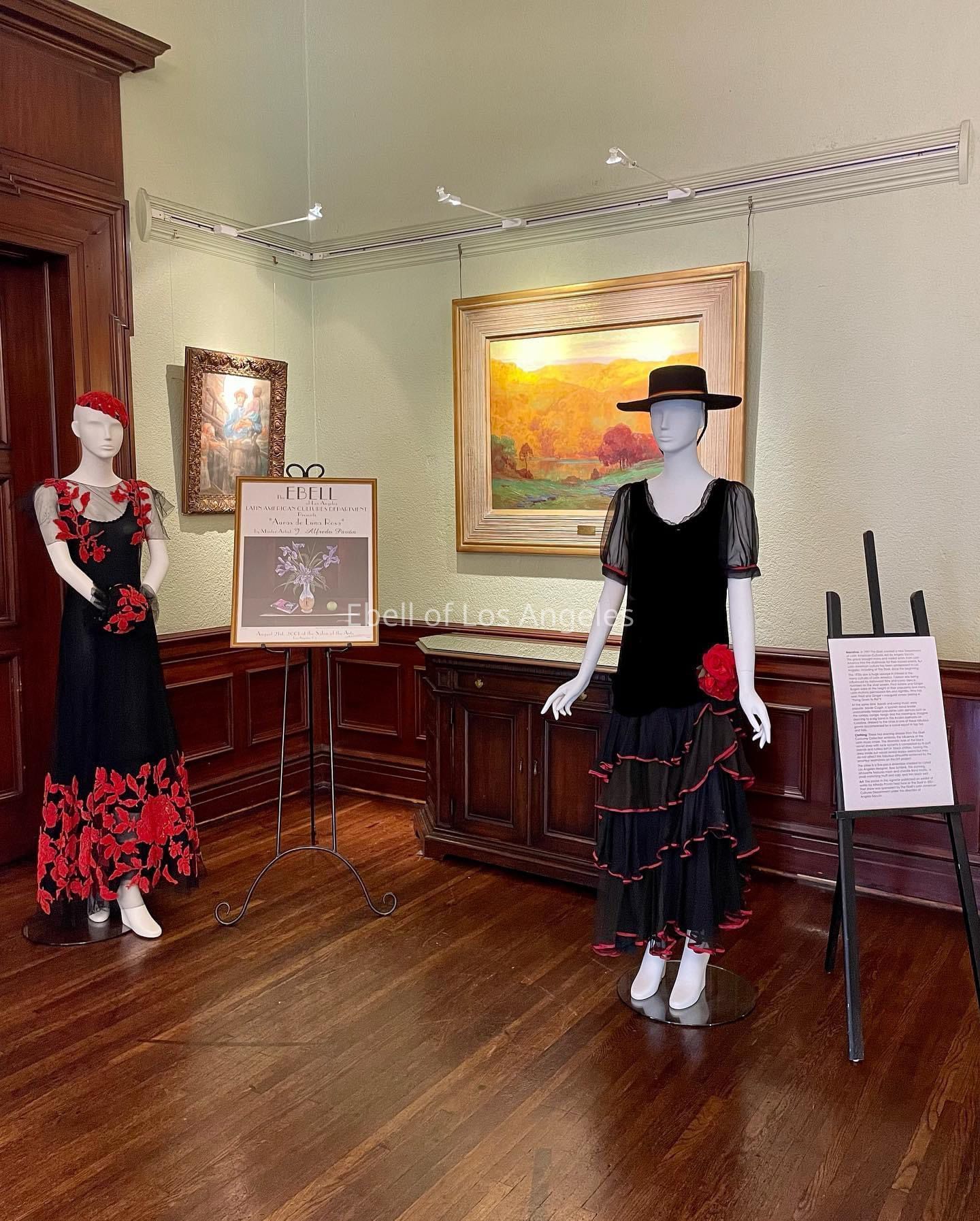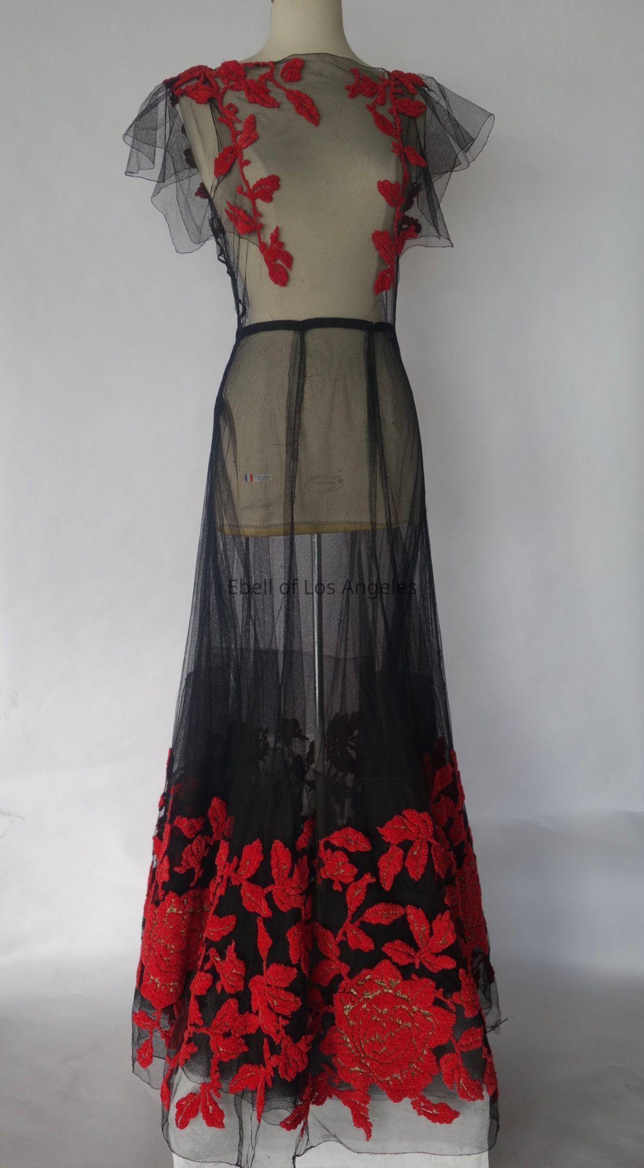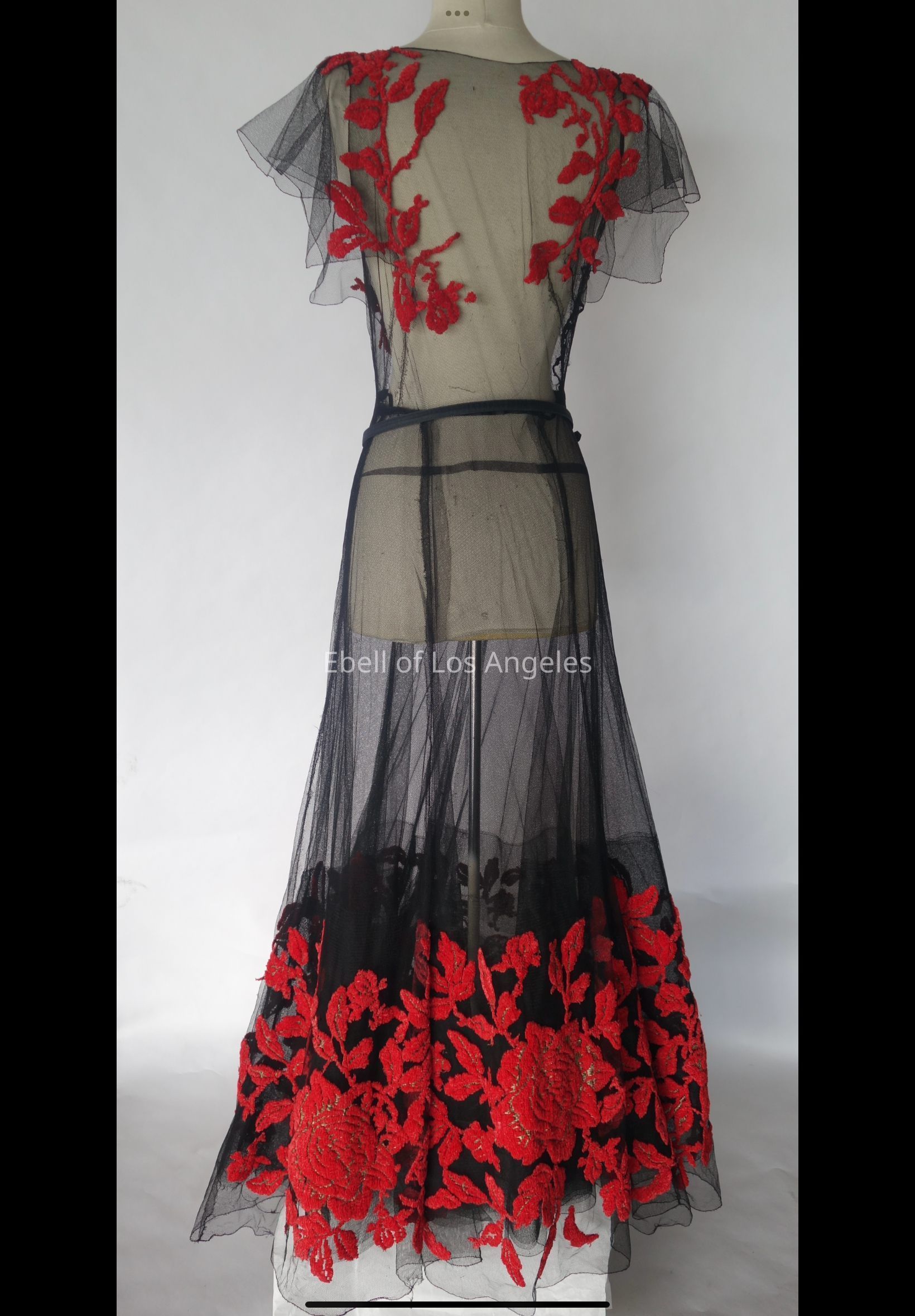 Tulle/netting over dress with chenille red flowers, slip, small matching muff, matching cap, and thin black beltCollection