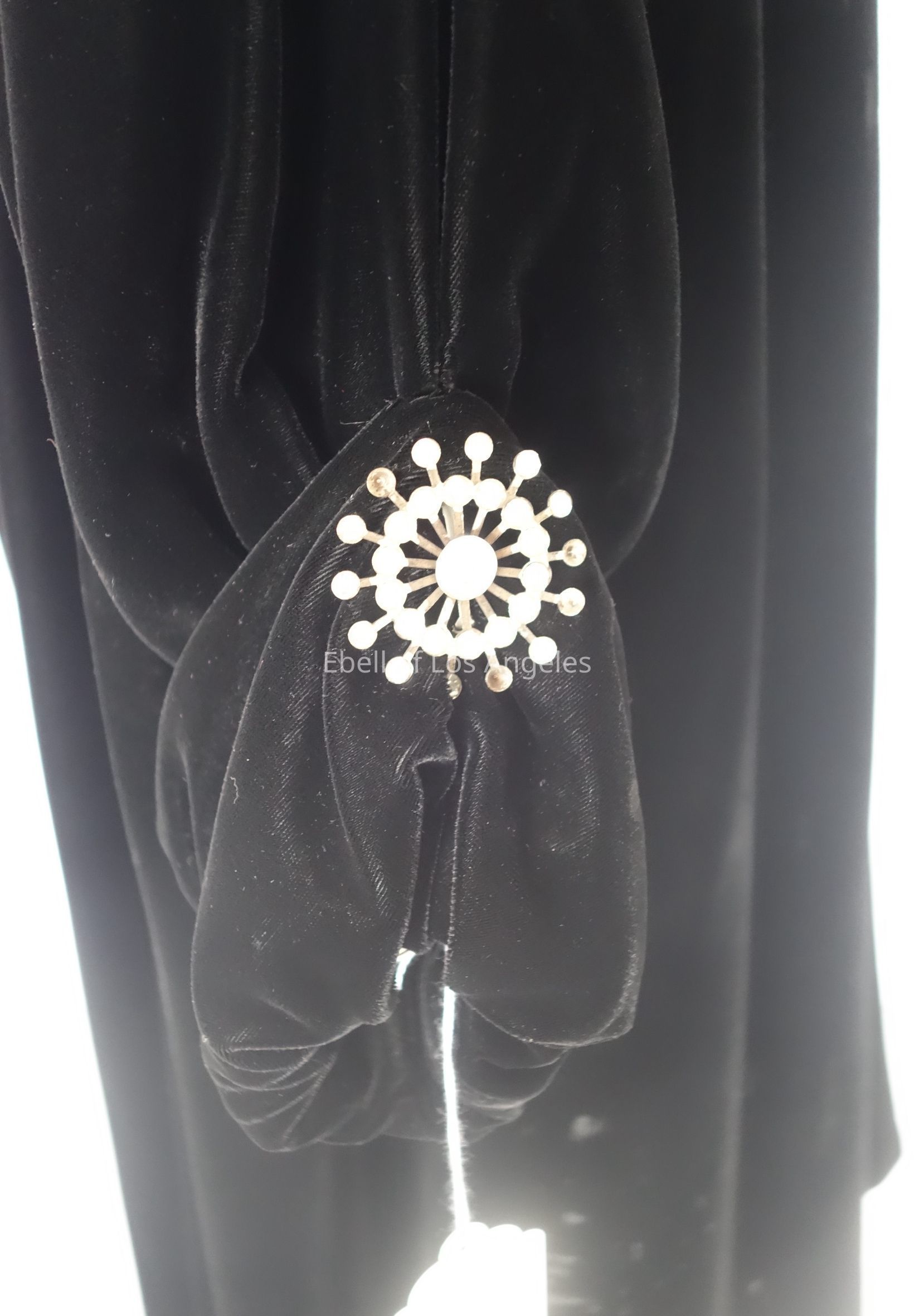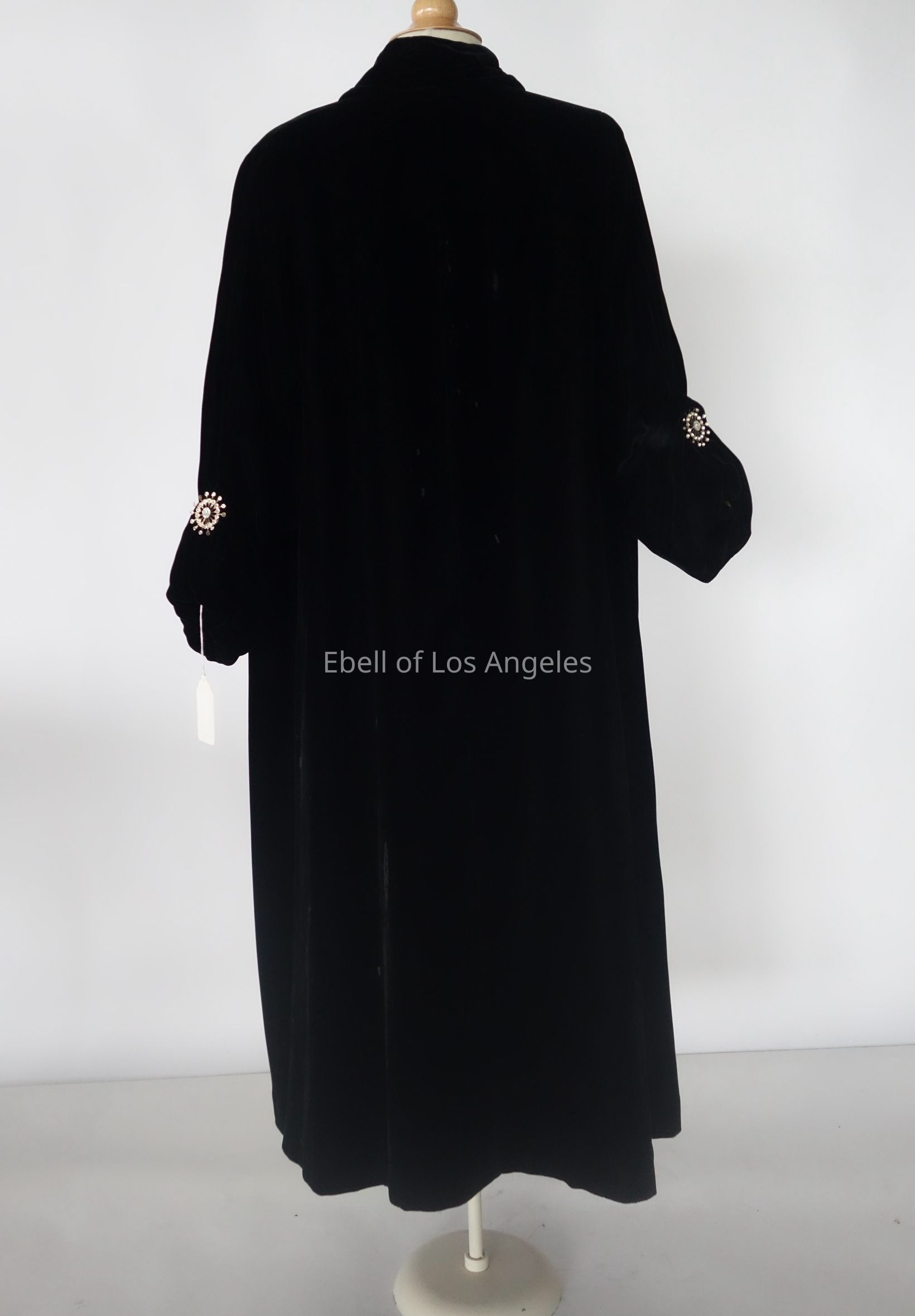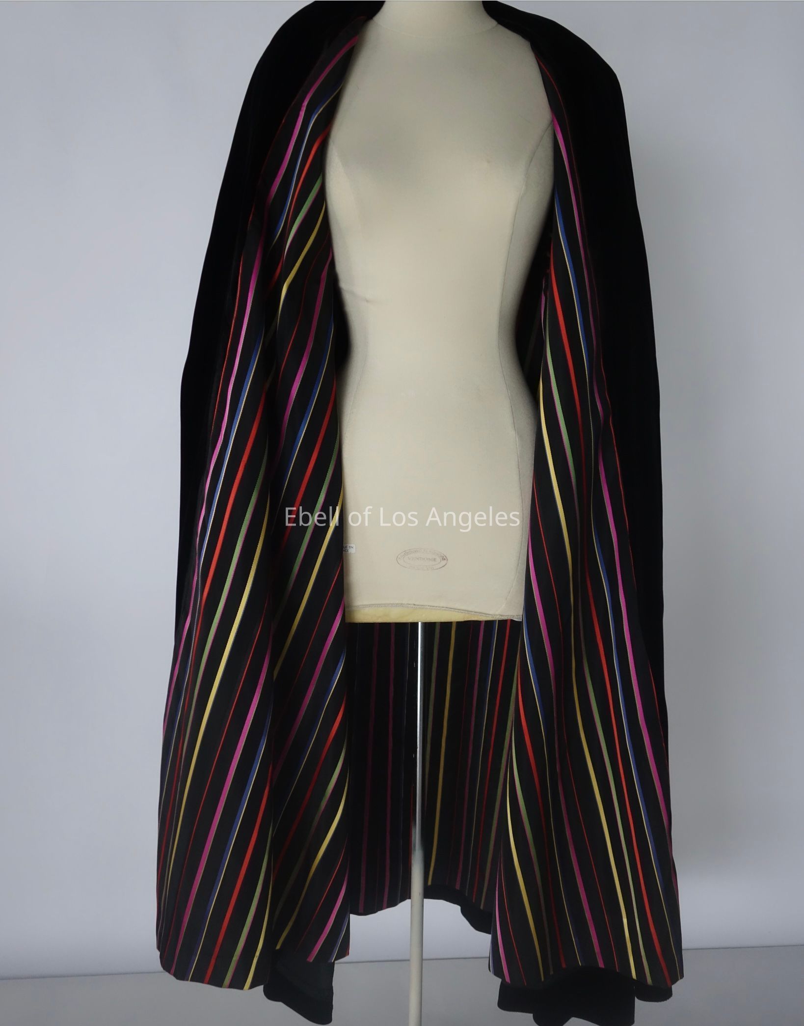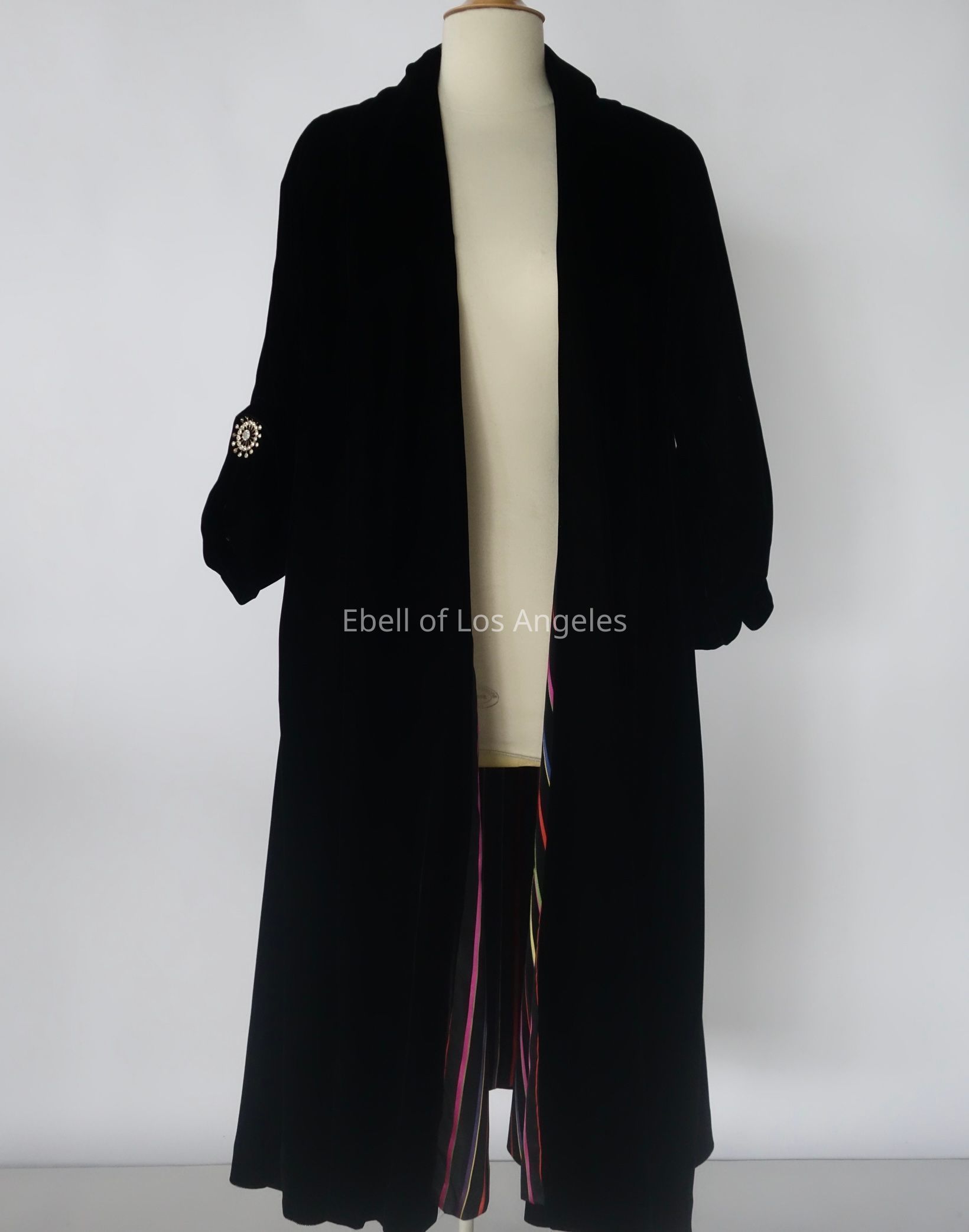 Velvet open front evening coat 3/4 sleeve with rhinestone clips at cuffs and multicolor striped silk liningEntry/Object ID