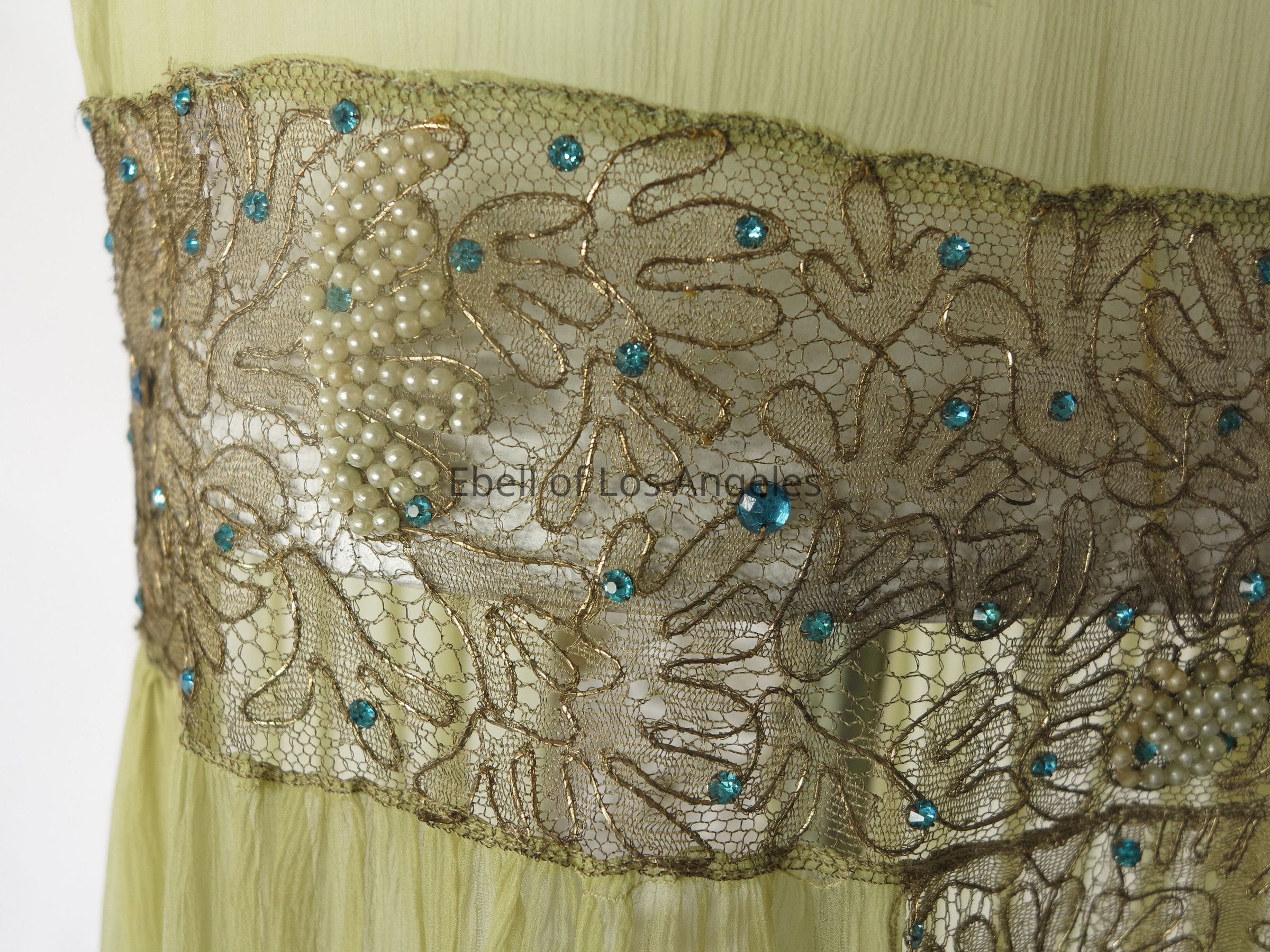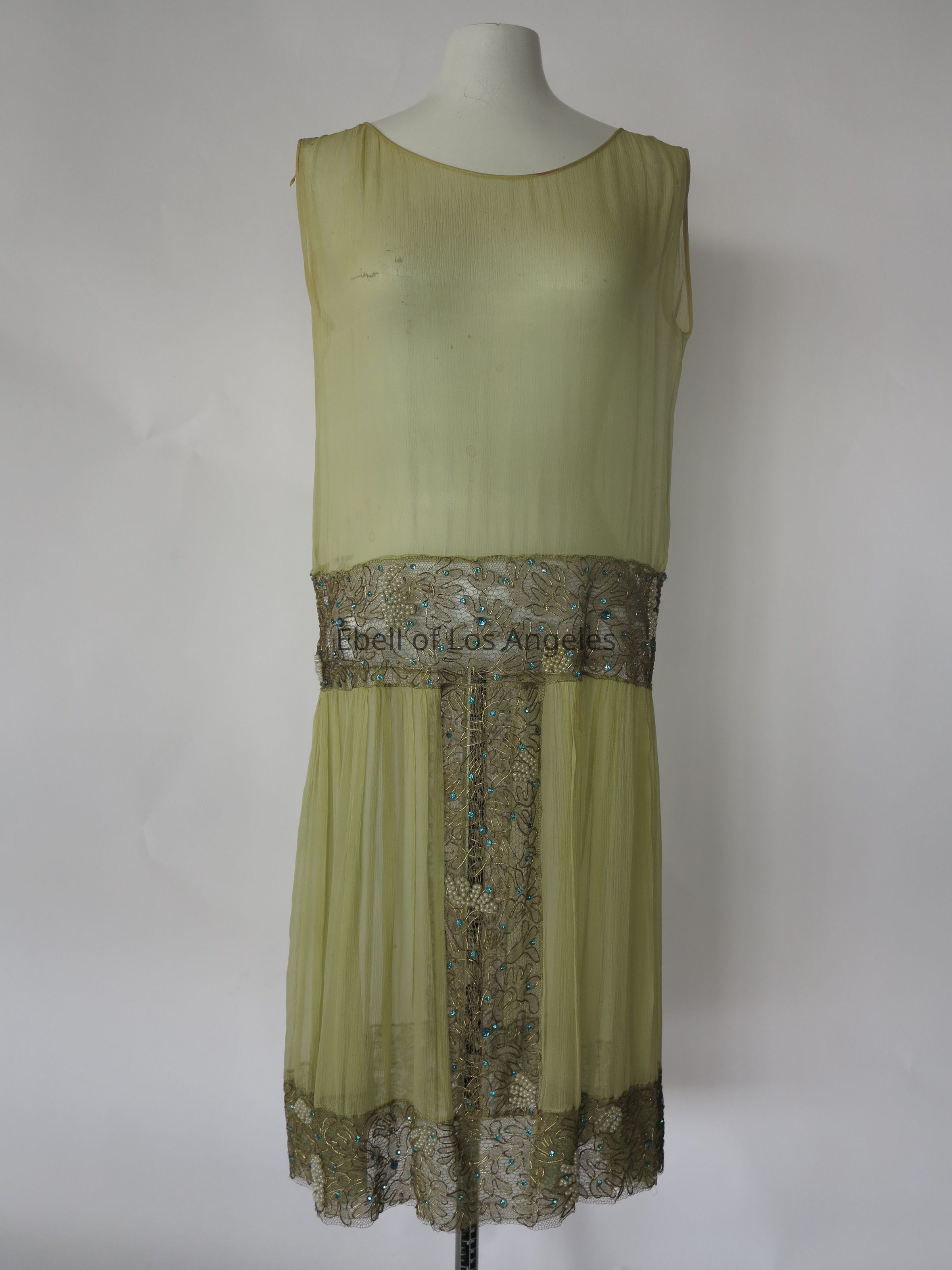 Sleeveless chiffon drop waist dress with embellished gold lace insets at waist, hem and center skirtCollection