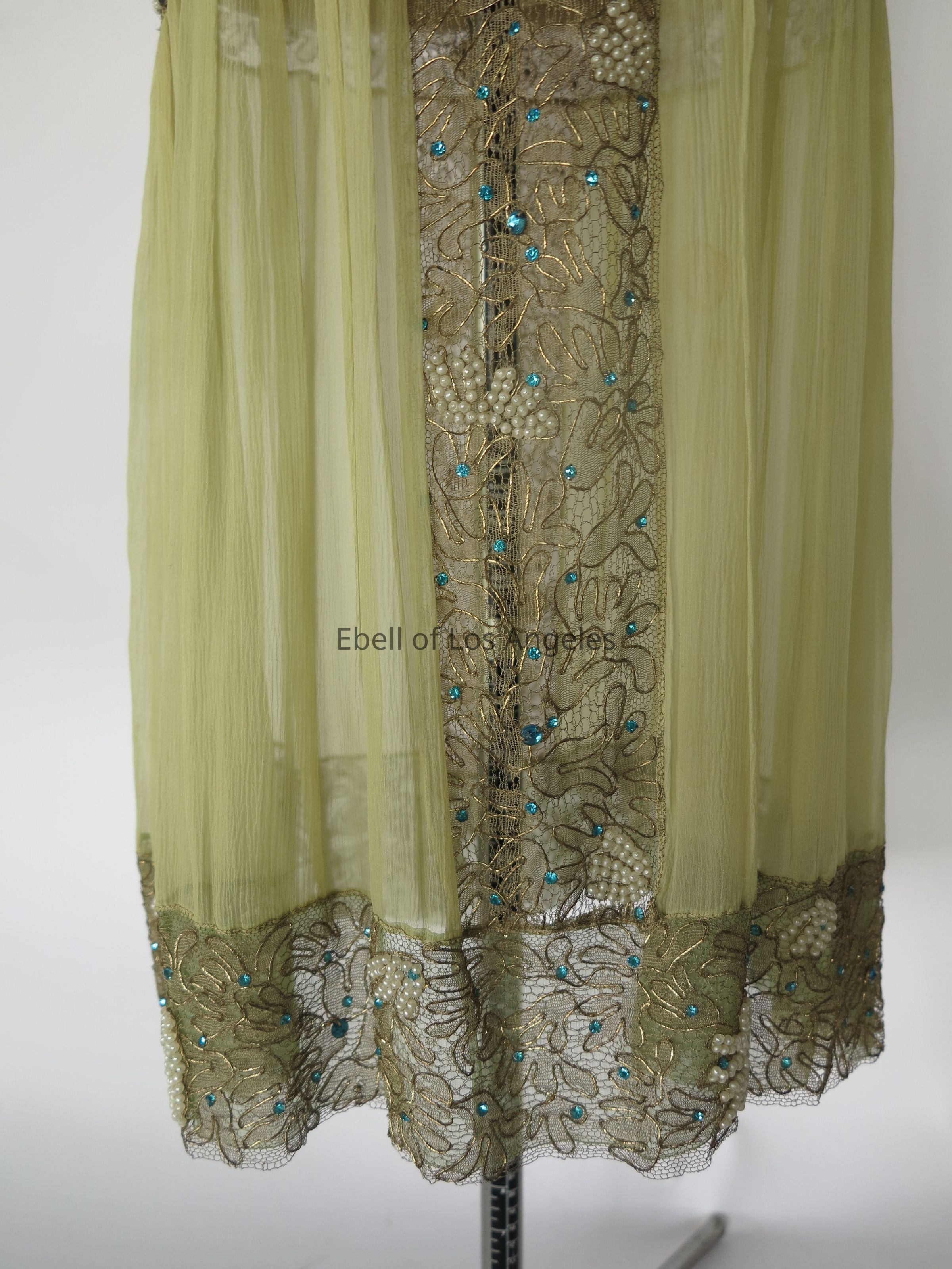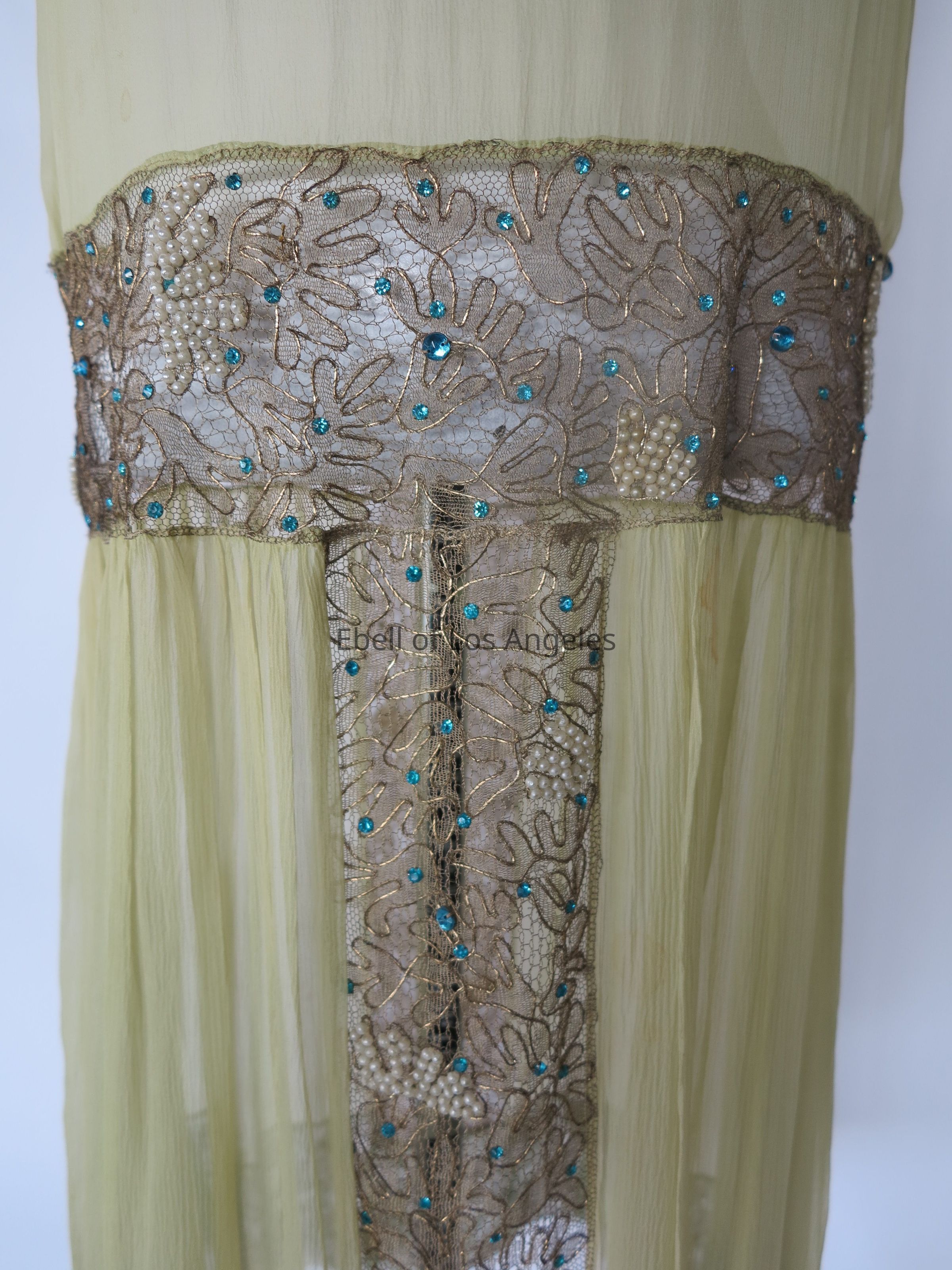 Sleeveless chiffon drop waist dress with embellished gold lace insets at waist, hem and center skirtEntry/Object ID