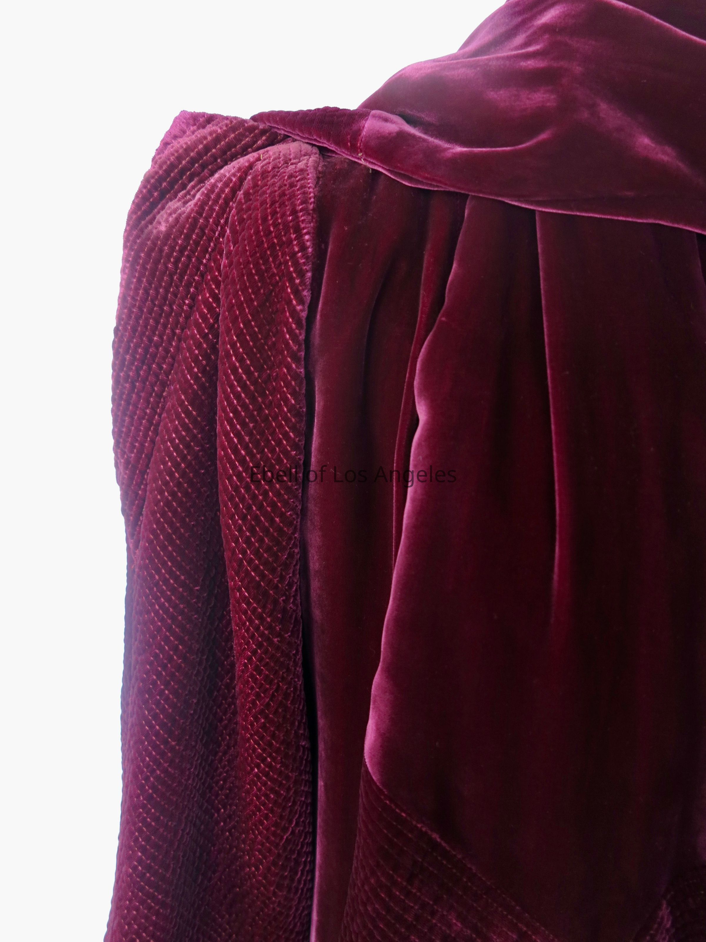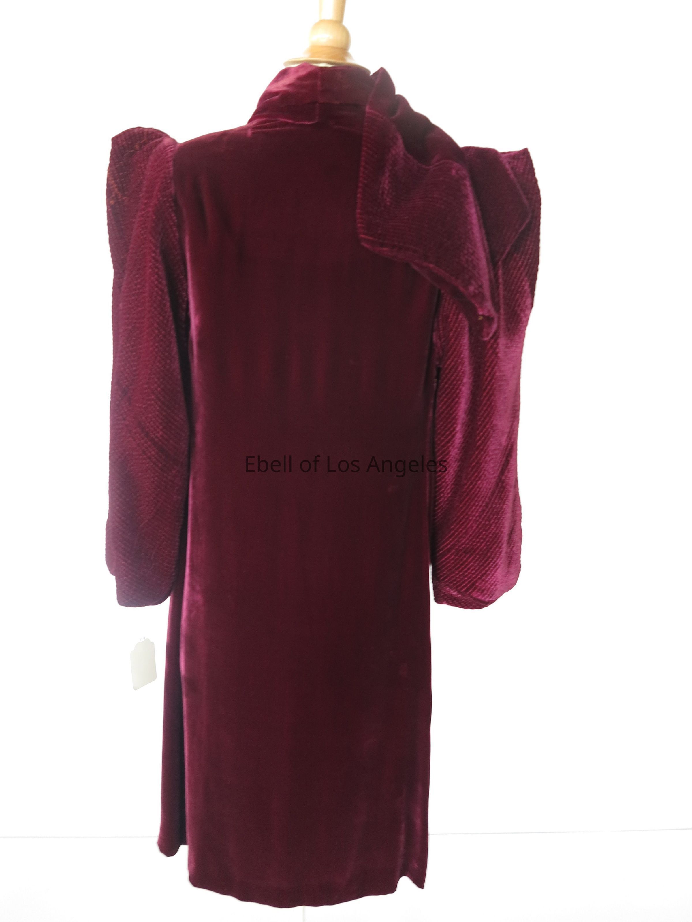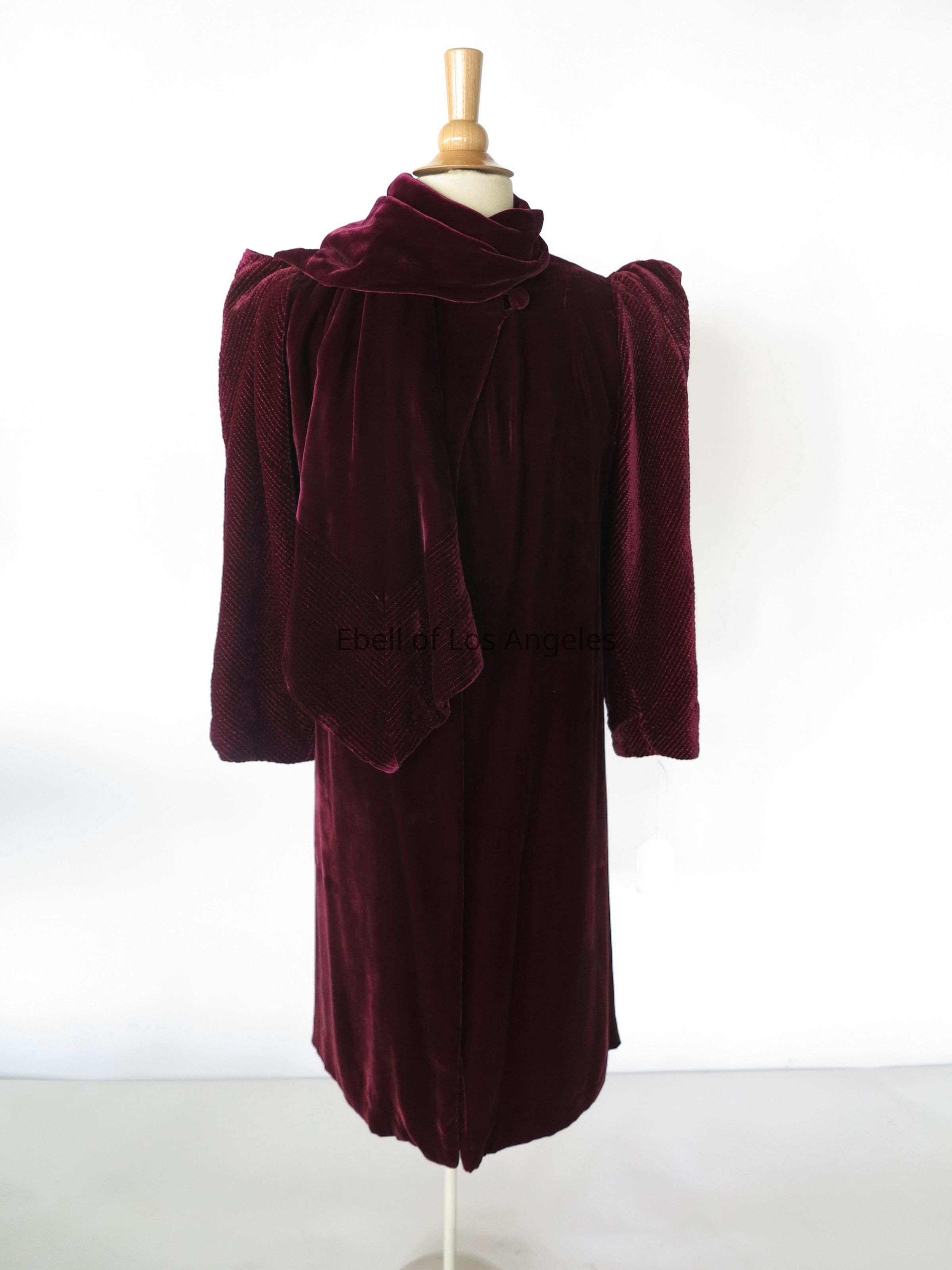 Velvet short evening coat with ornamental stitching on sleeves and attached self fabric neck scarfEntry/Object ID
