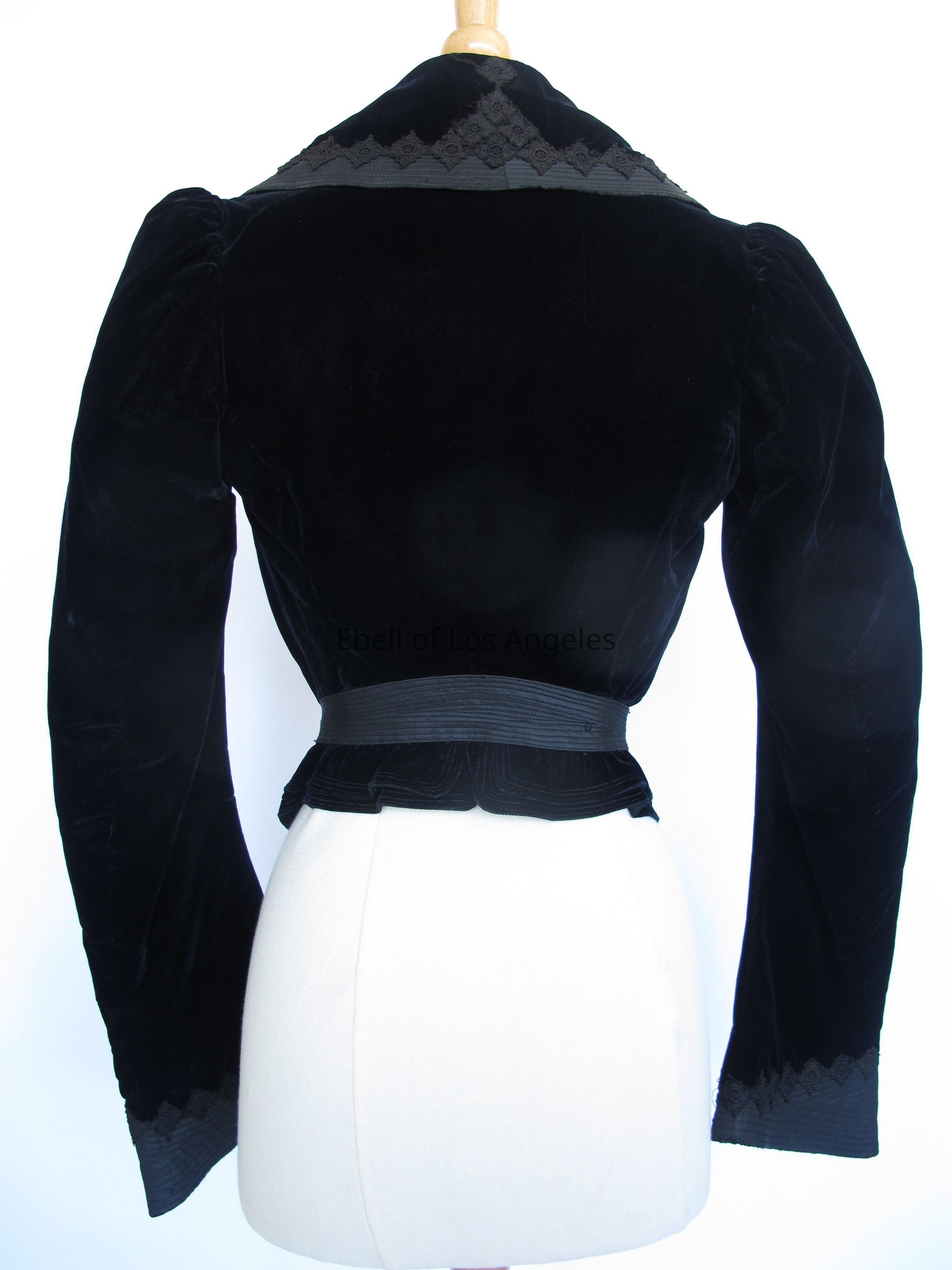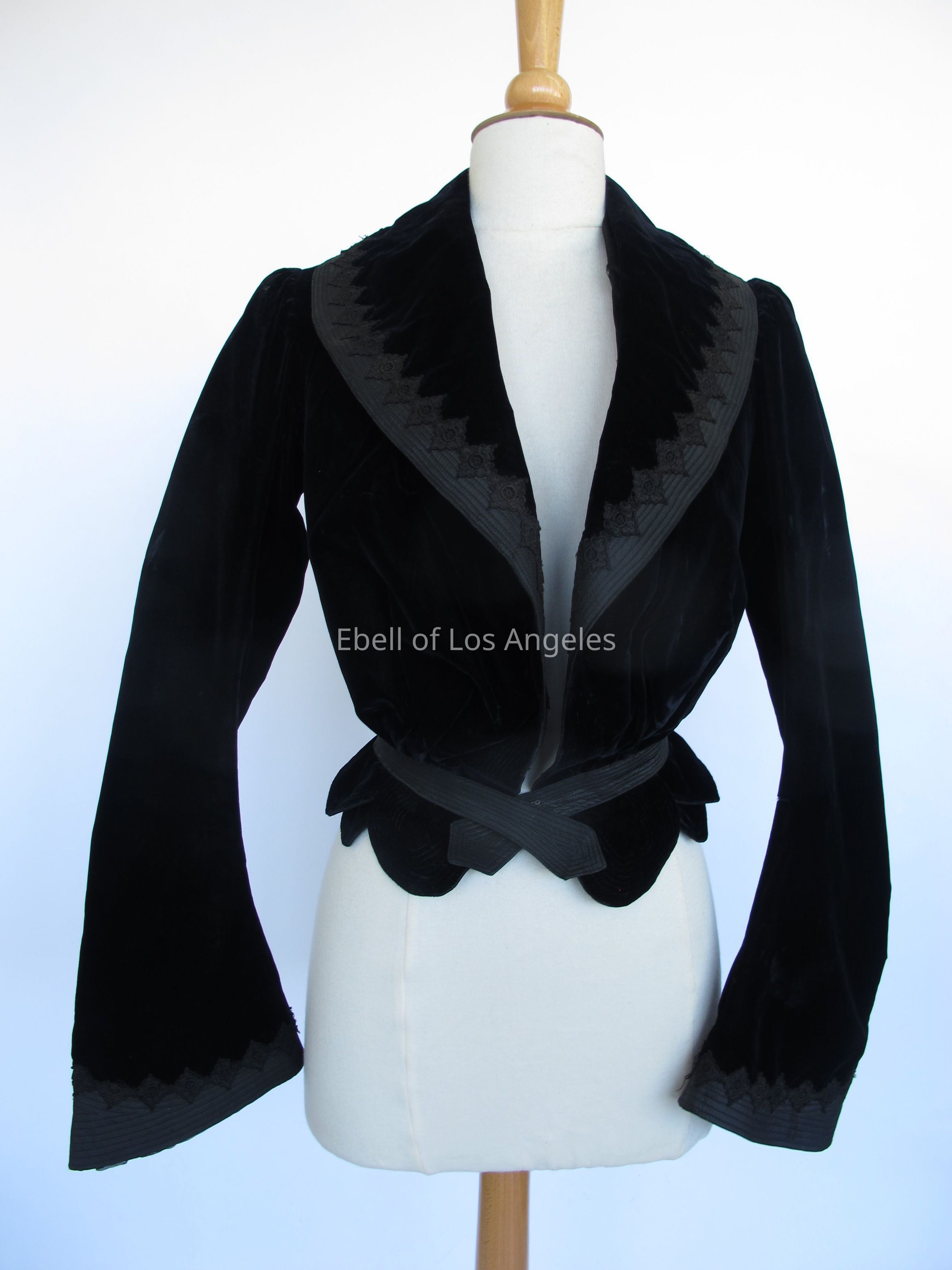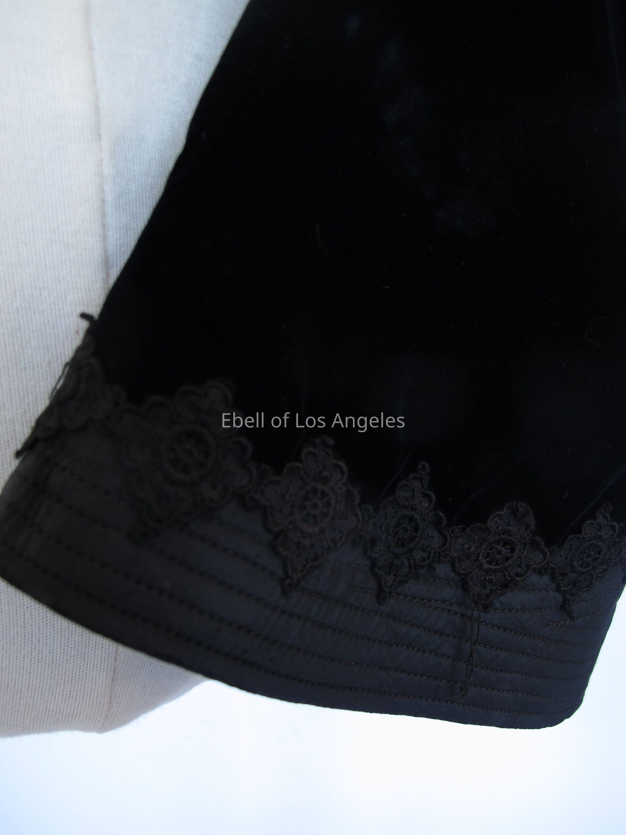 Velvet short belted peplum jacket with stitched silk and lace trim on shawl collar and sleeve