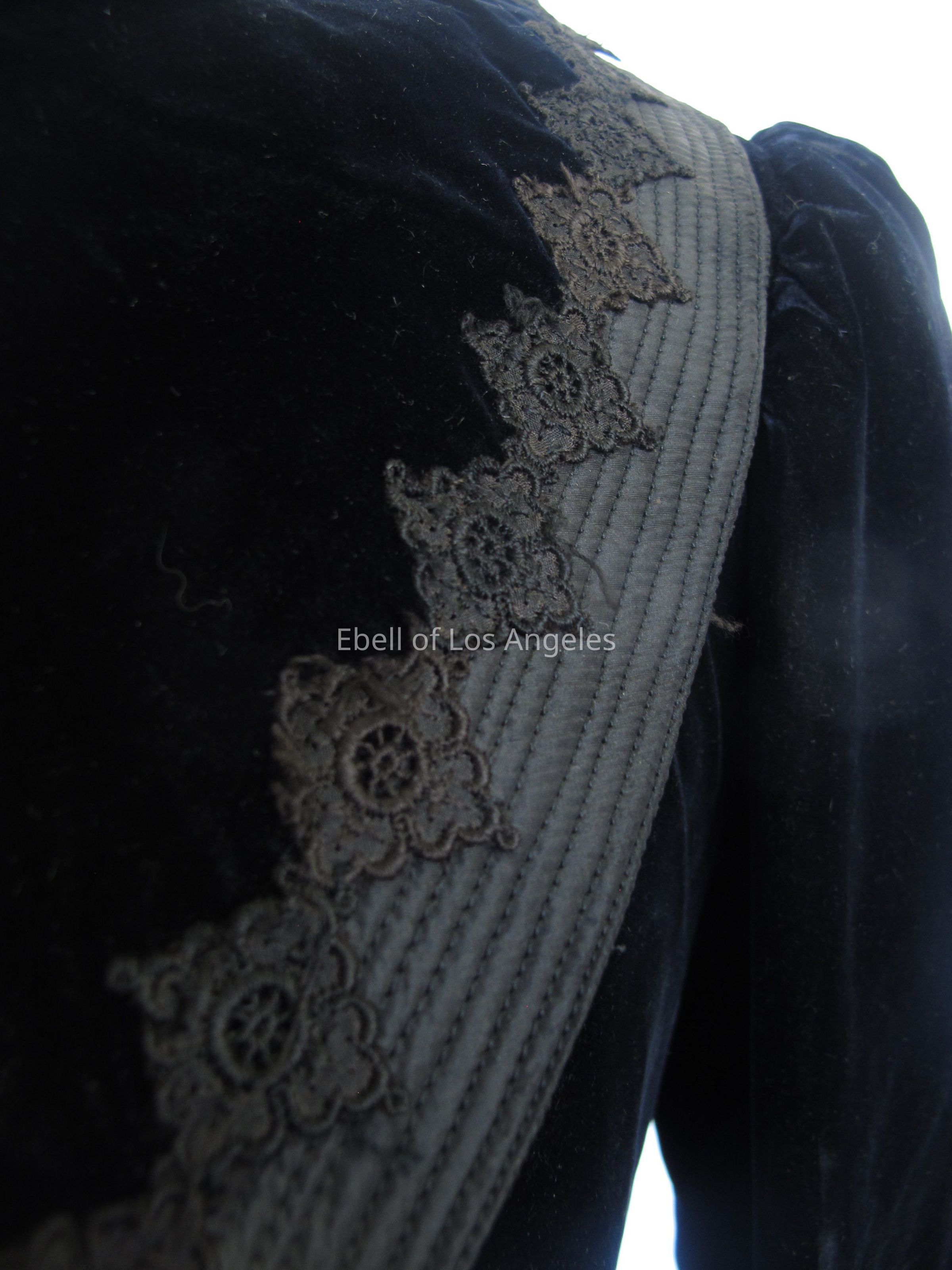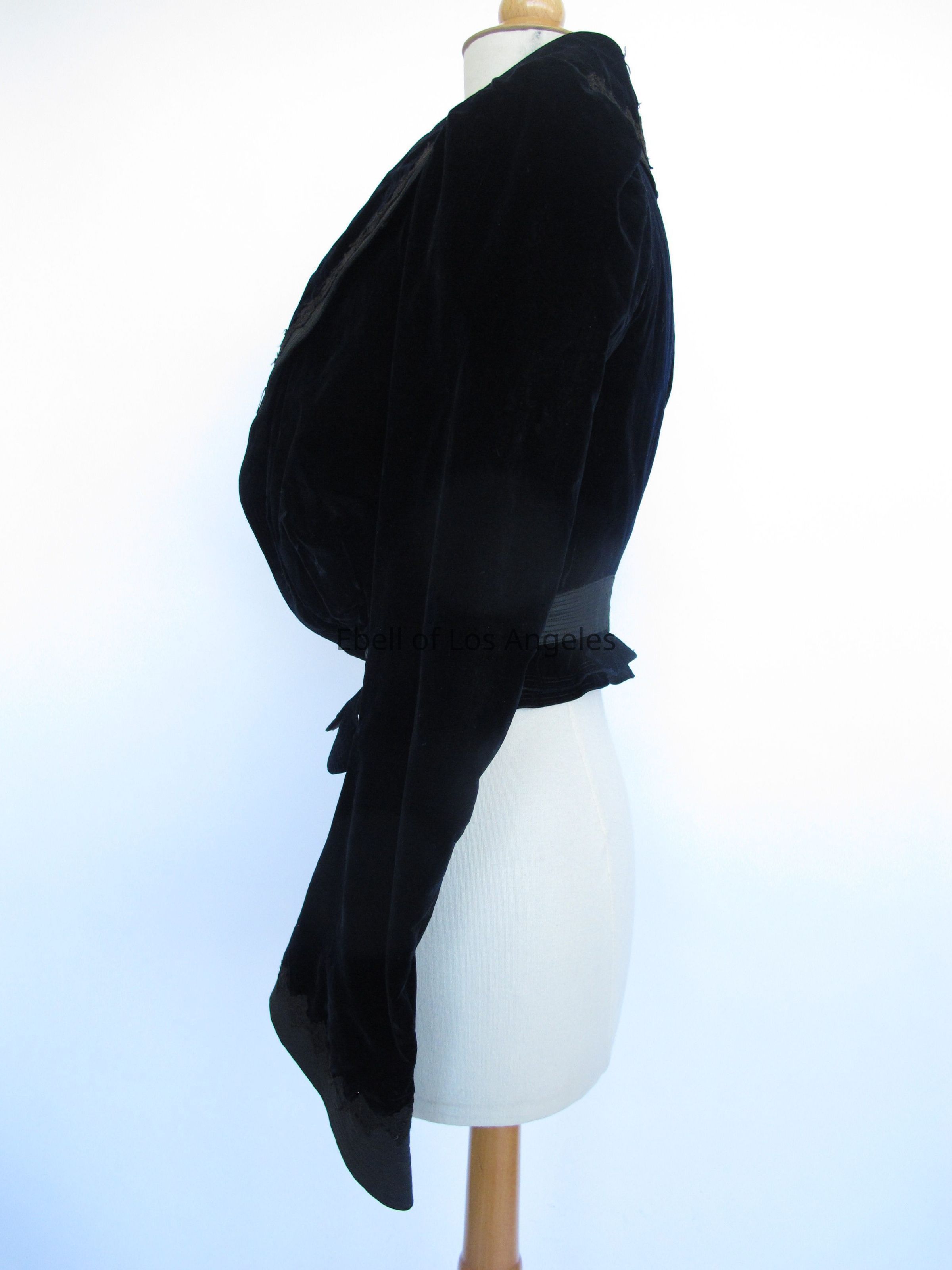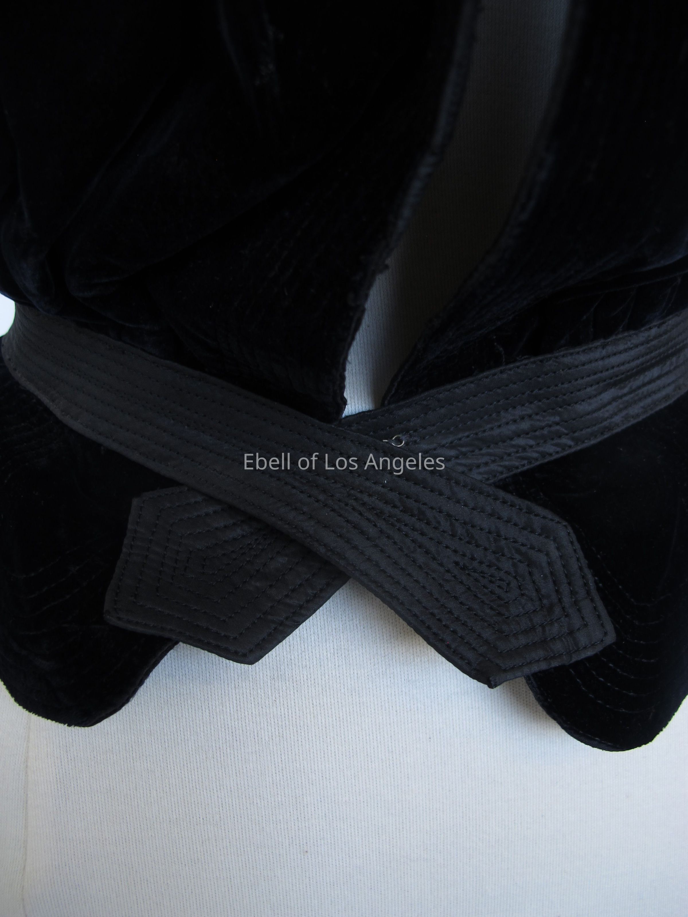 Velvet short belted peplum jacket with stitched silk and lace trim on shawl collar and sleeve