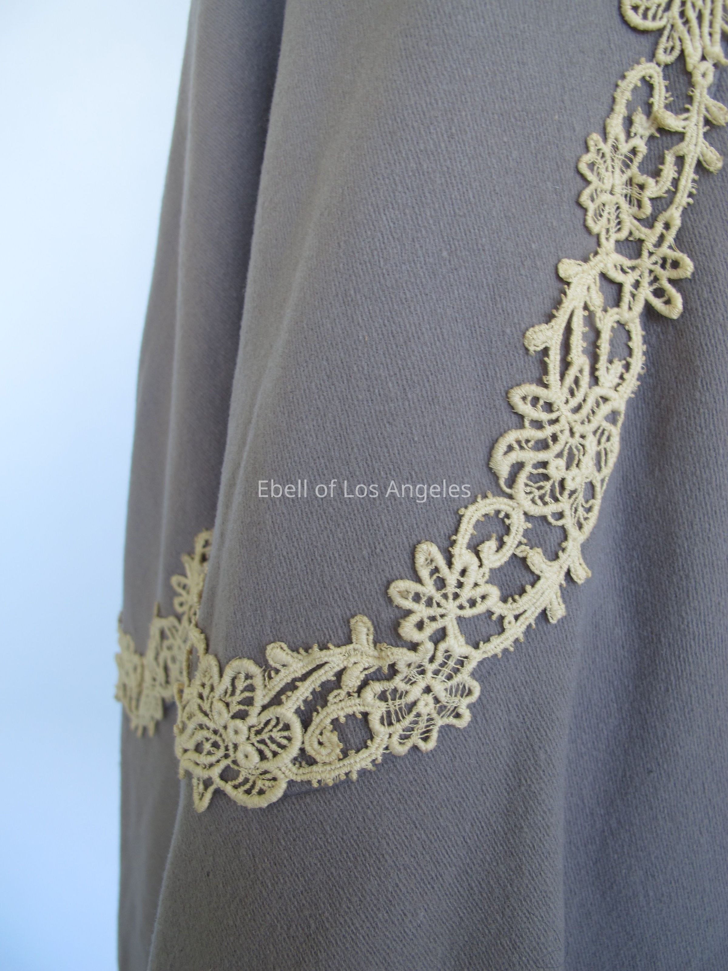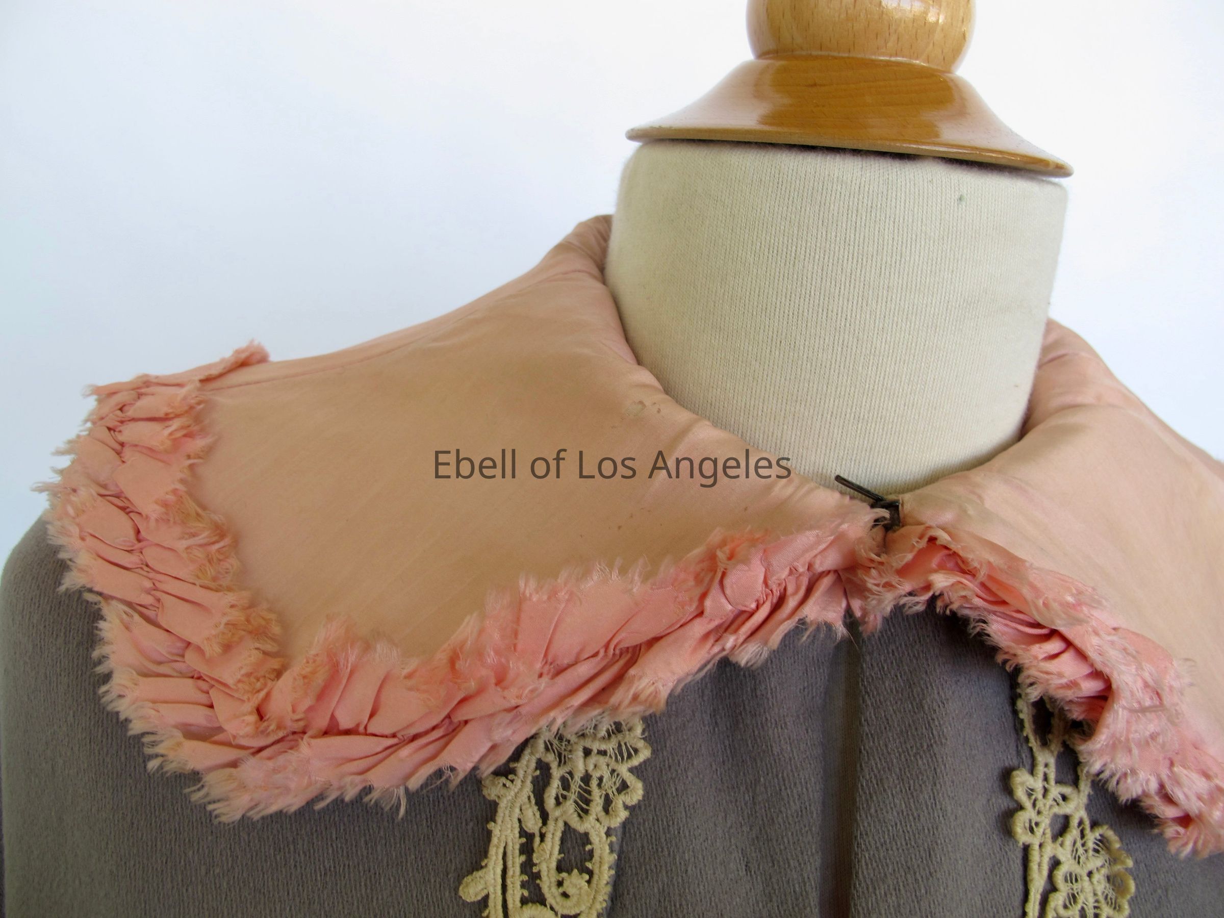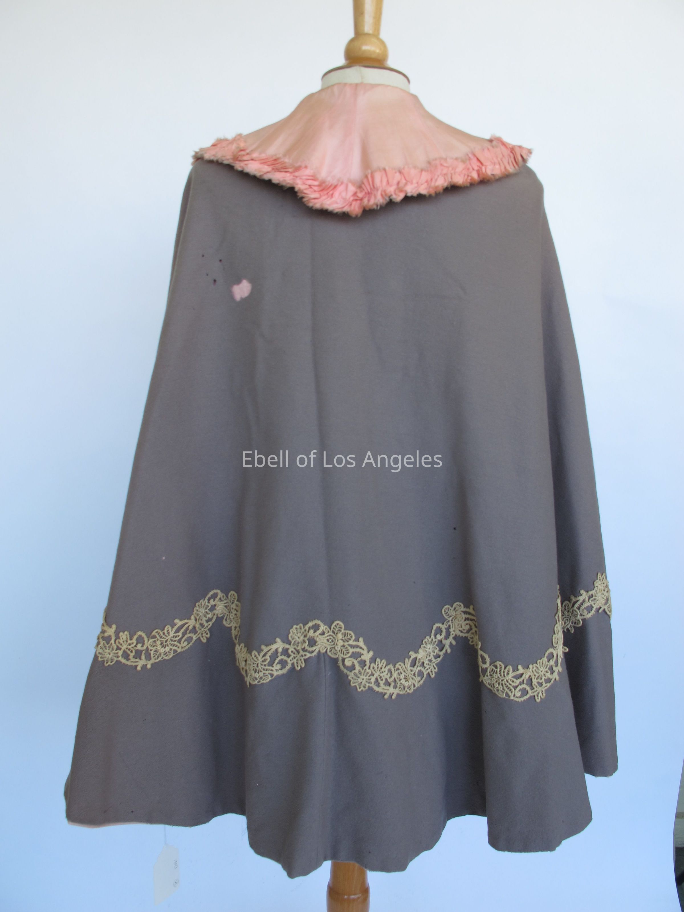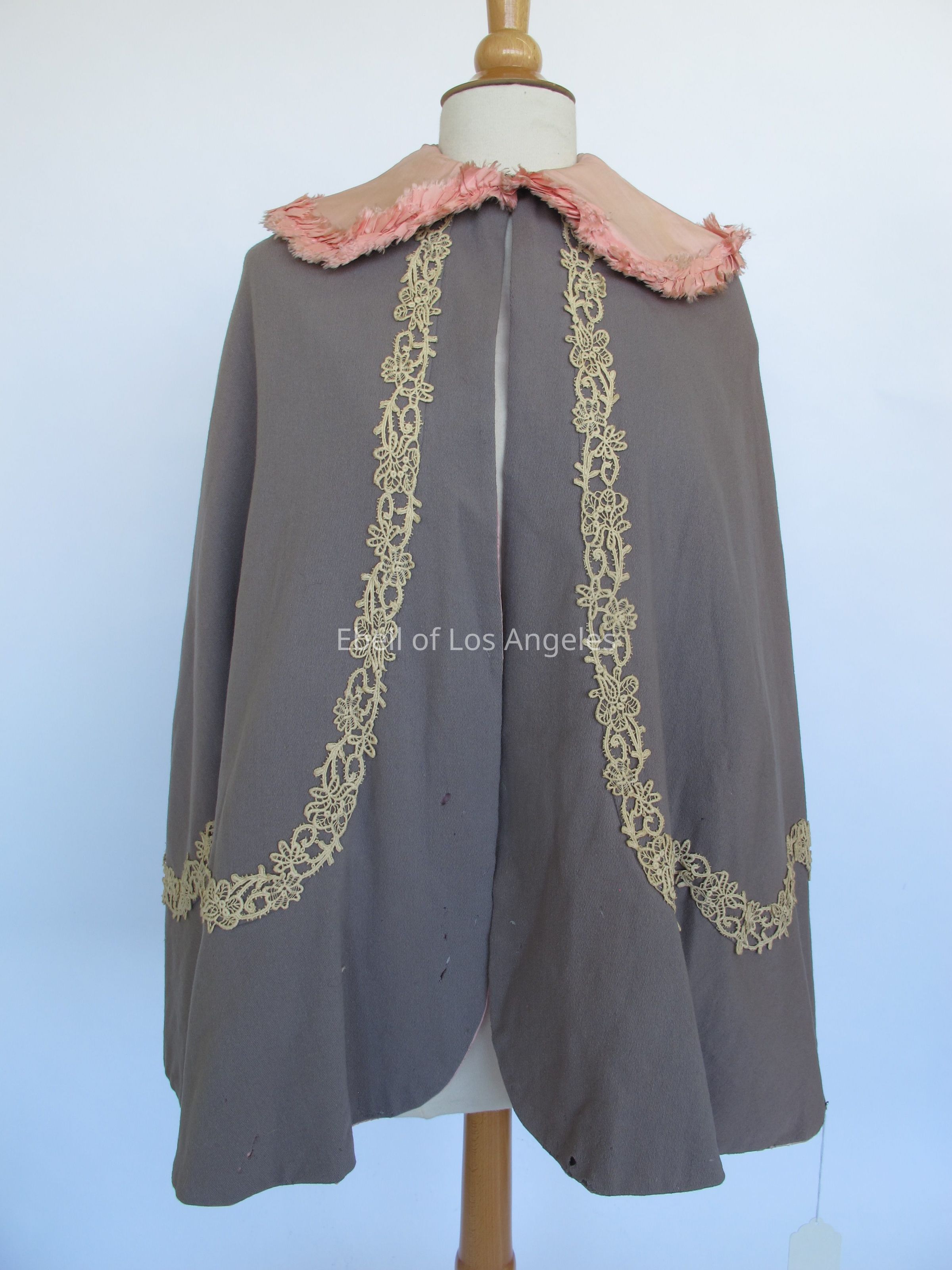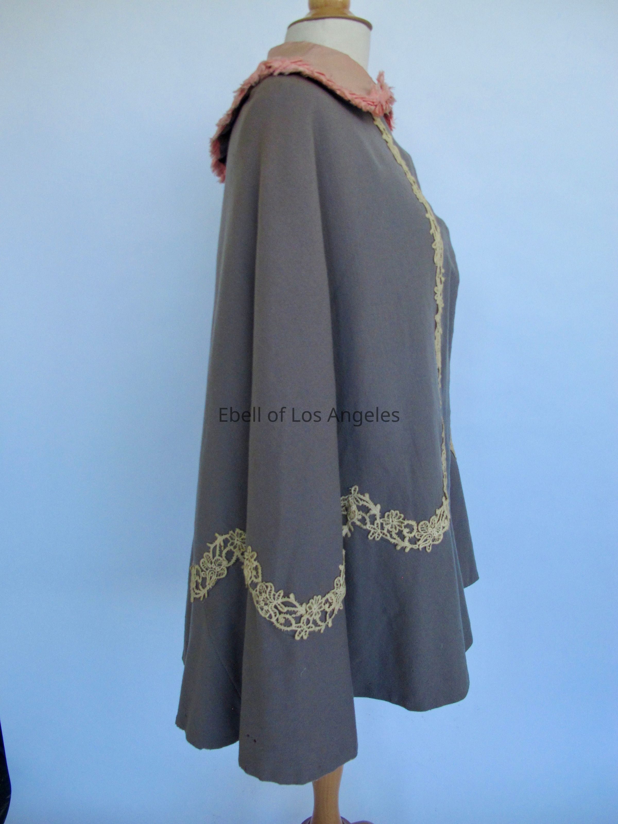 Wool cape with pink silk collar and cream lace trim