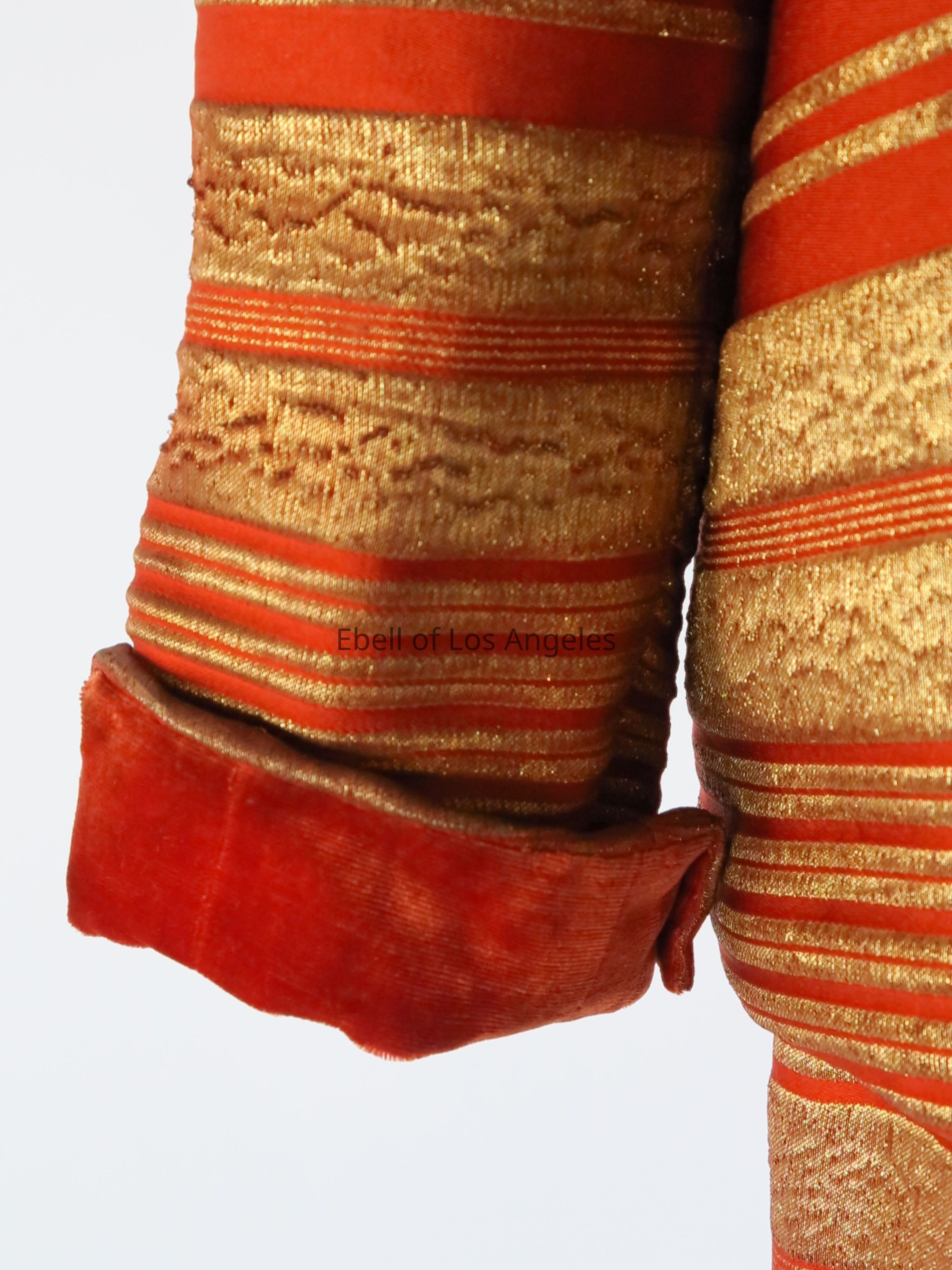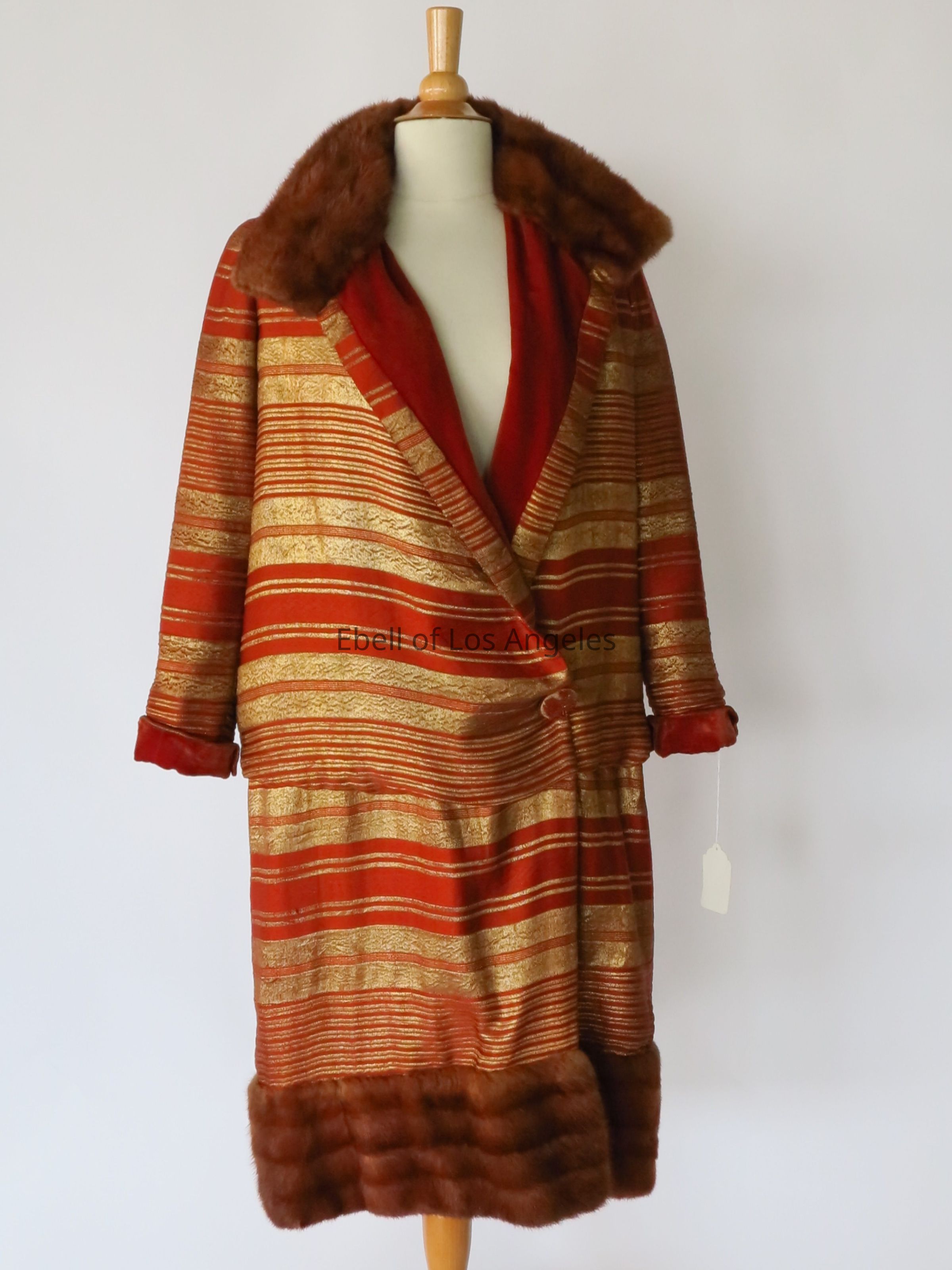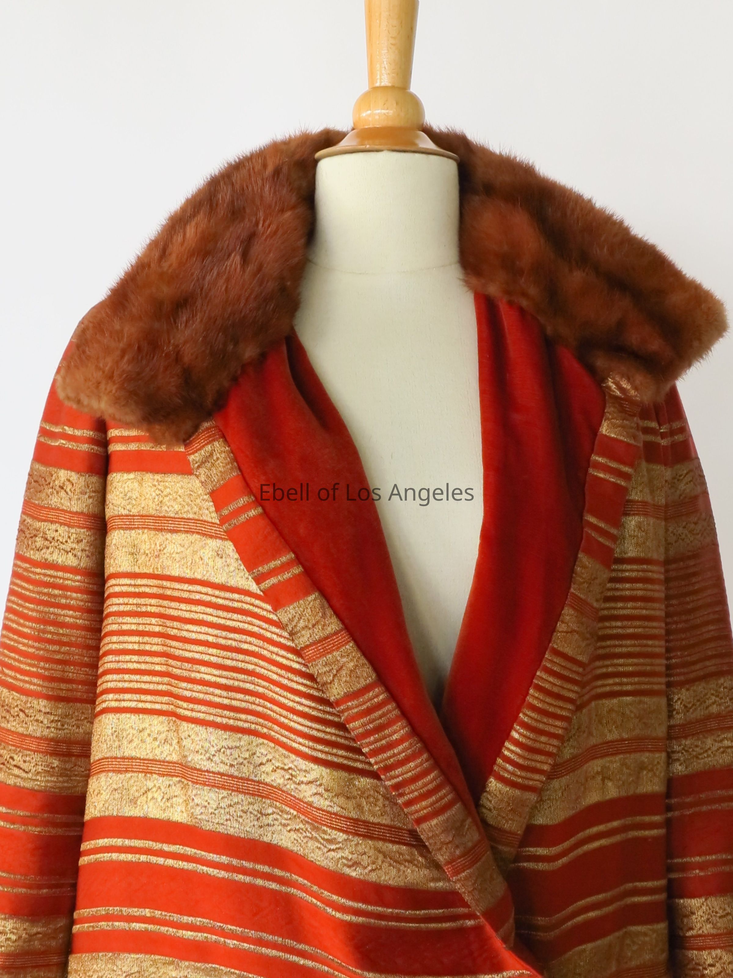 Wrap horizontal stripe brocade evening coat with fur trim and one button closureEntry/Object ID