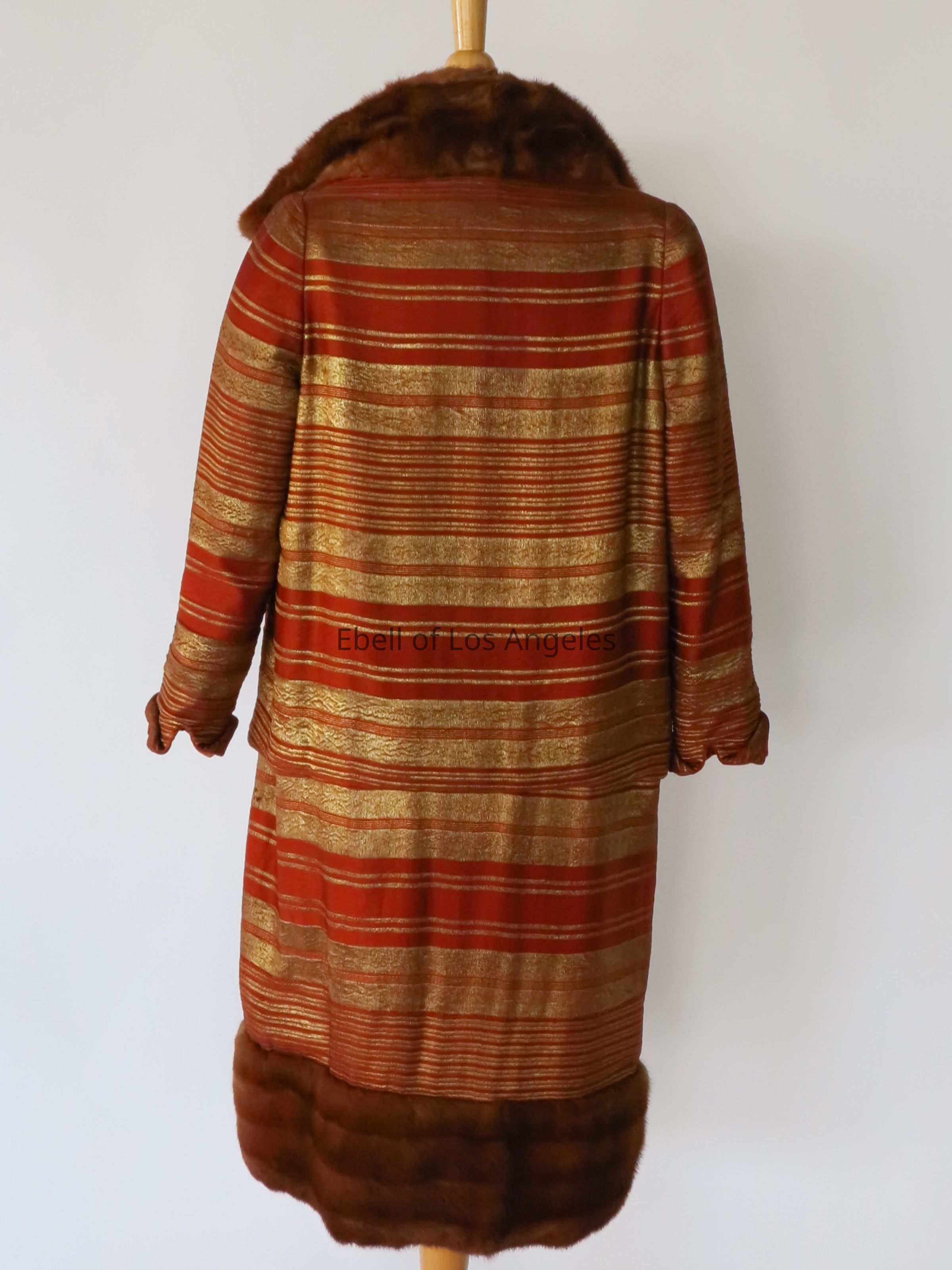 Wrap horizontal stripe brocade evening coat with fur trim and one button closureCollection