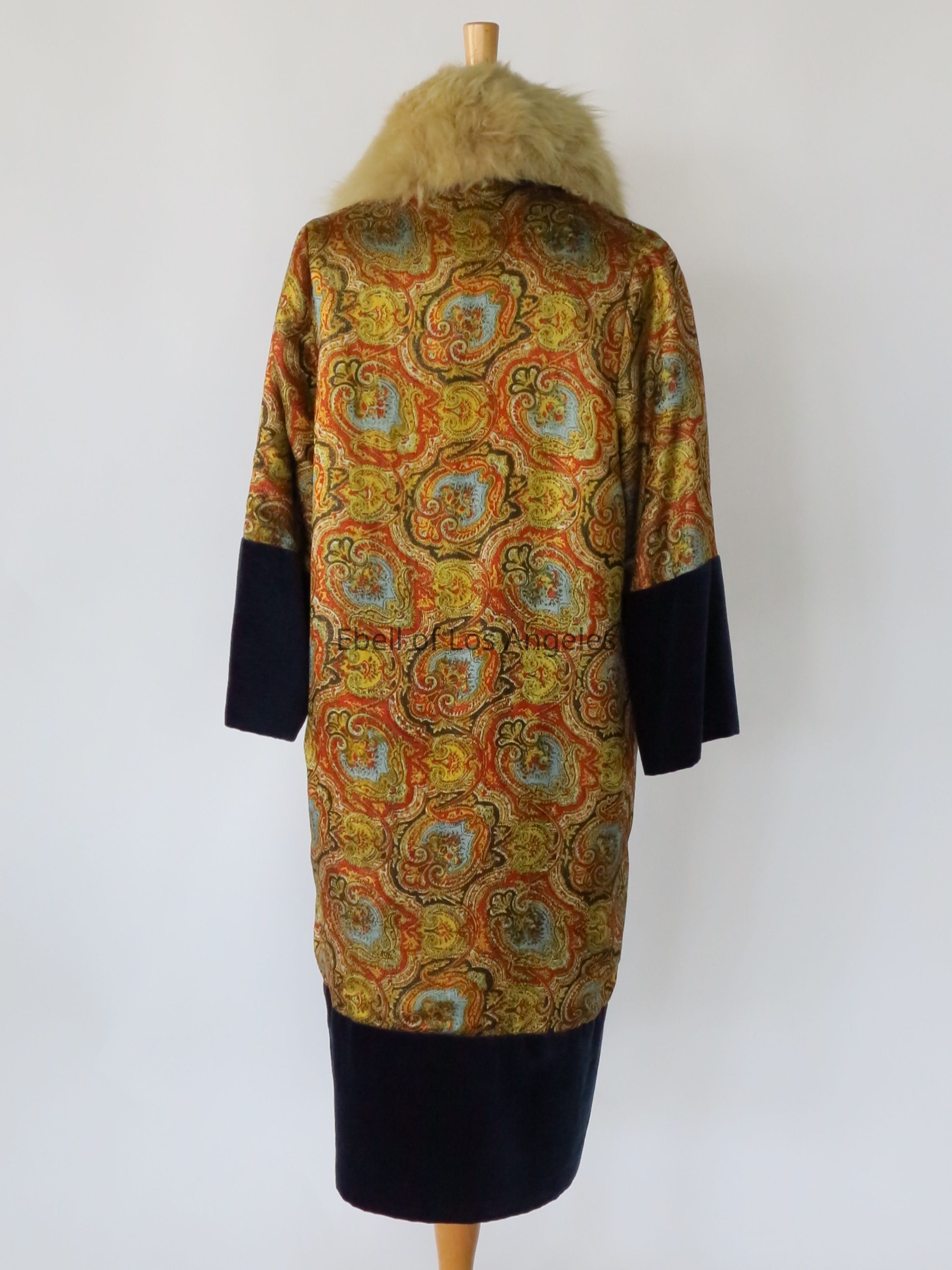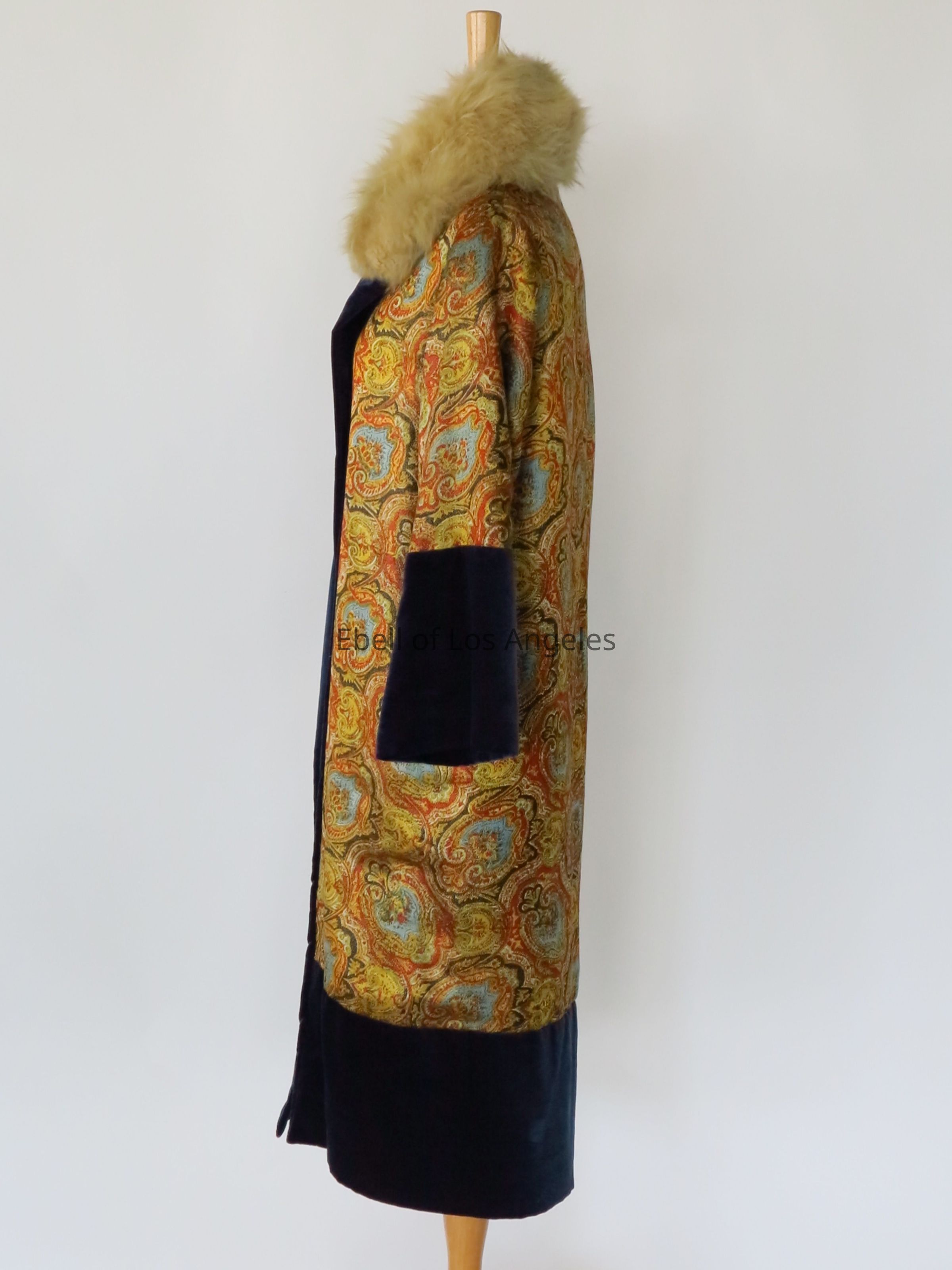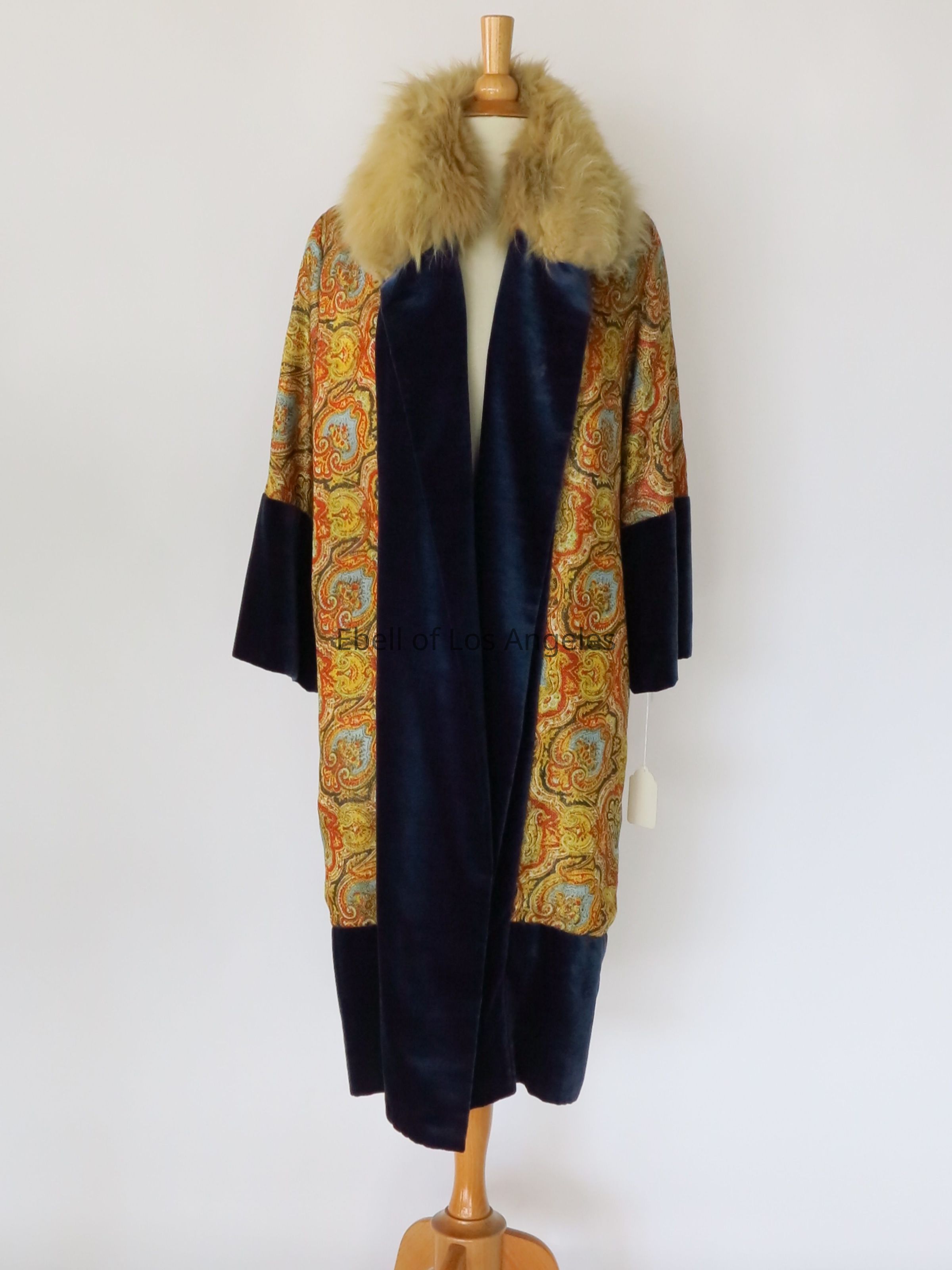 Multi-colored brocade evening coat with velvet cuffs and panels with fur collarEntry/Object ID