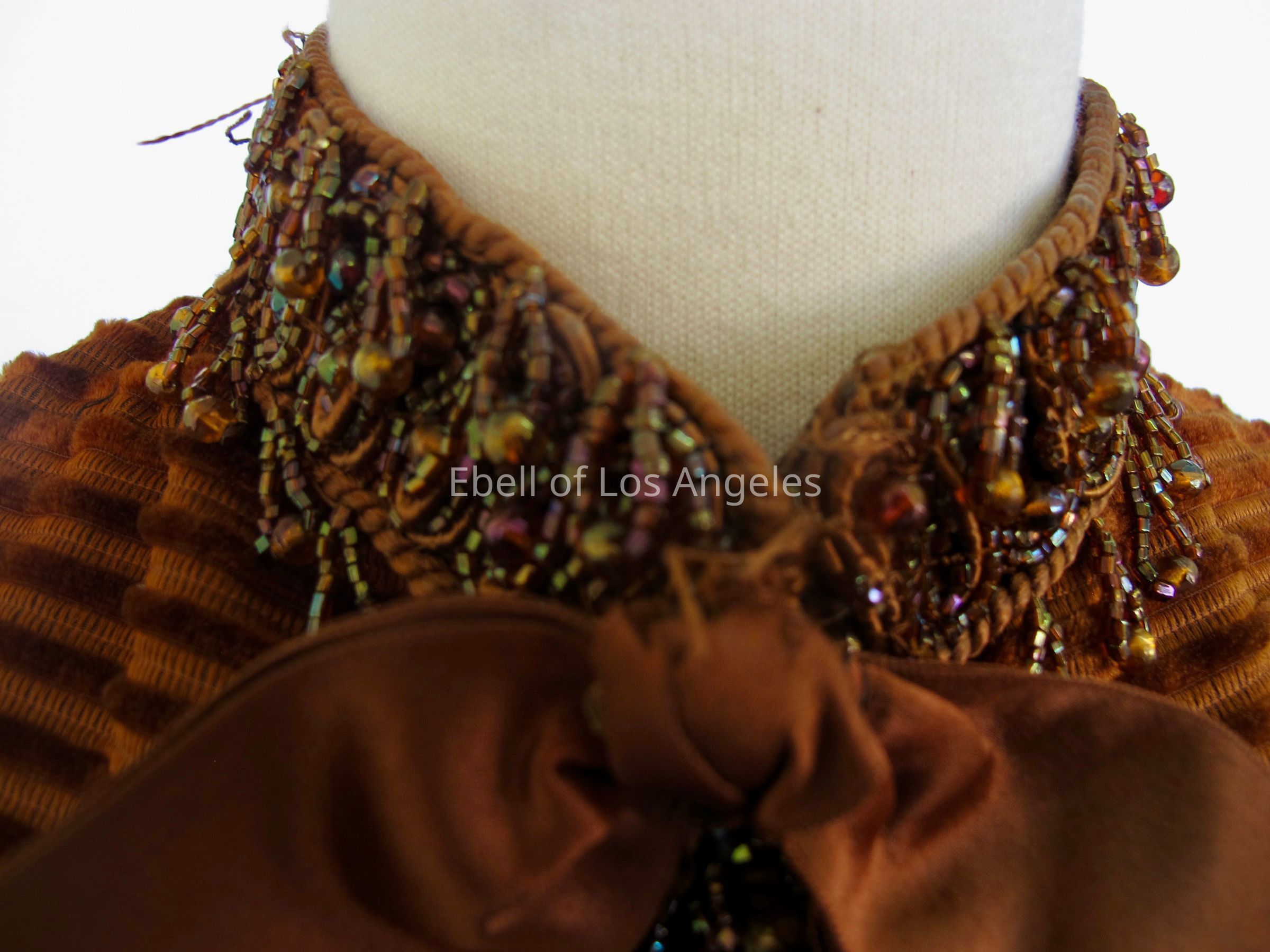 Hook front velvet and corduroy cape with bead embellishment and bowsCollection