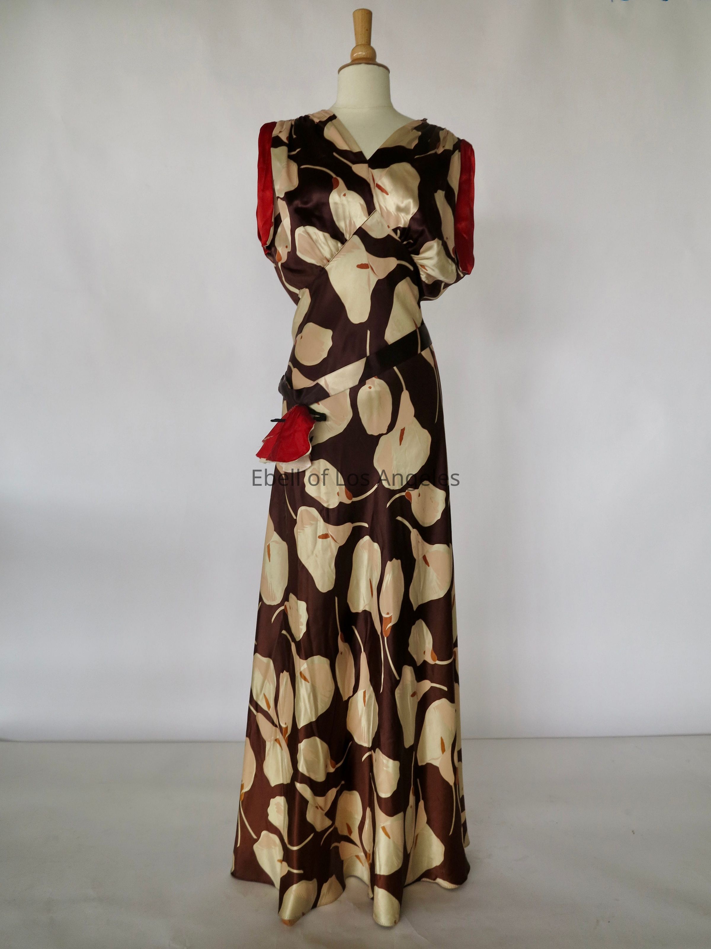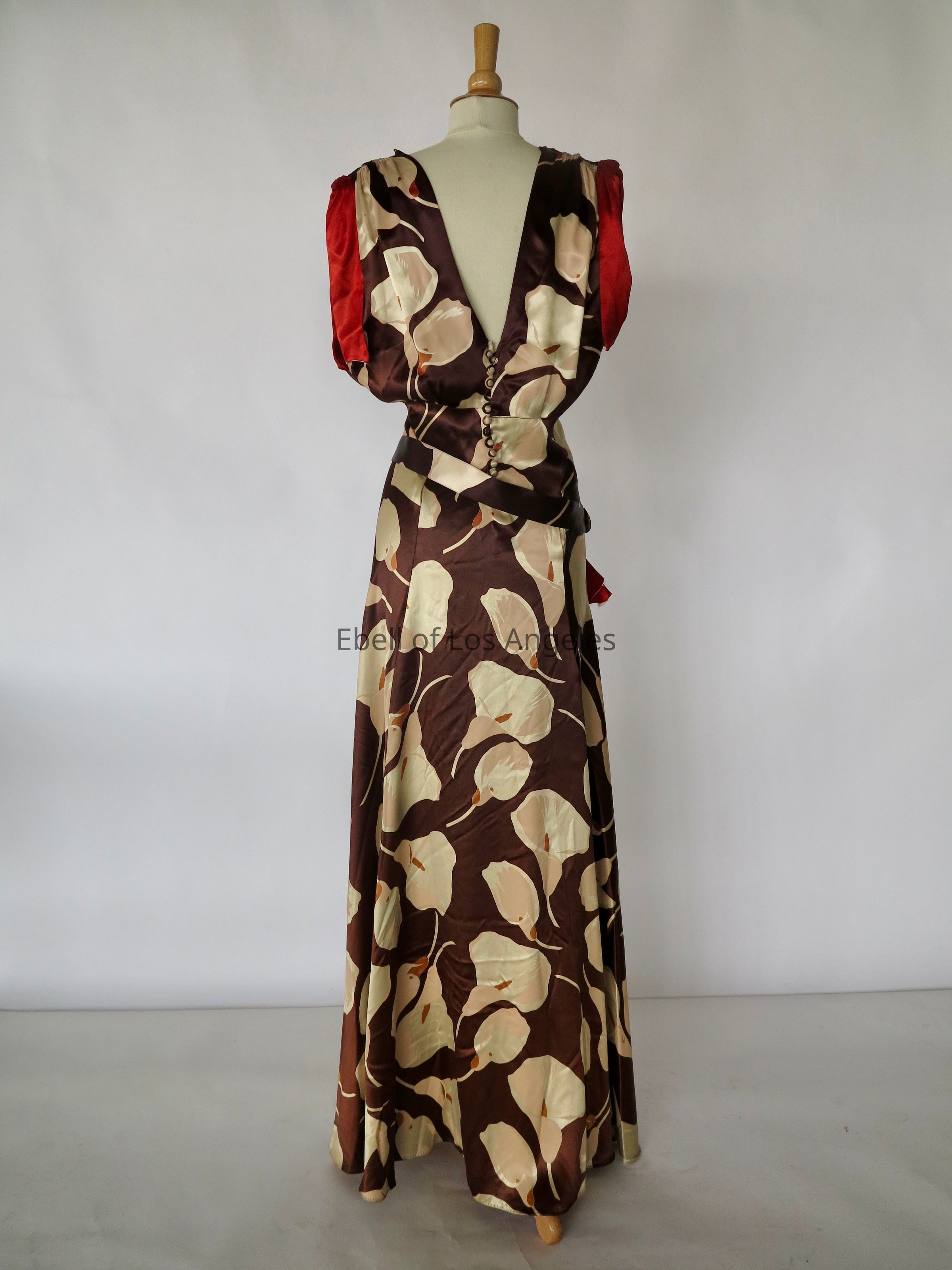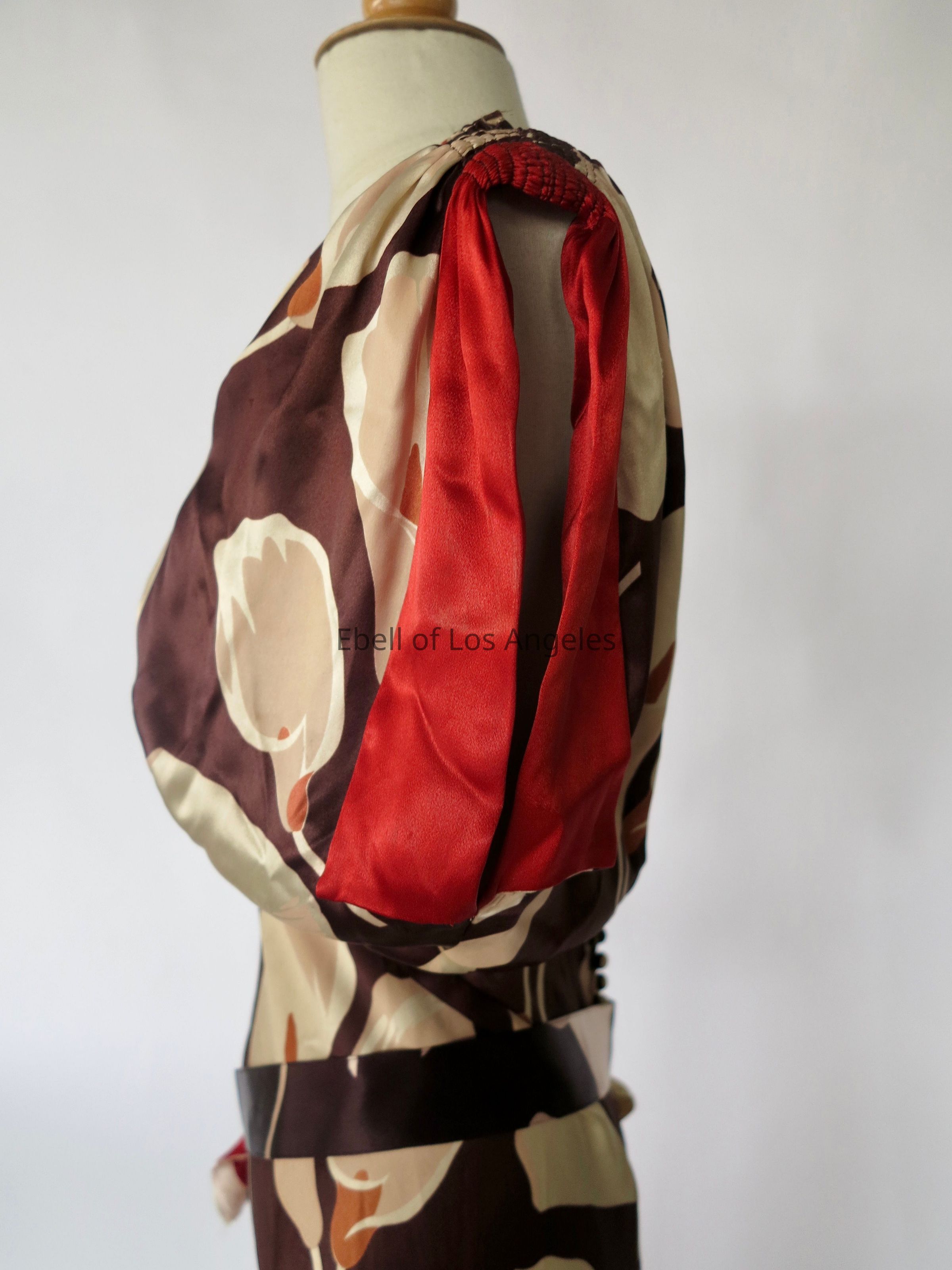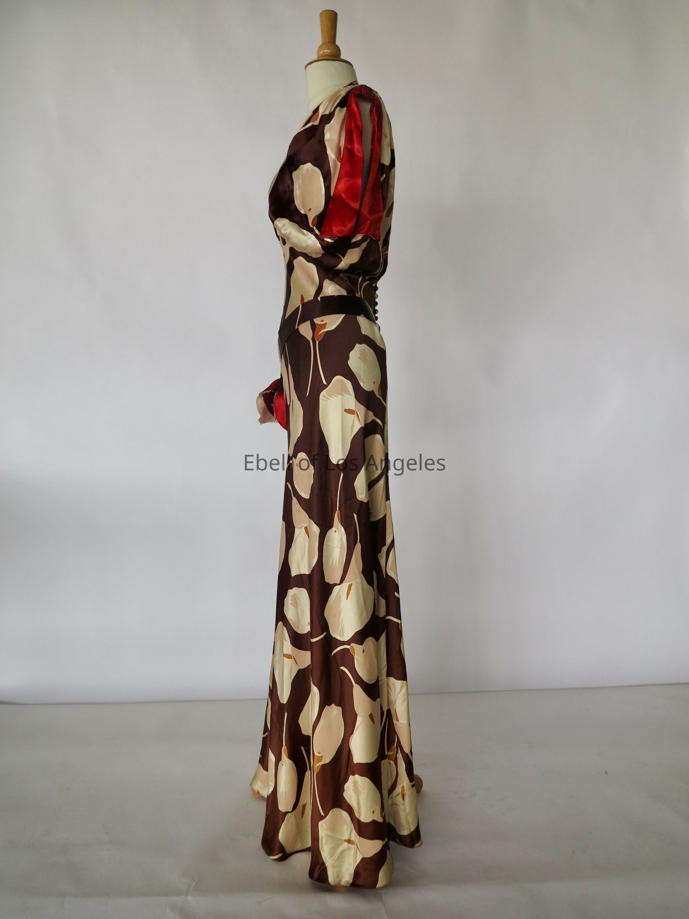 V neck bias long calla lily printed dress with self belt and red cuffs on sleeve openingCollection