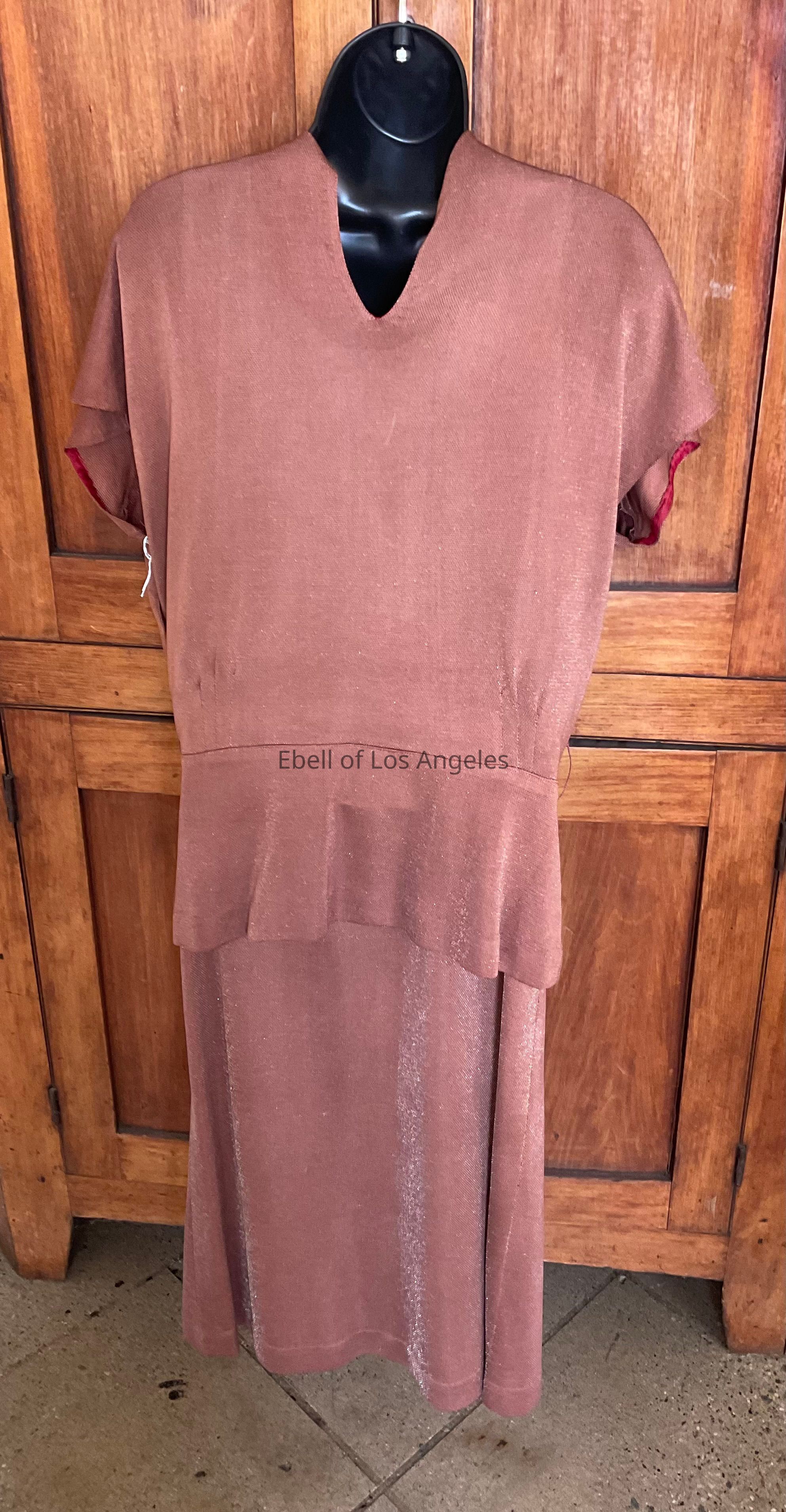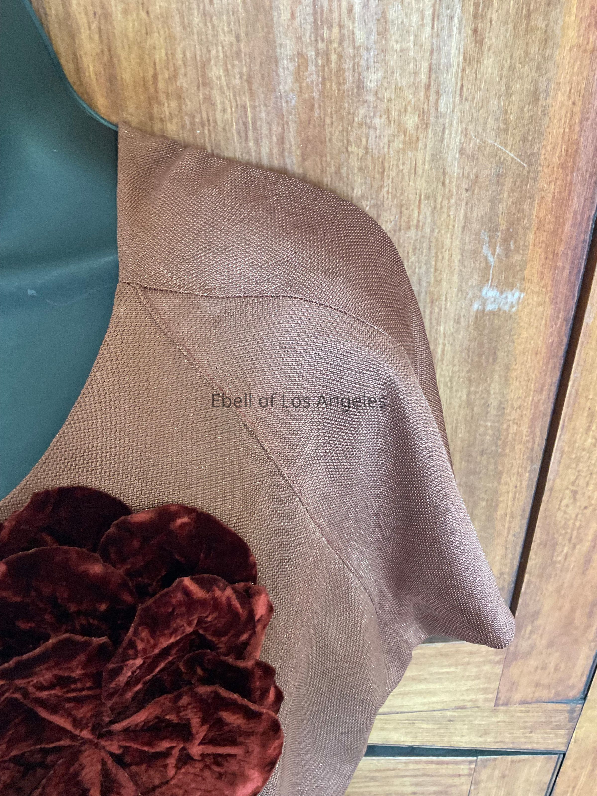 Two piece metallic brown dress with velvet flower consisting of blouson over slip dress with self skirt
