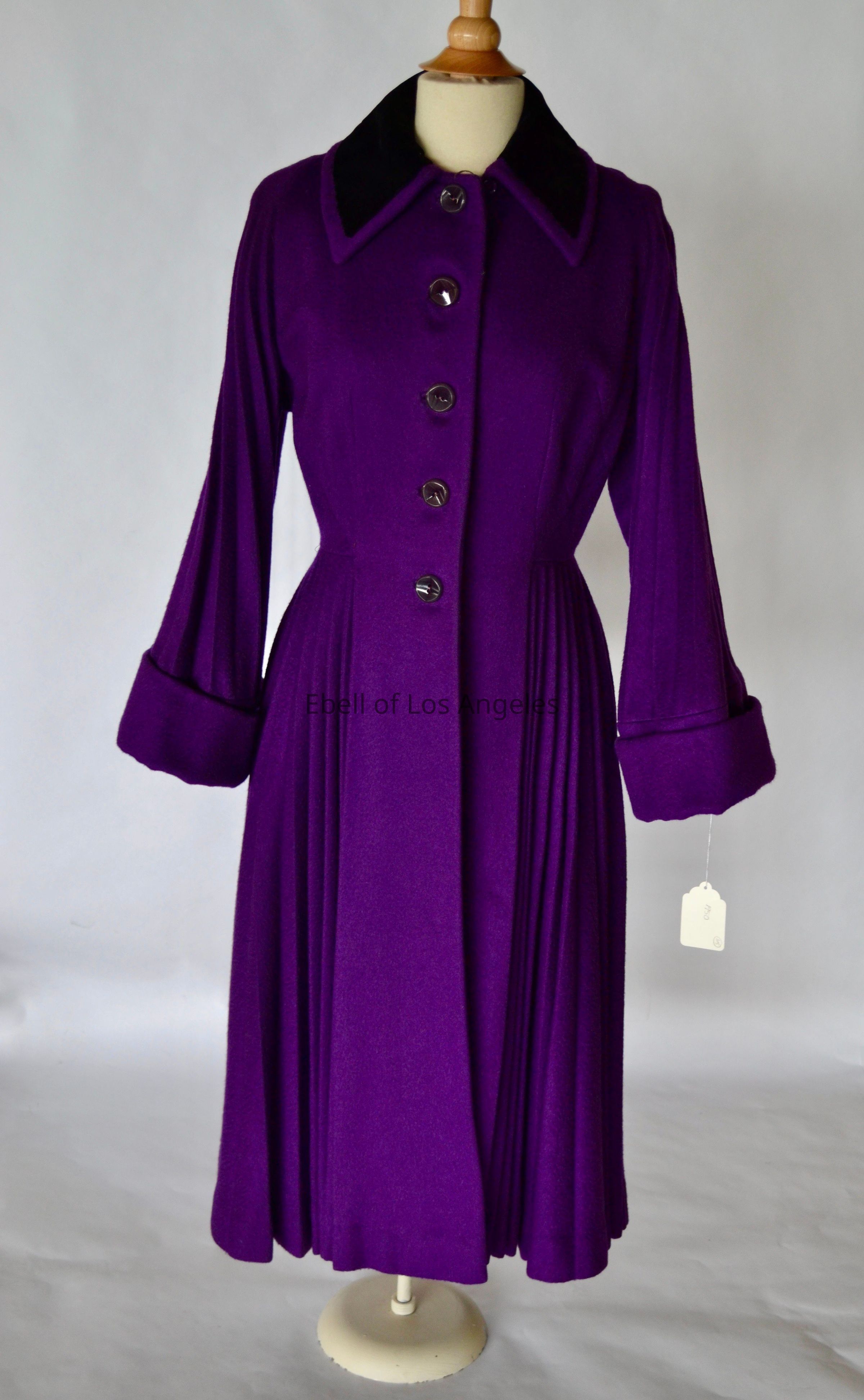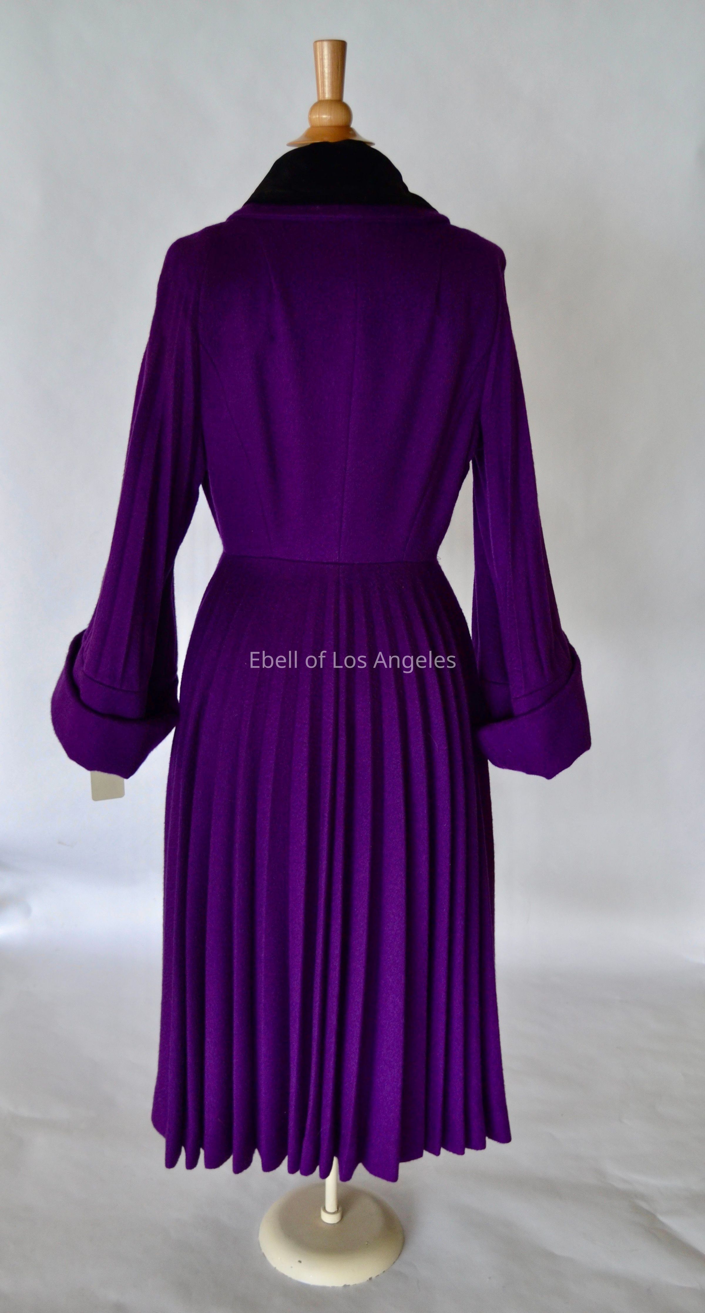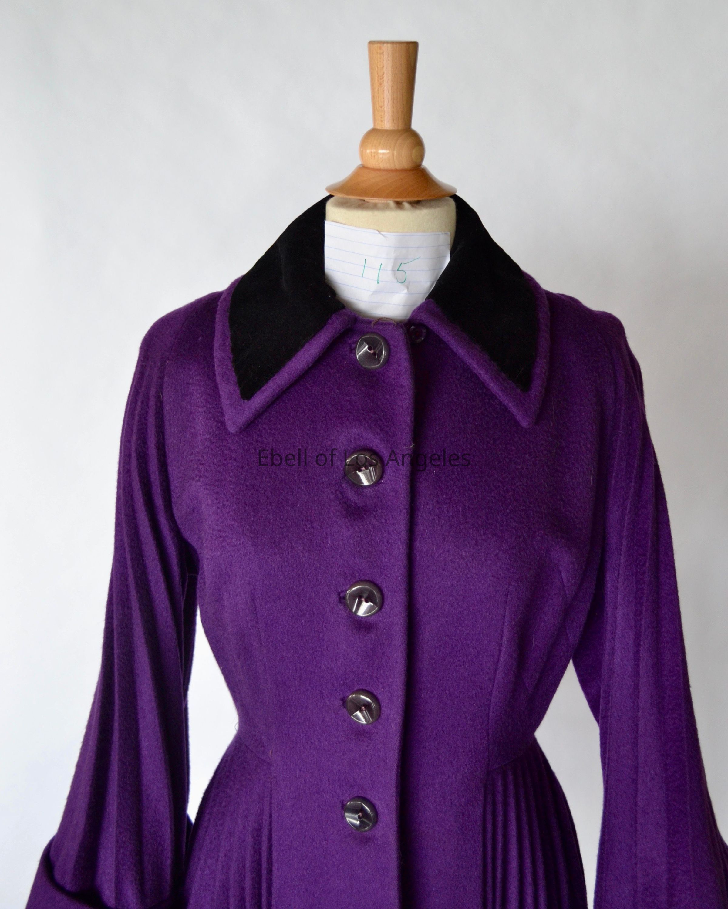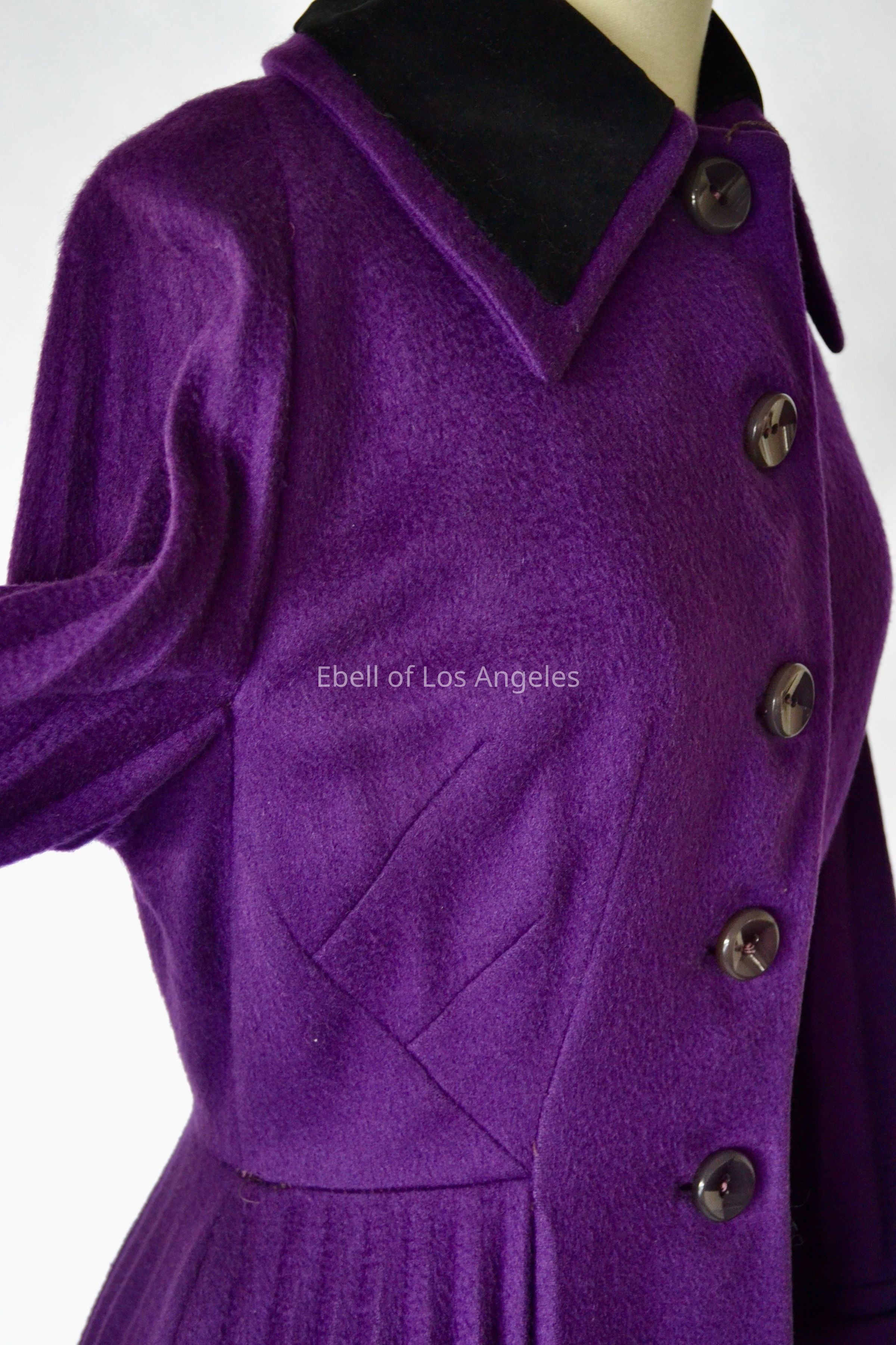 Purple wool coat with black velvet collar, fitted waist and pleated skirt and sleevesEntry/Object ID