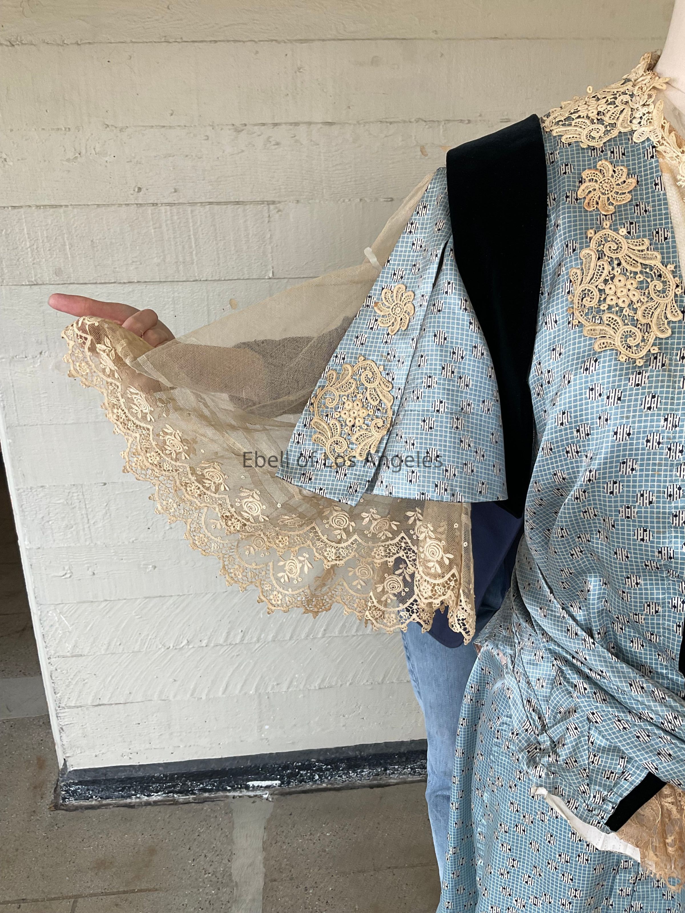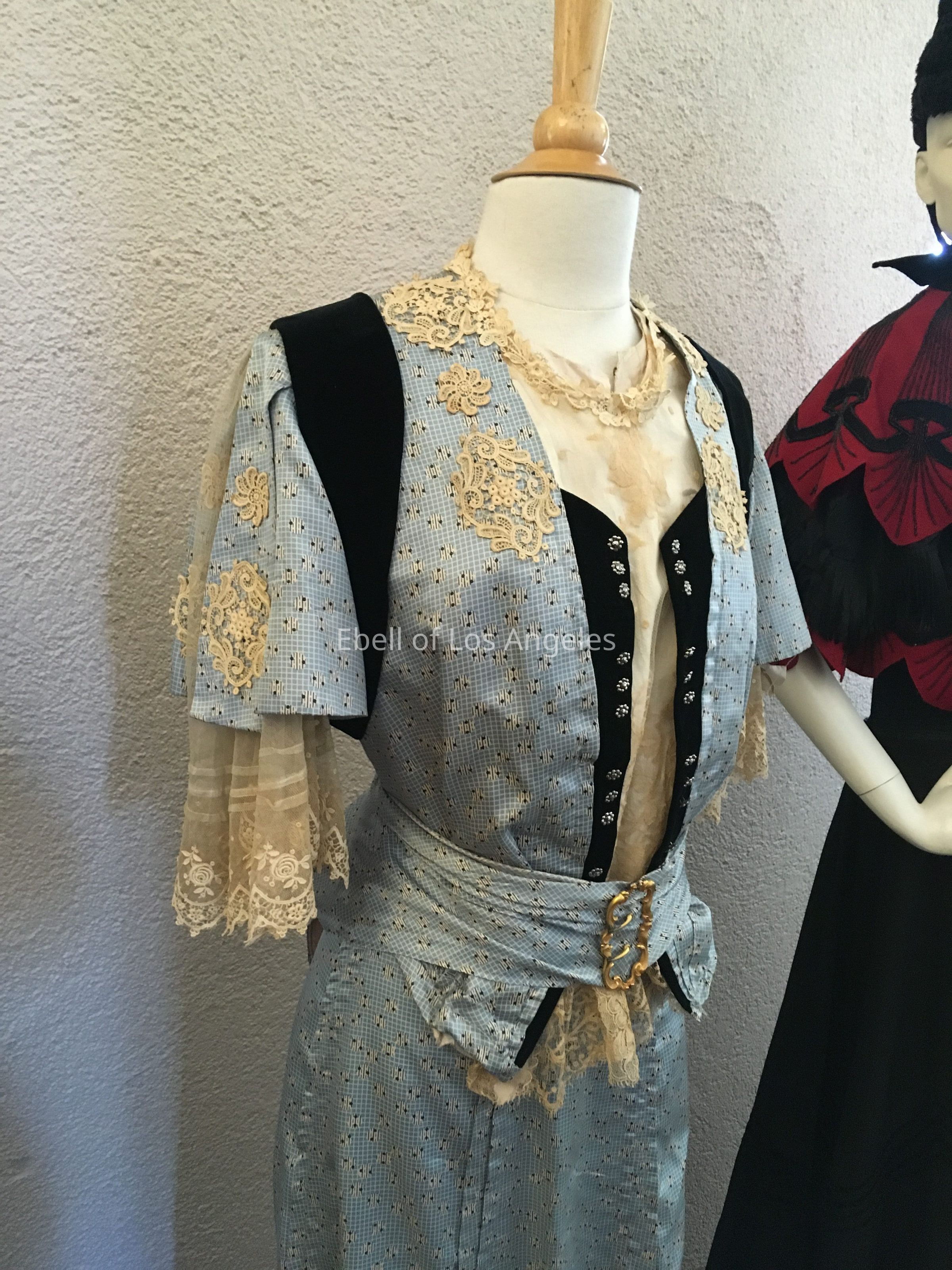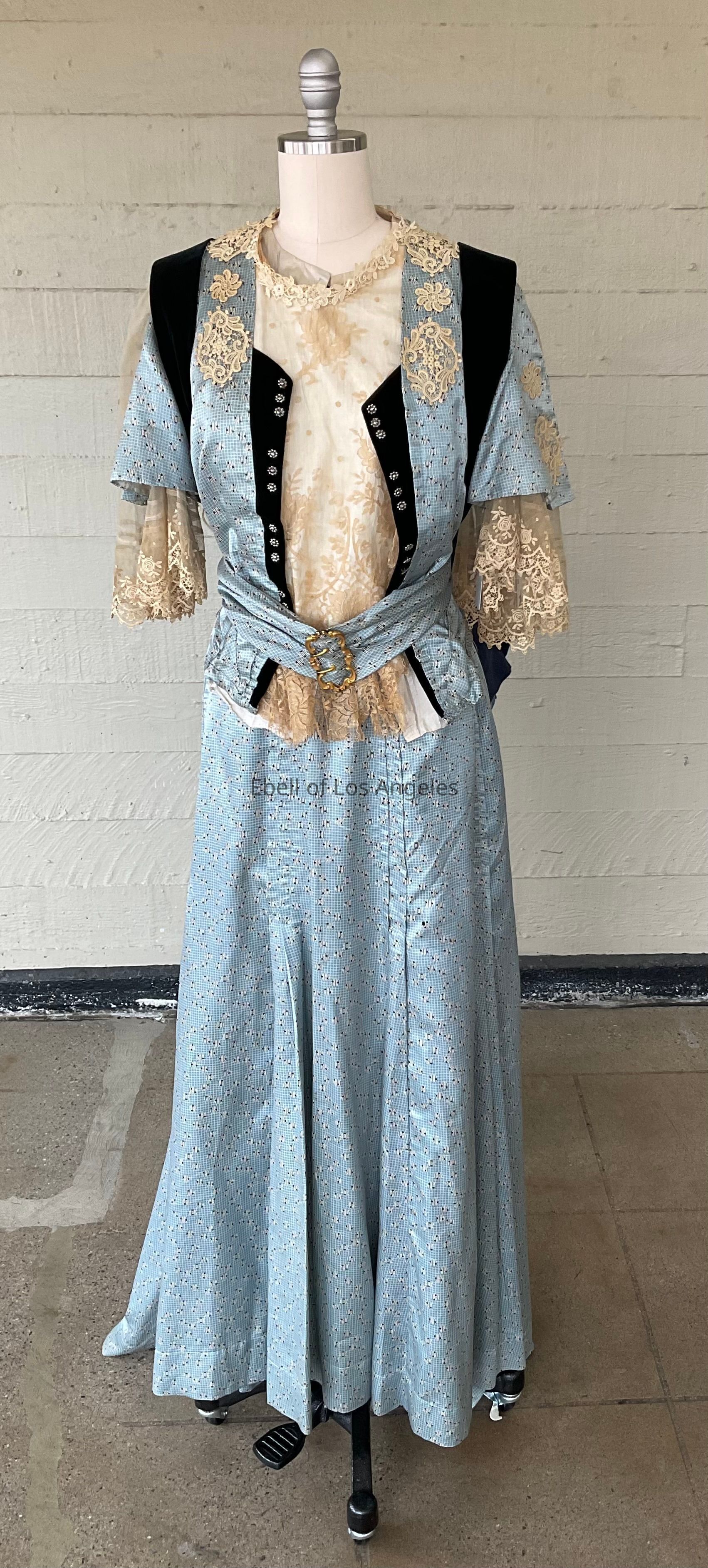 Two piece dress - short sleeve bodice with back peplum, lace, lace appliqués and velvet panels and full length skirt with self beltCollection