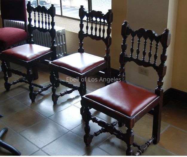 Renaissance style dining side chairs with spindle backs, fitted red vinyl seats and front turned legs with turned stretchers. Back legs are plain. These chairs have not been refurbished.Collection