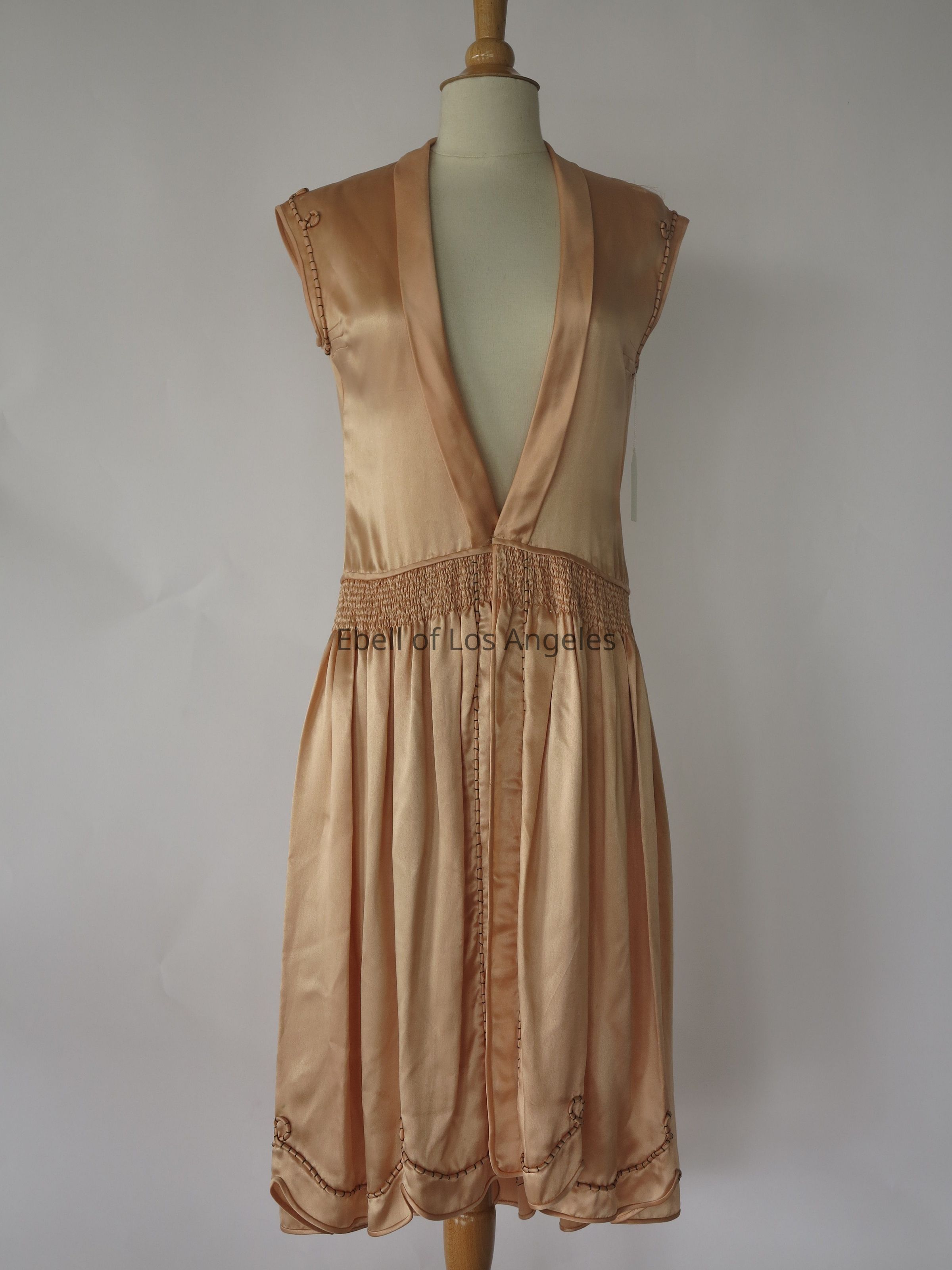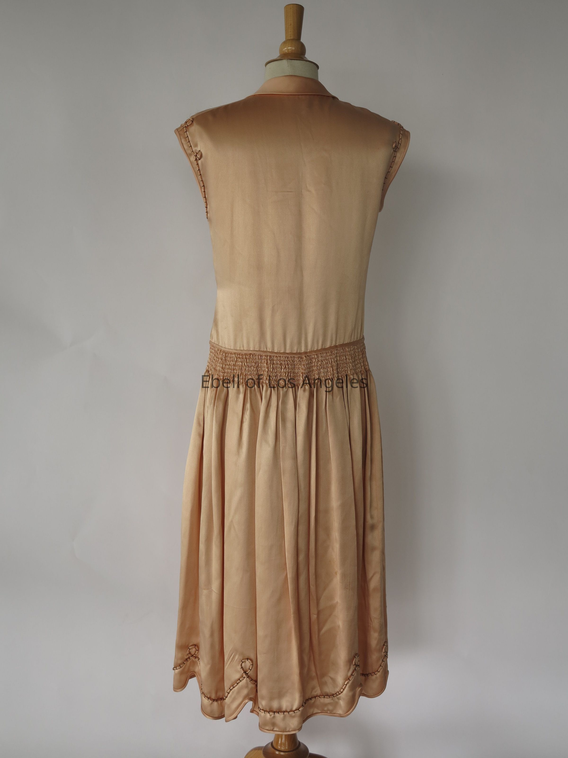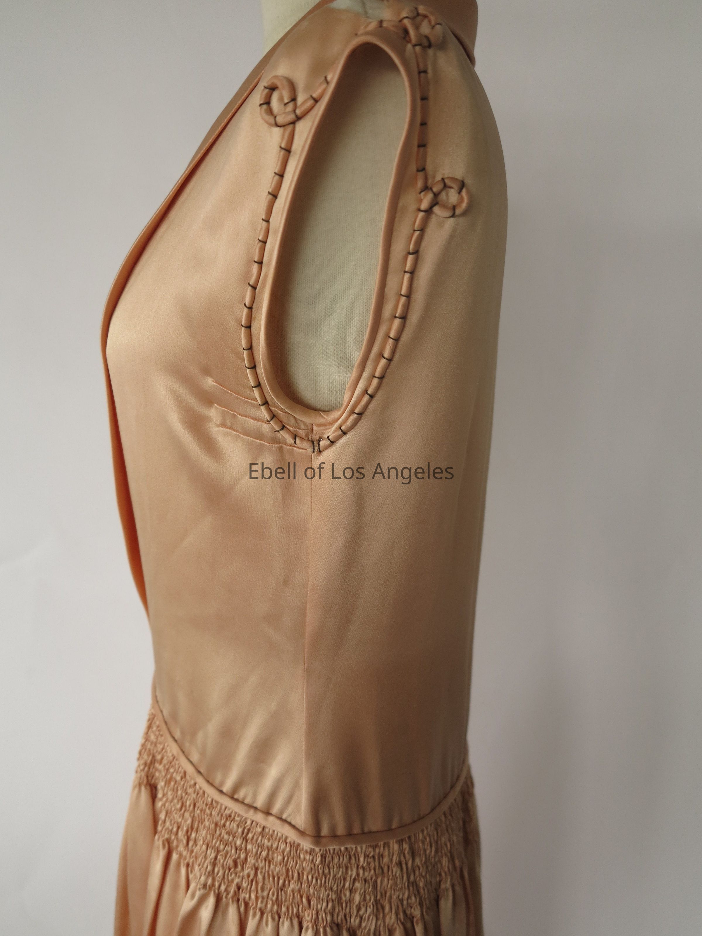 Cap sleeve dress with shirred drop waist, shawl collar and self rope embellishmentEntry/Object ID