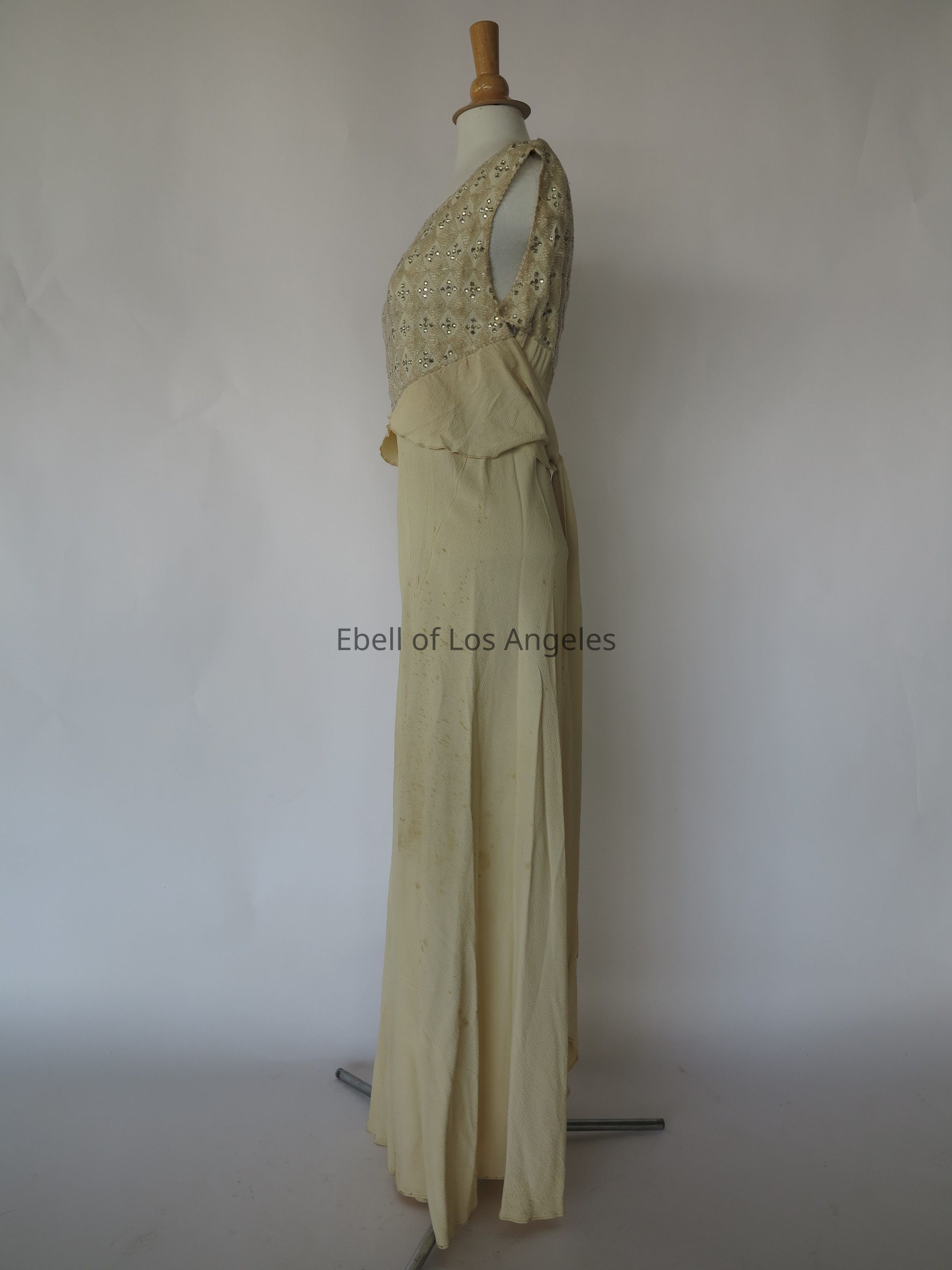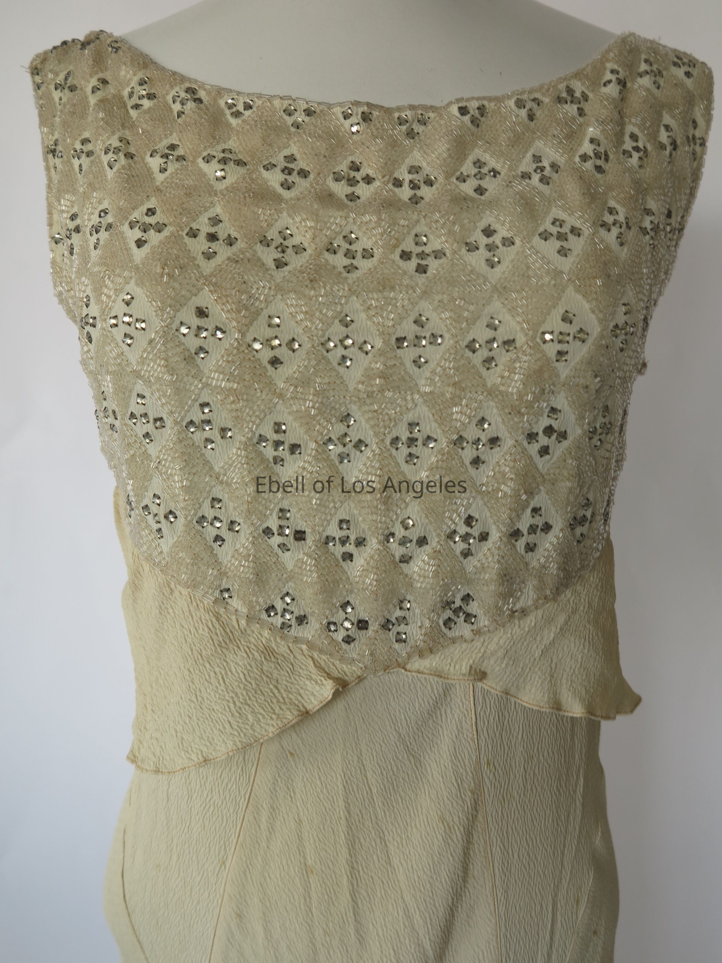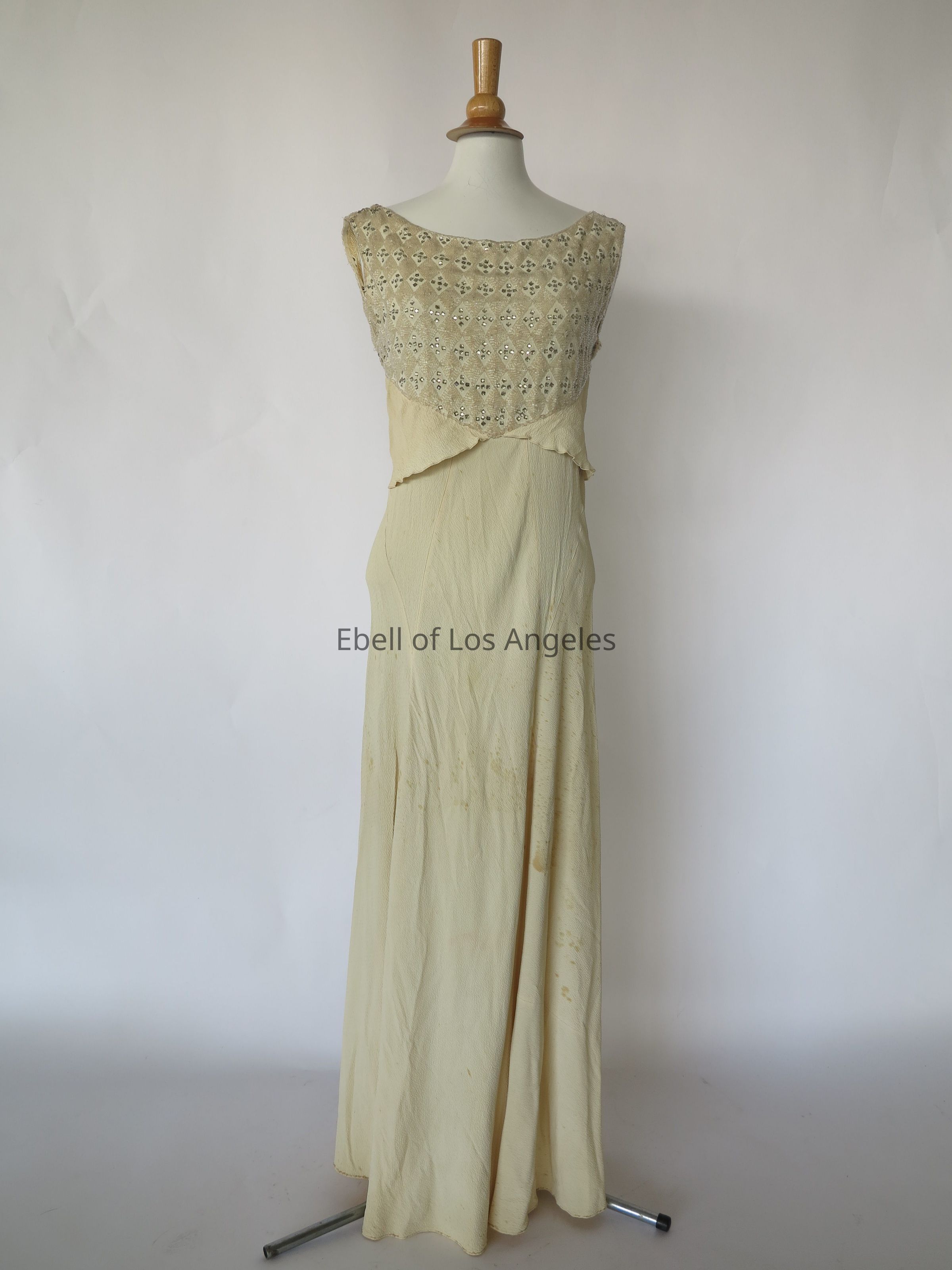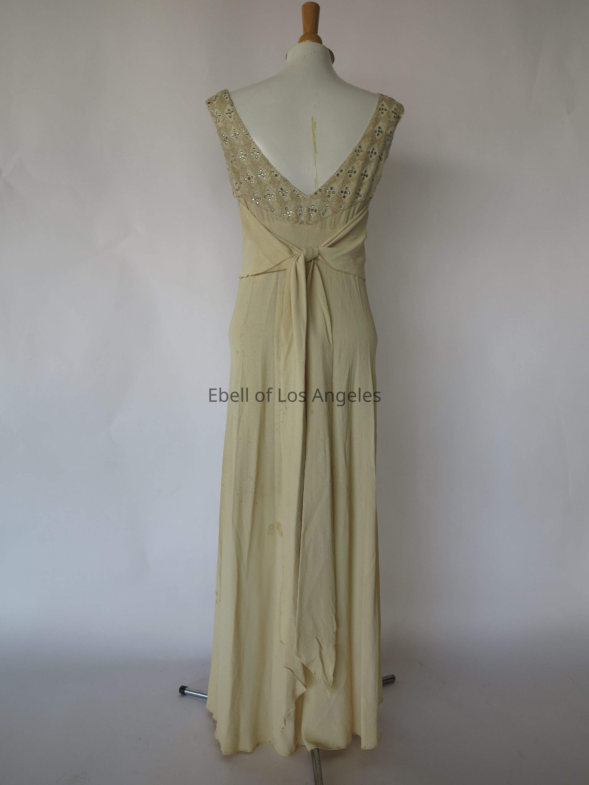 Long sleeveless scoop neck bias dress with embellished bodice with attached self sashEntry/Object ID