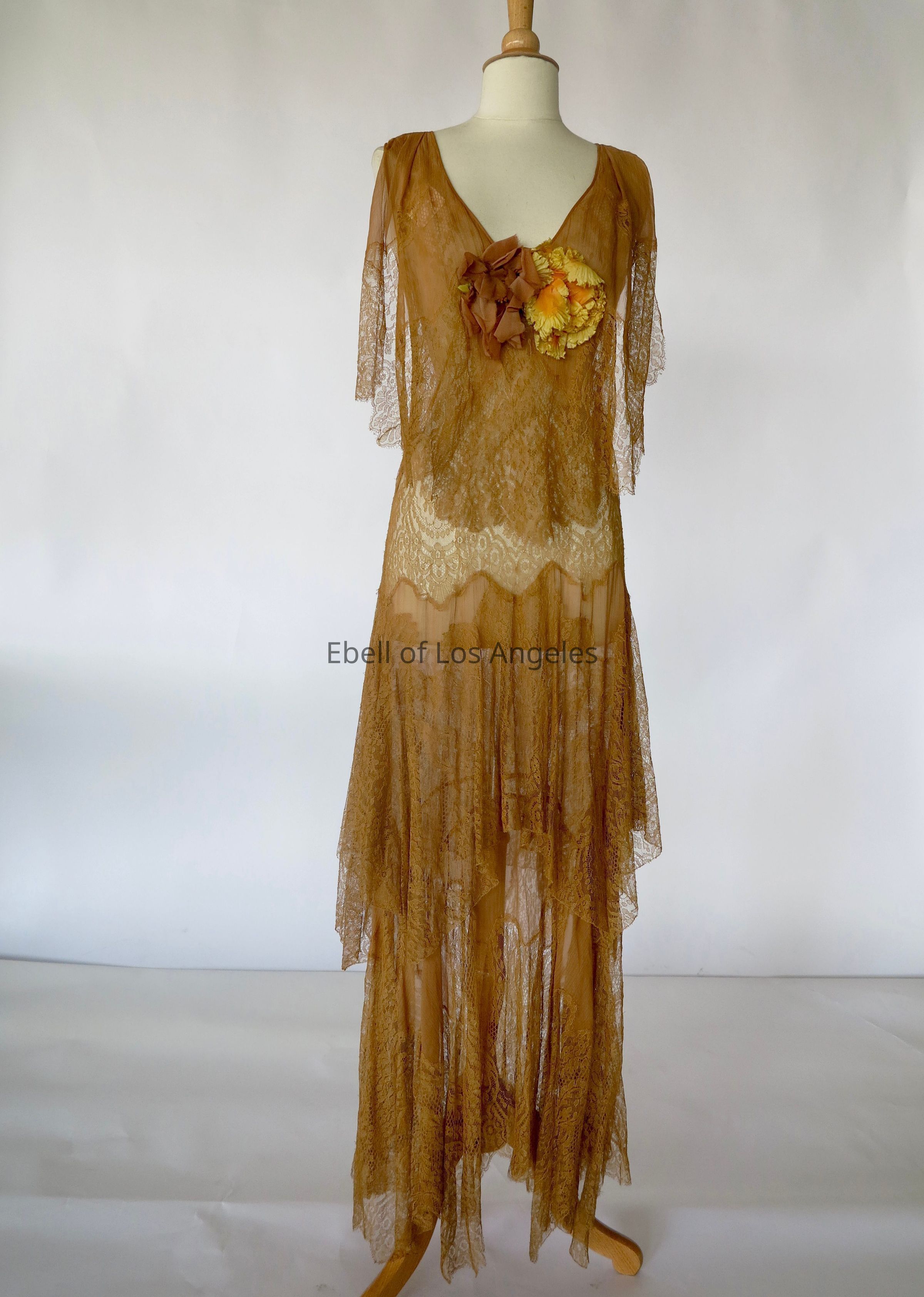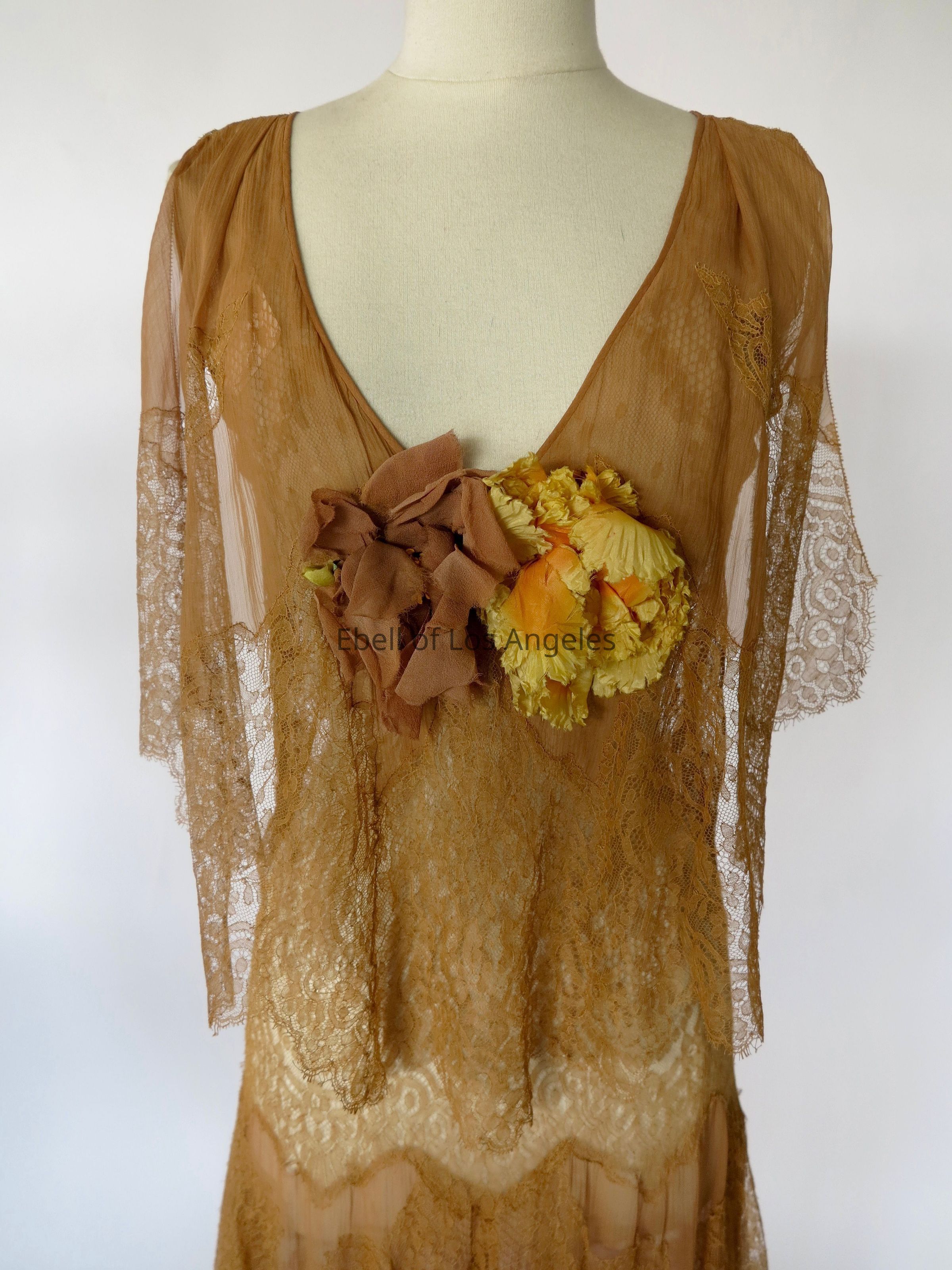 Lace/chiffon long v-neck dress with tiered skirt and floral embellishment at frontCollection