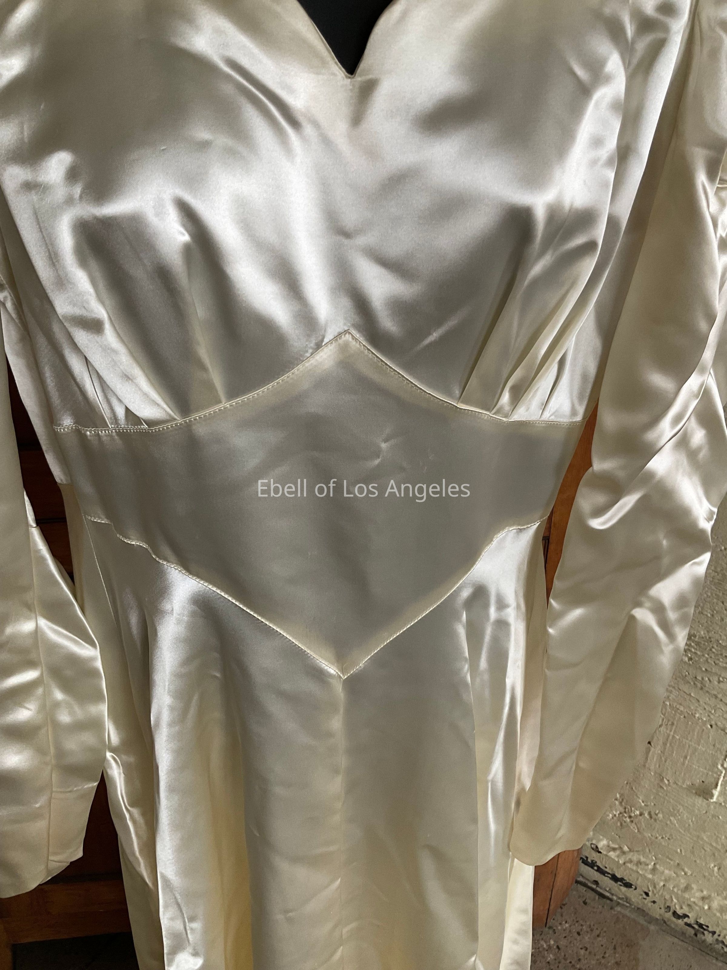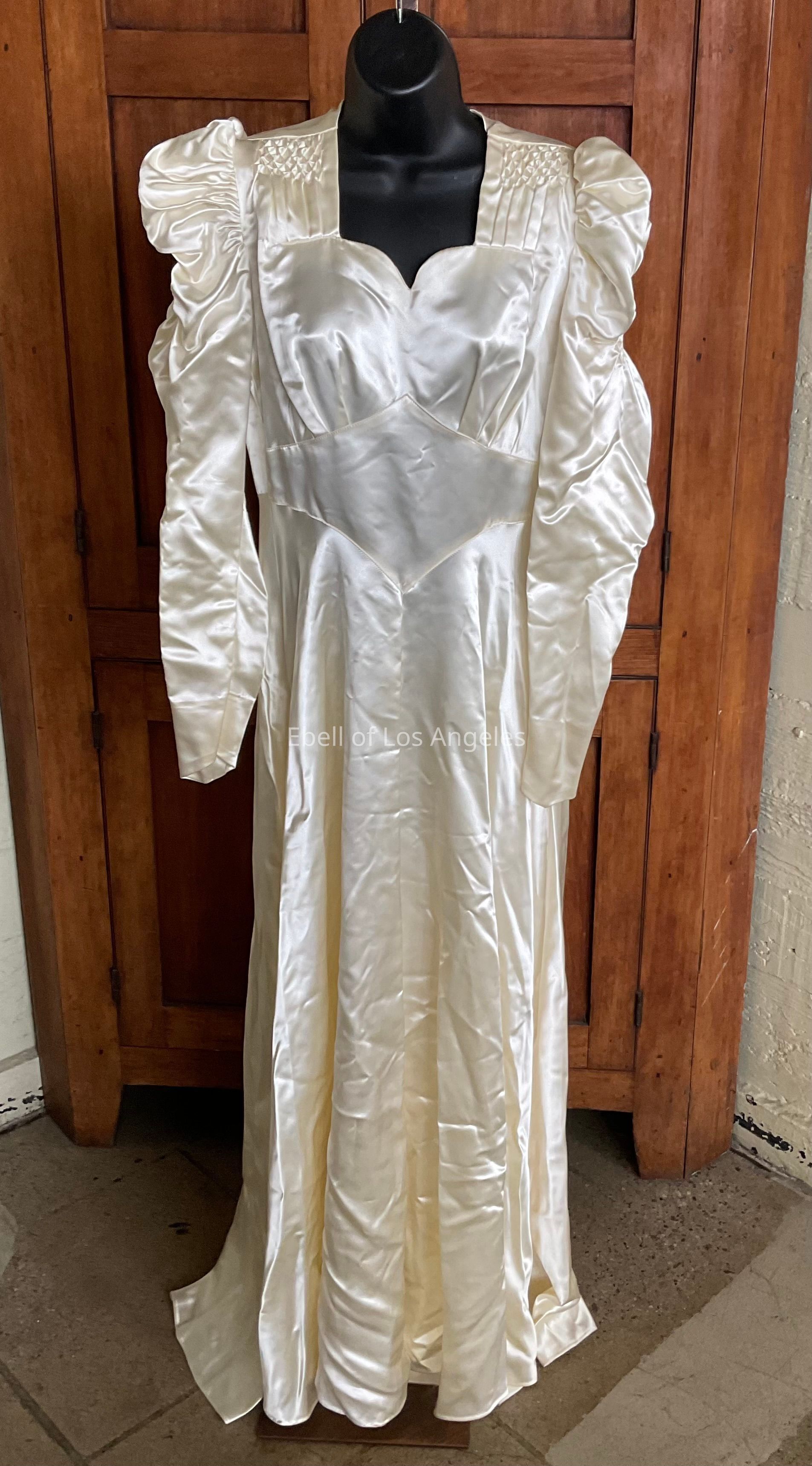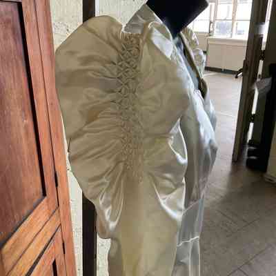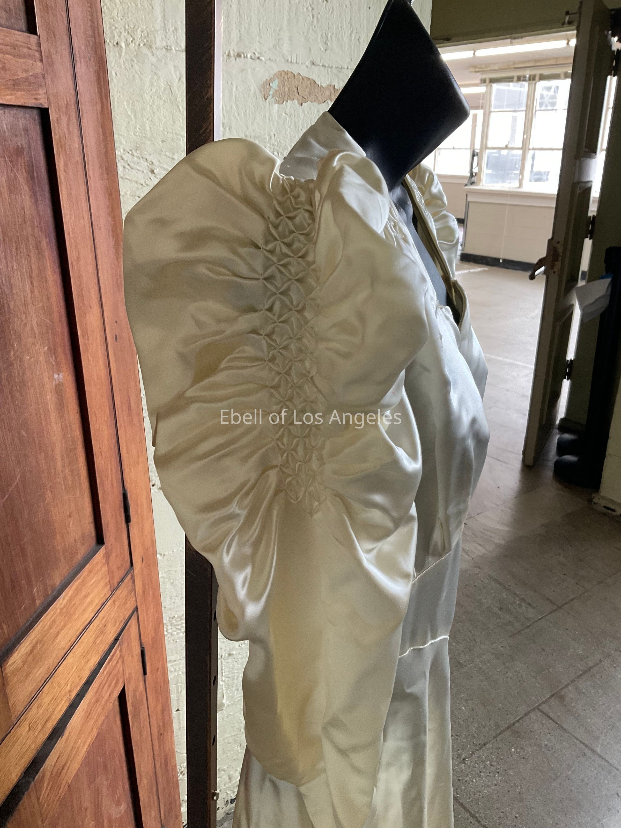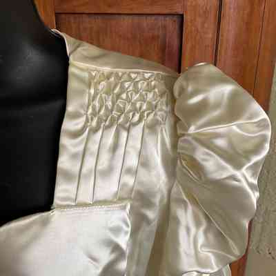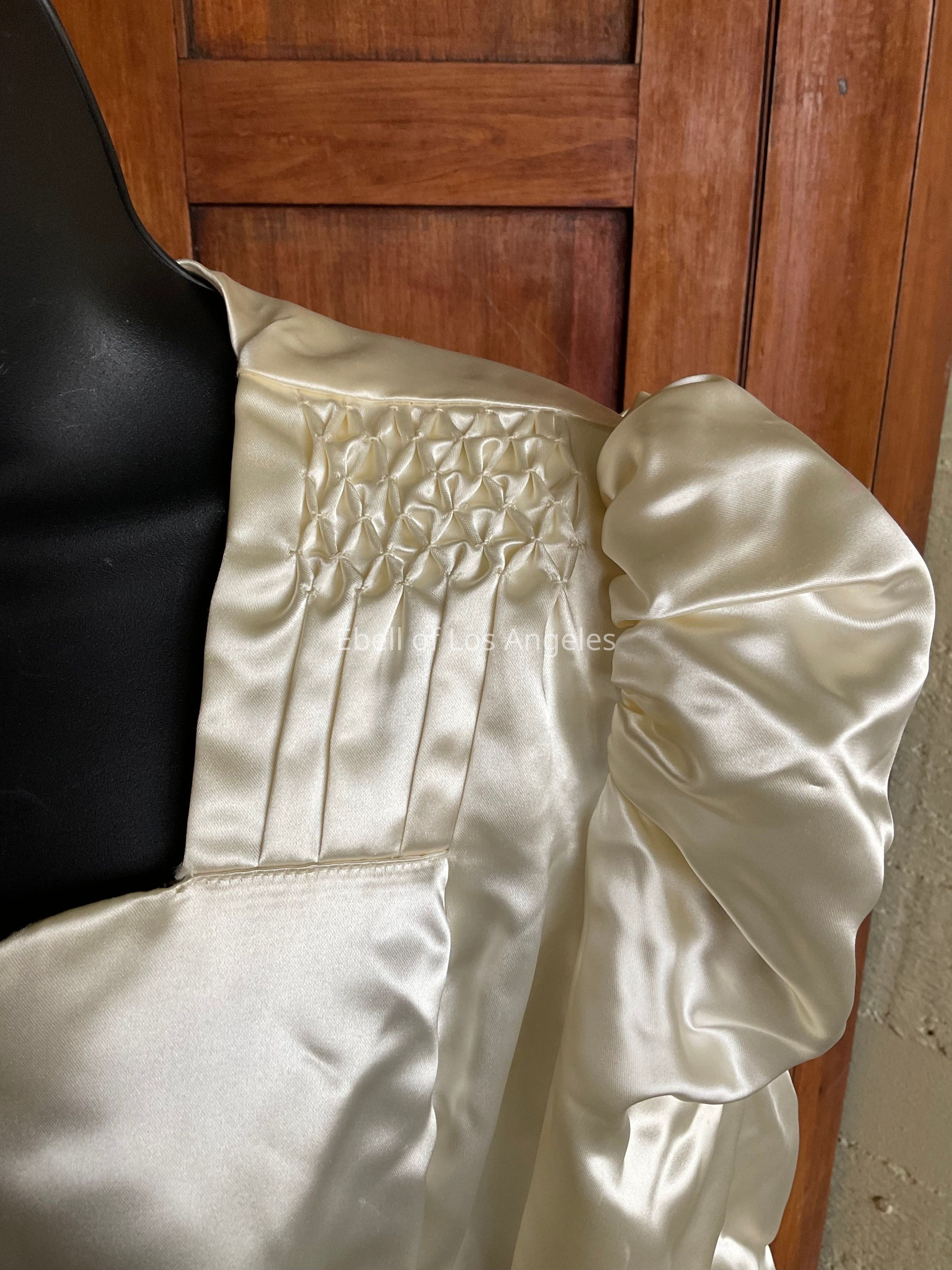 Silk satin wedding dress with leg of mutton sleeves, smocking details at shoulder and onnsleeve