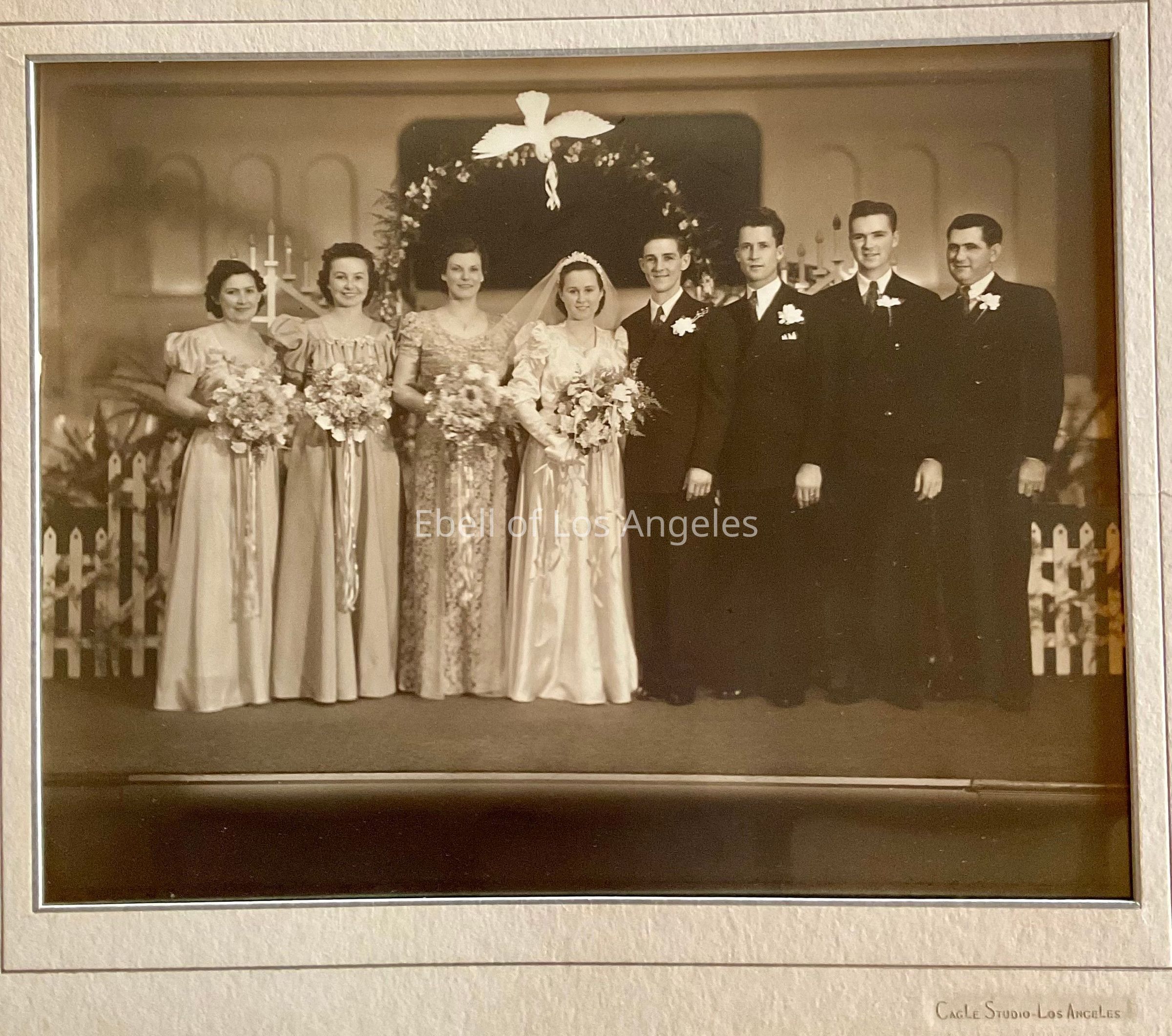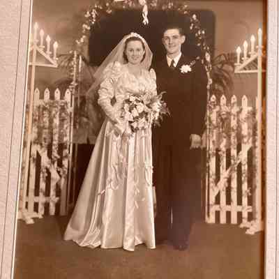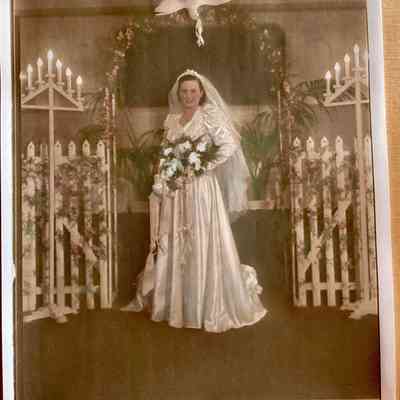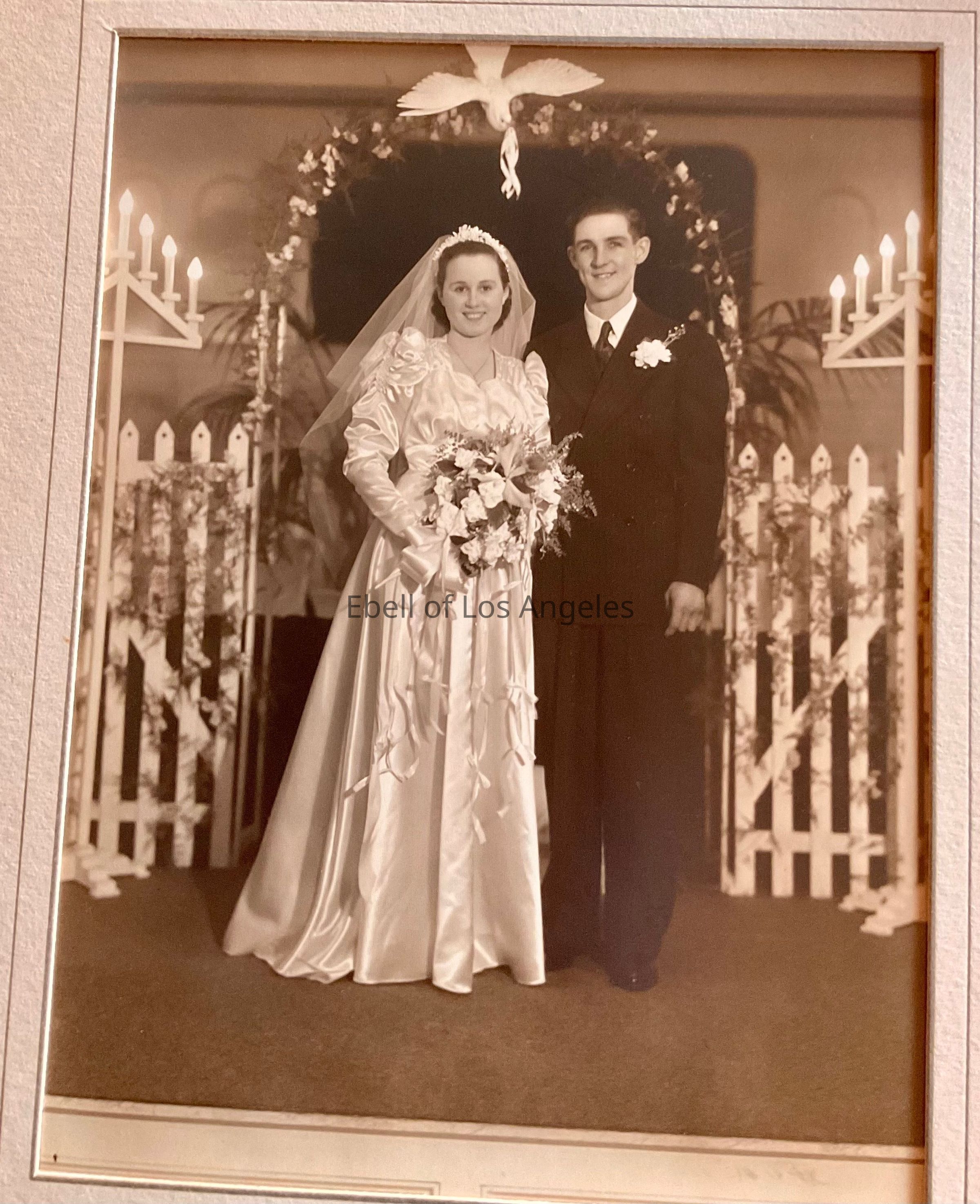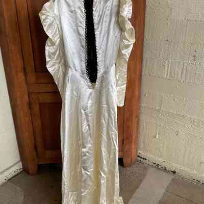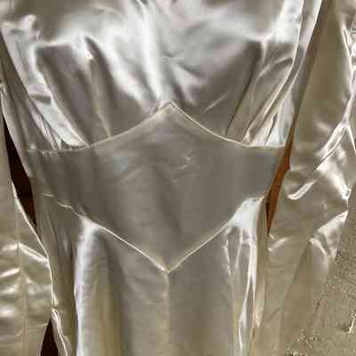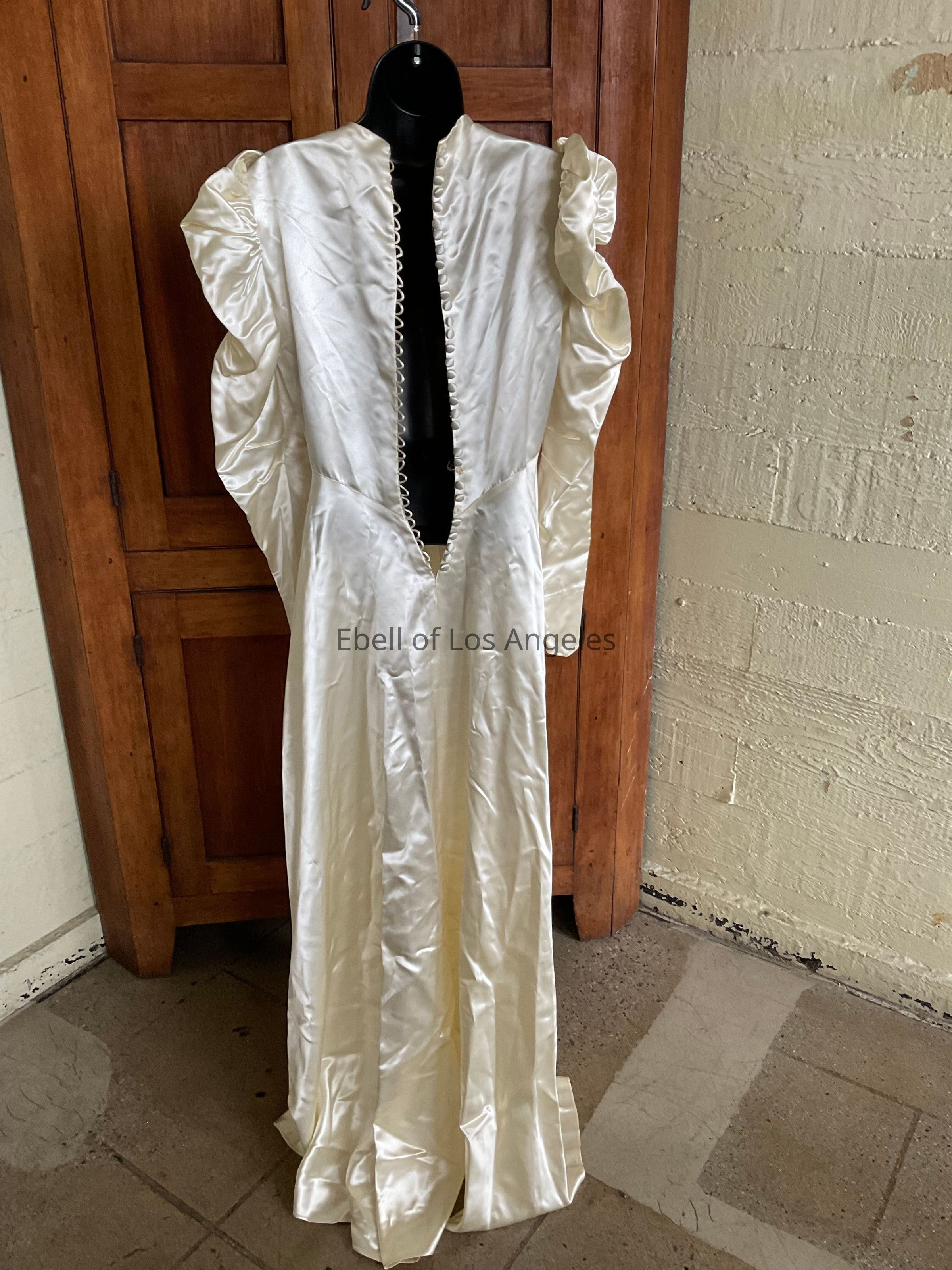 Silk satin wedding dress with leg of mutton sleeves, smocking details at shoulder and onnsleeve