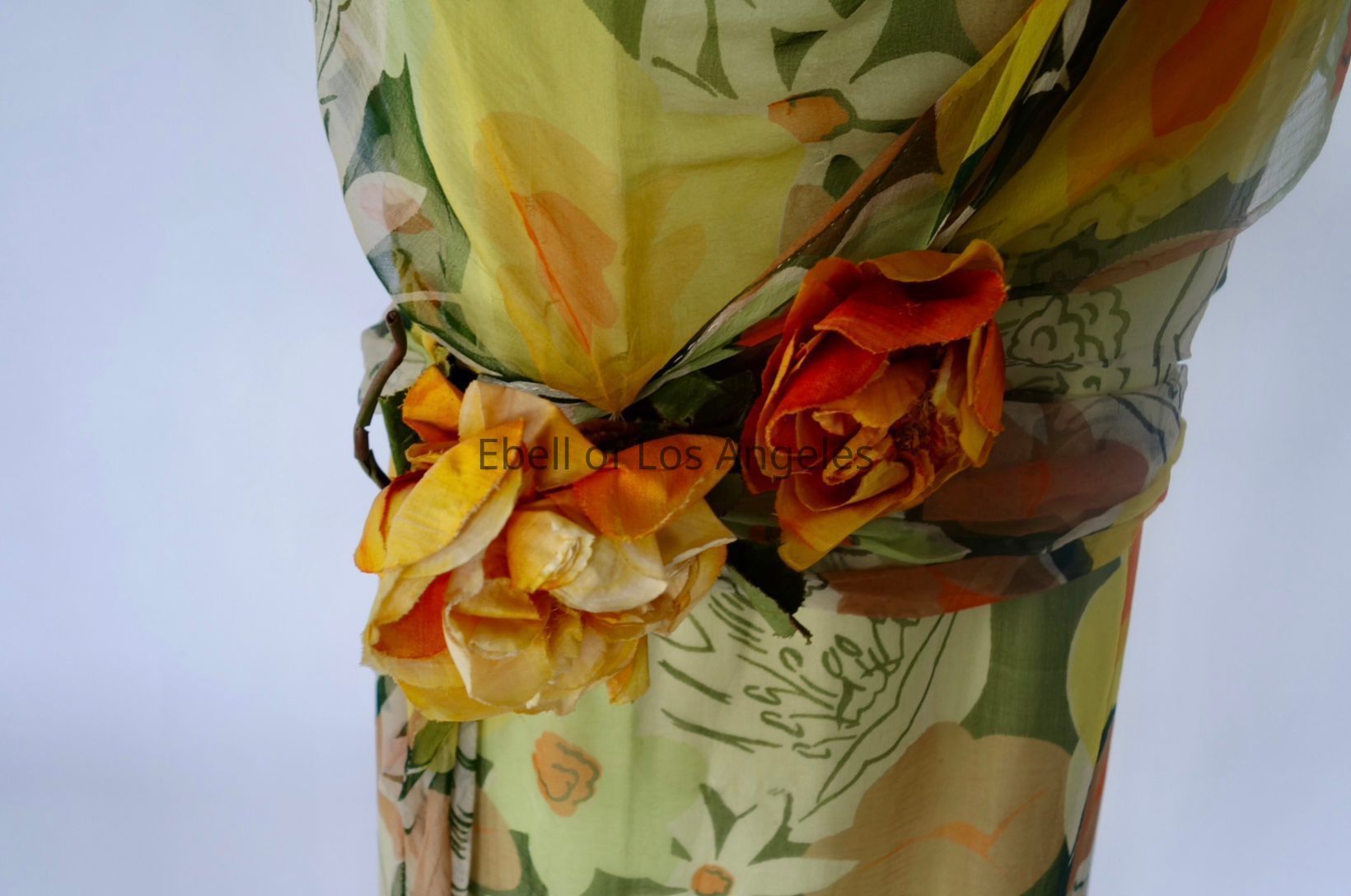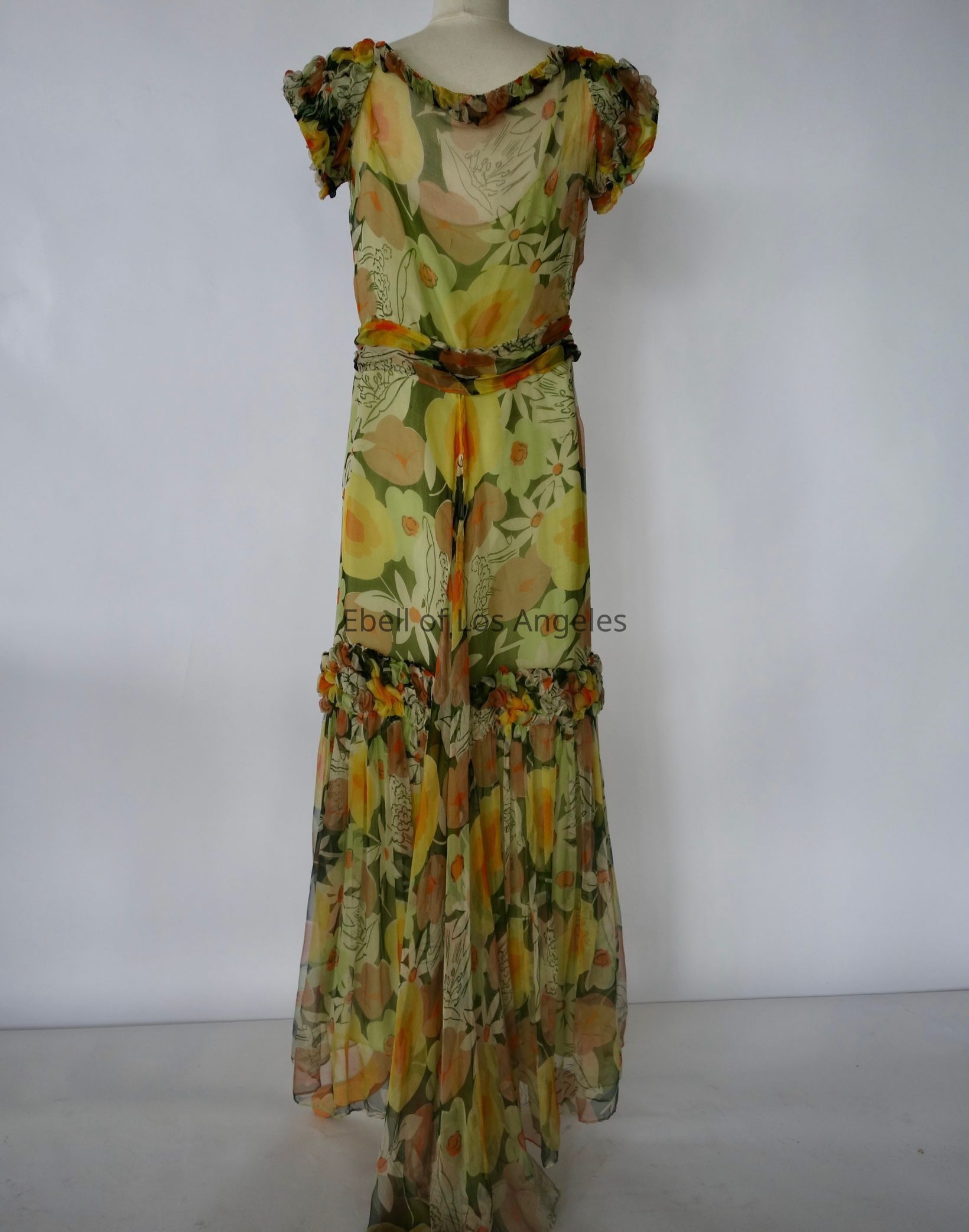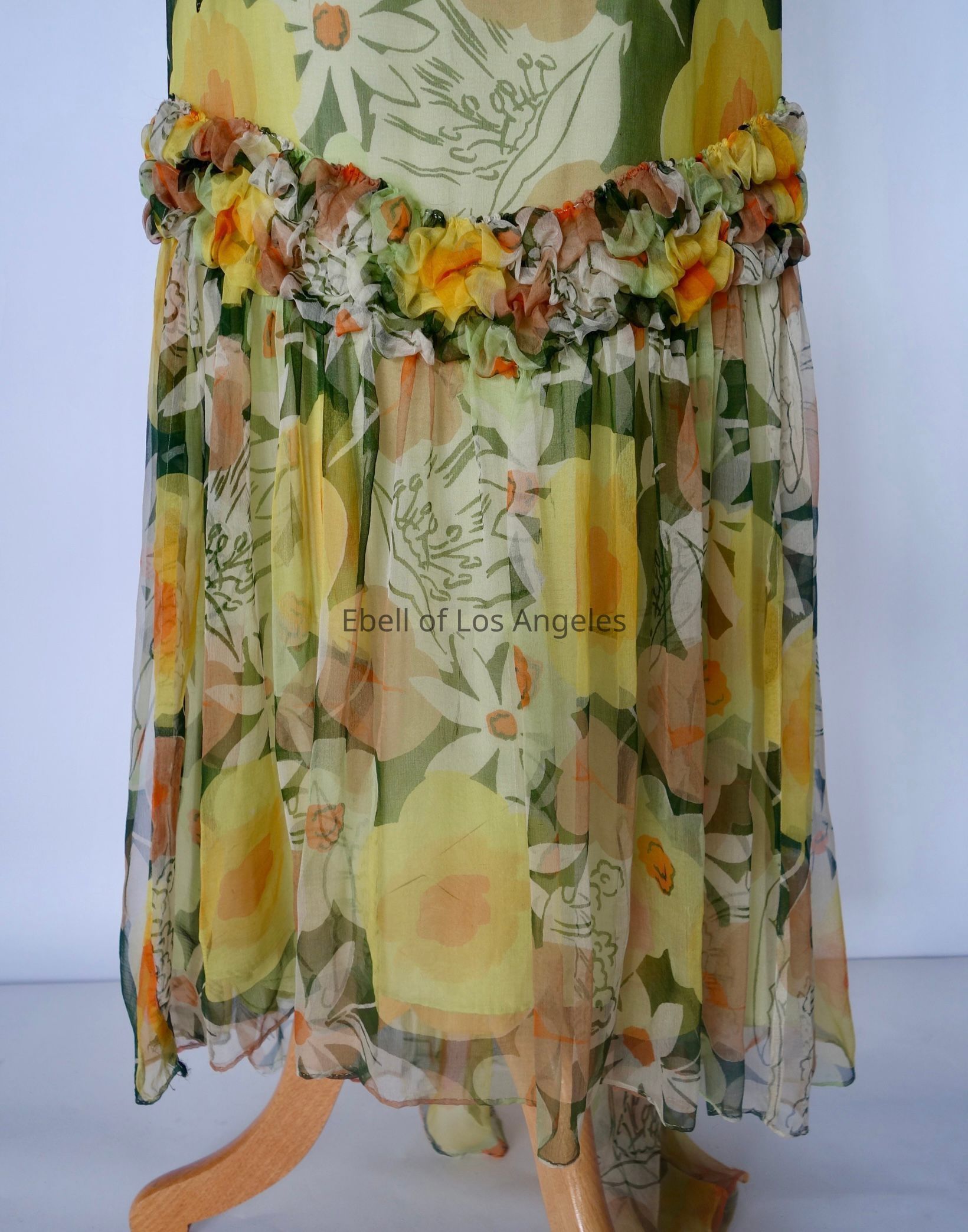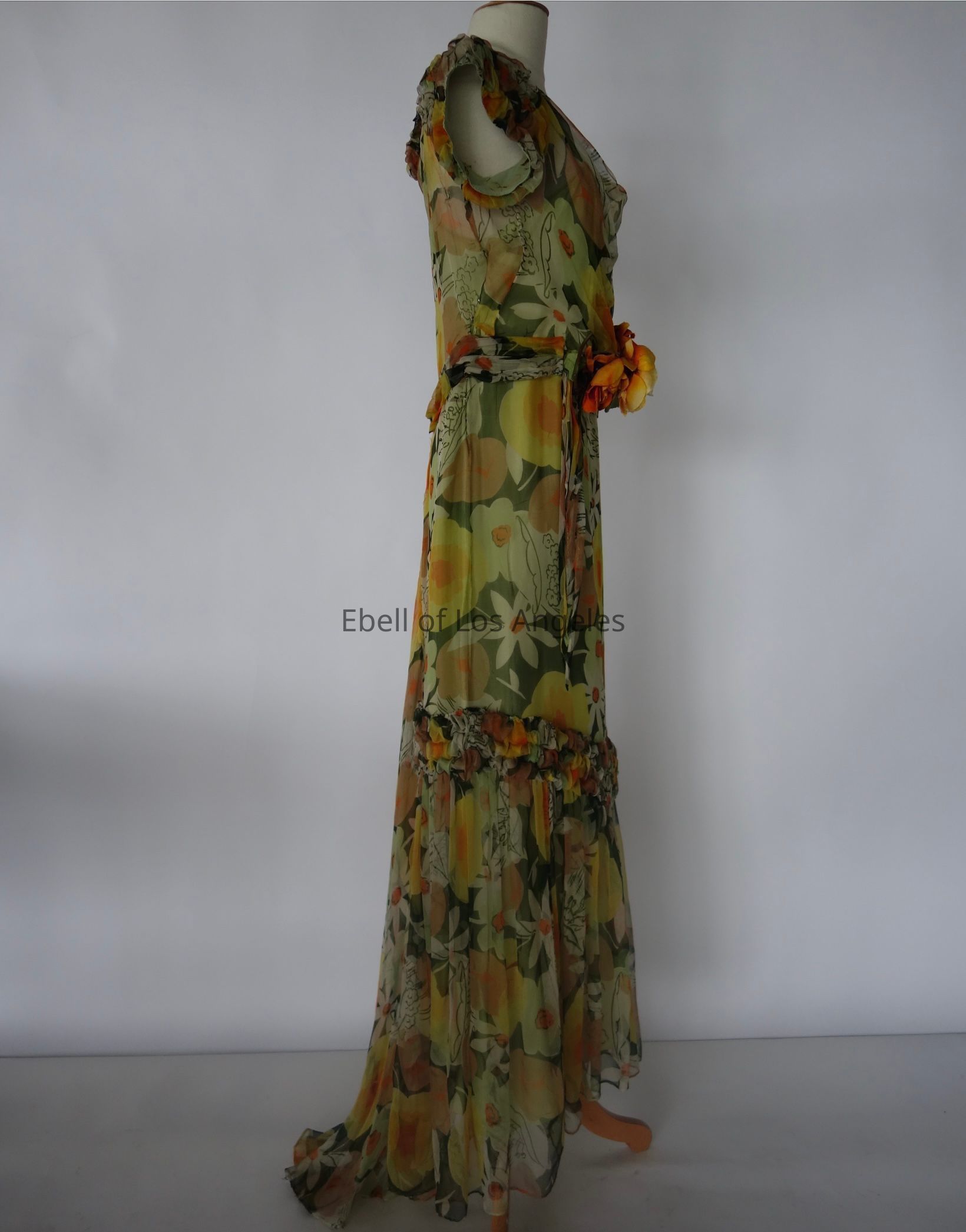 Long floral chiffon dress with cowl neck, smocked cap sleeves, faux flower embellishment at waist, smocked and gathered flounceCollection