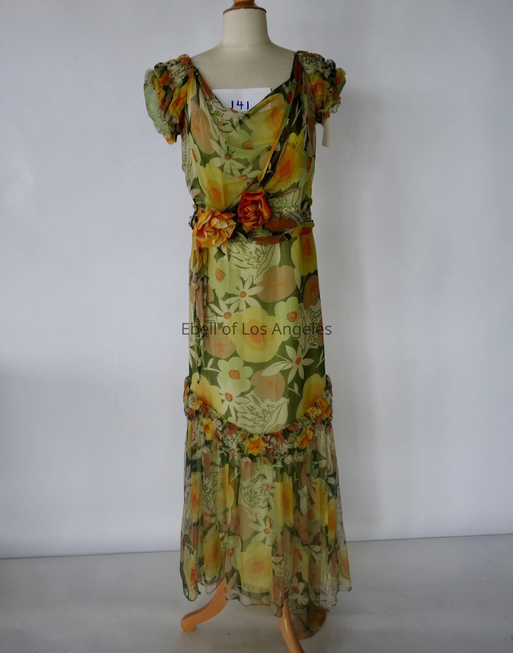 Long floral chiffon dress with cowl neck, smocked cap sleeves, faux flower embellishment at waist, smocked and gathered flounceEntry/Object ID