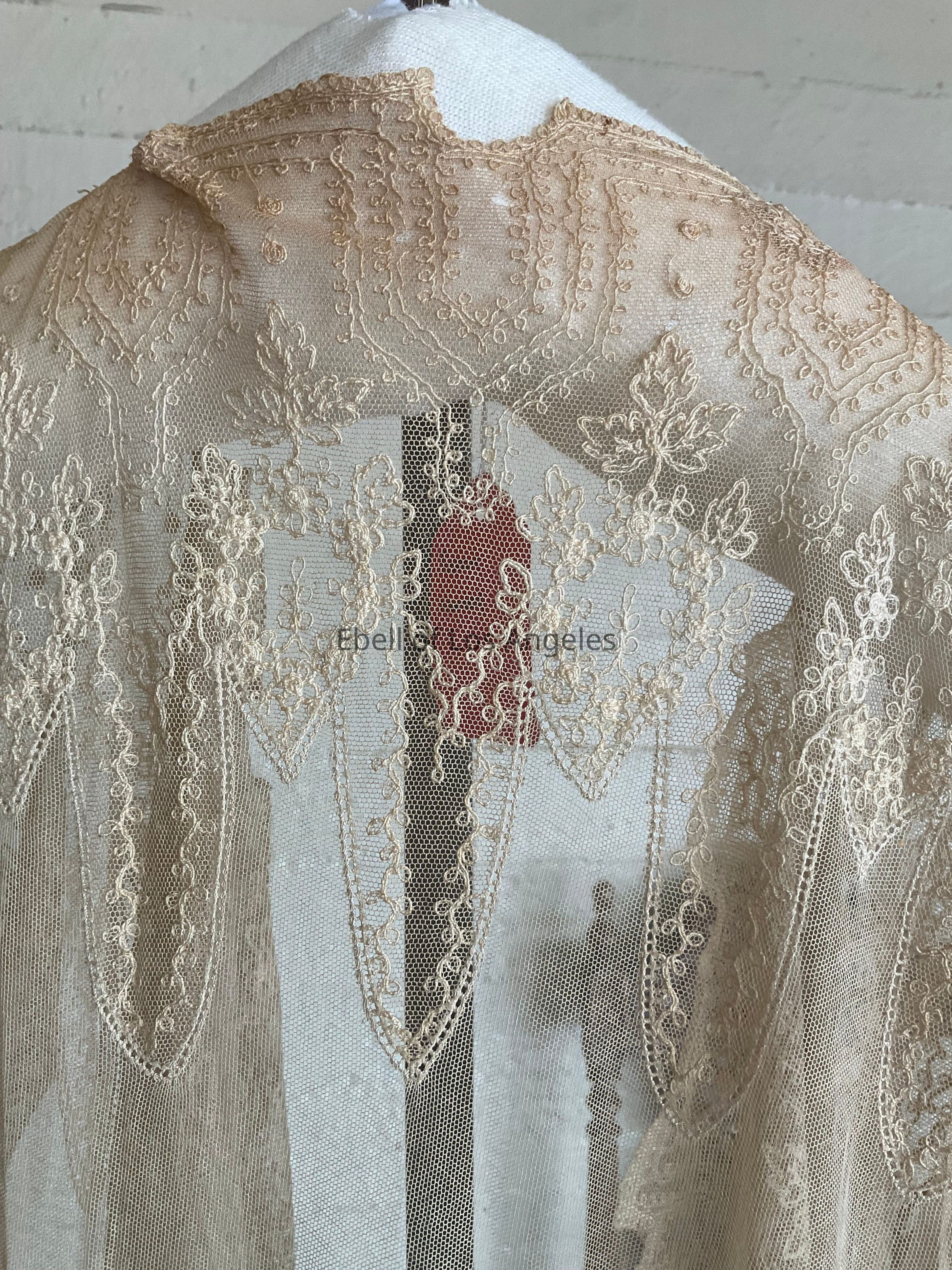 Embroidered net 3/4 sleeve open front jacket, decorative cutouts at shoulder seam
