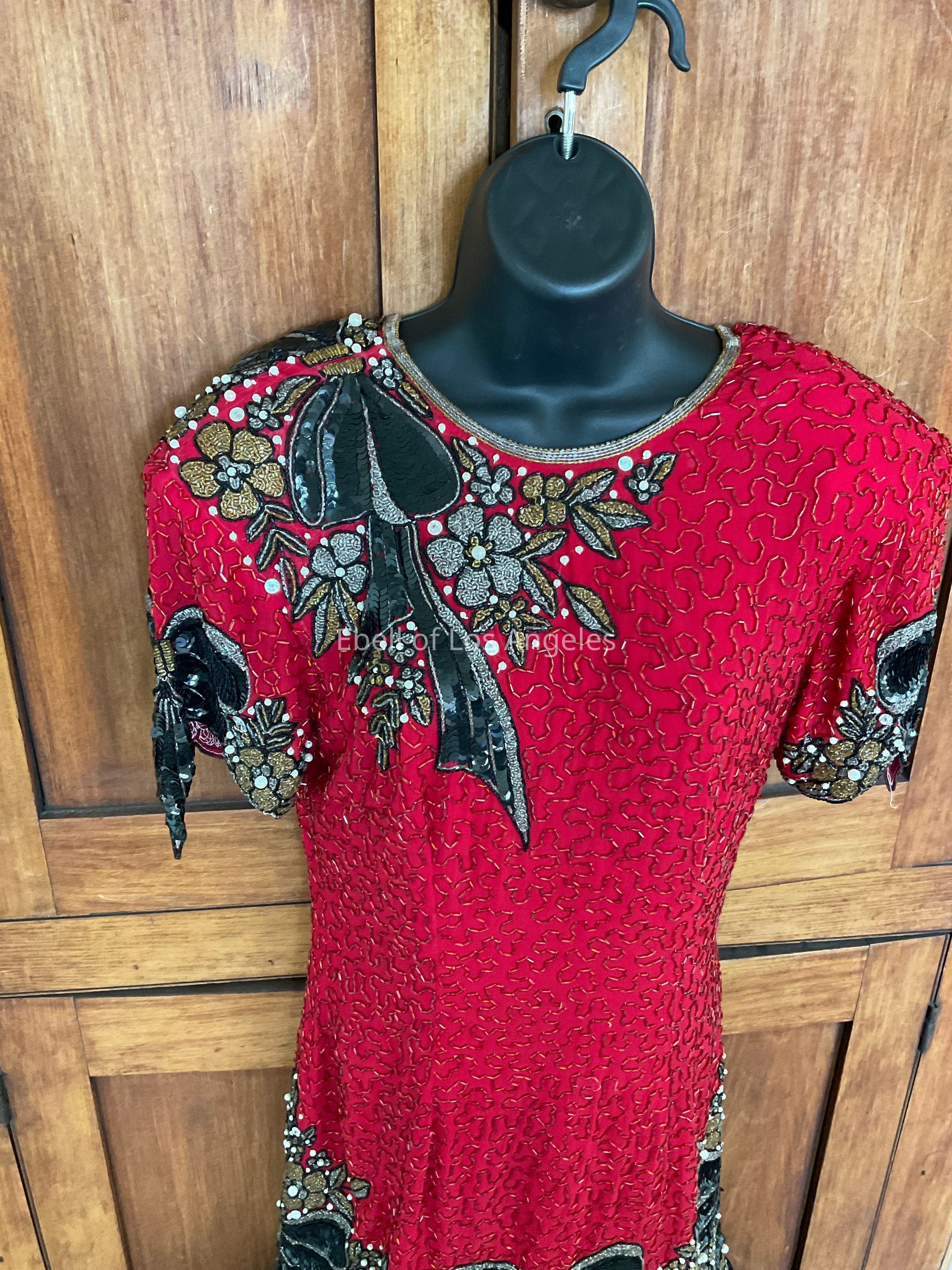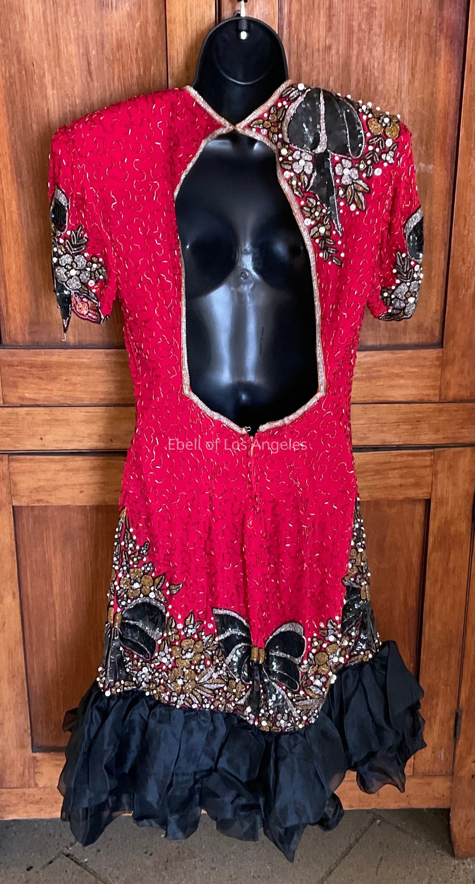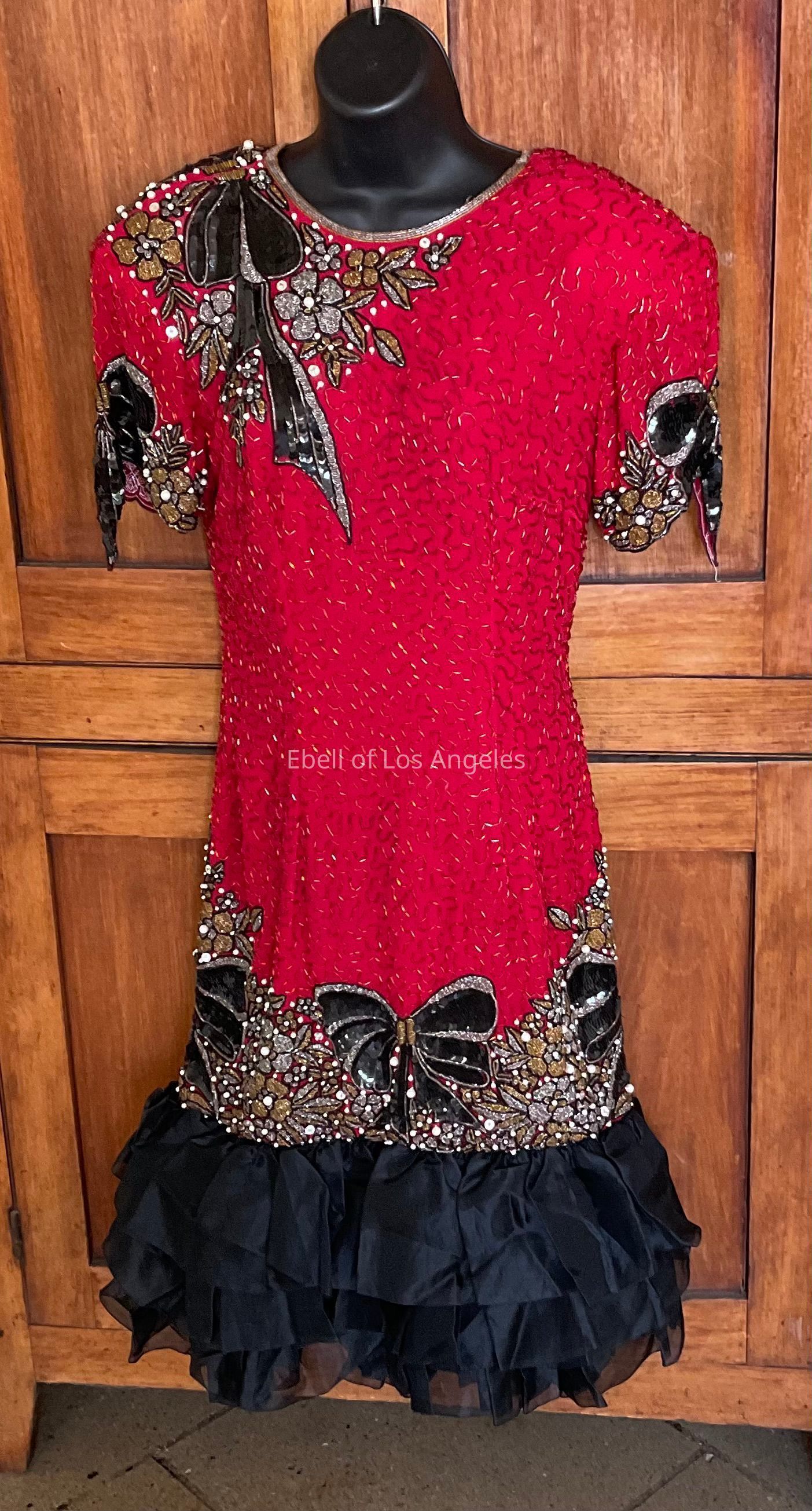 Short padded sleeve beaded dress with ruffles at hem and contrast bead embellishmentsEntry/Object ID