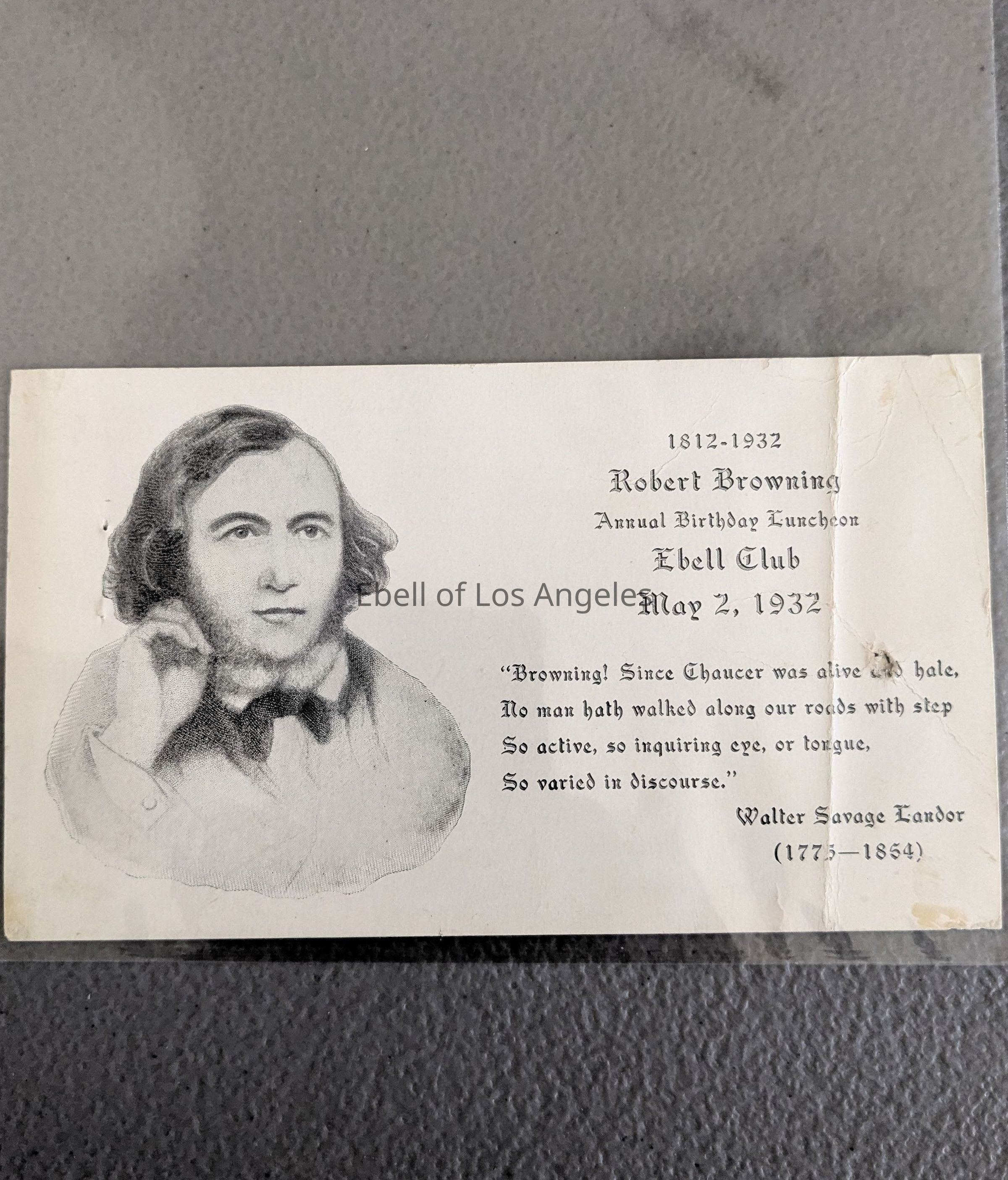 Browning Programs and Events. Photo of Robert Browning, Los Angeles Browning Society 1934-1935 booklet, Annual Birthday Luncheon flyer, Birthday flyerDate(s) of Creation