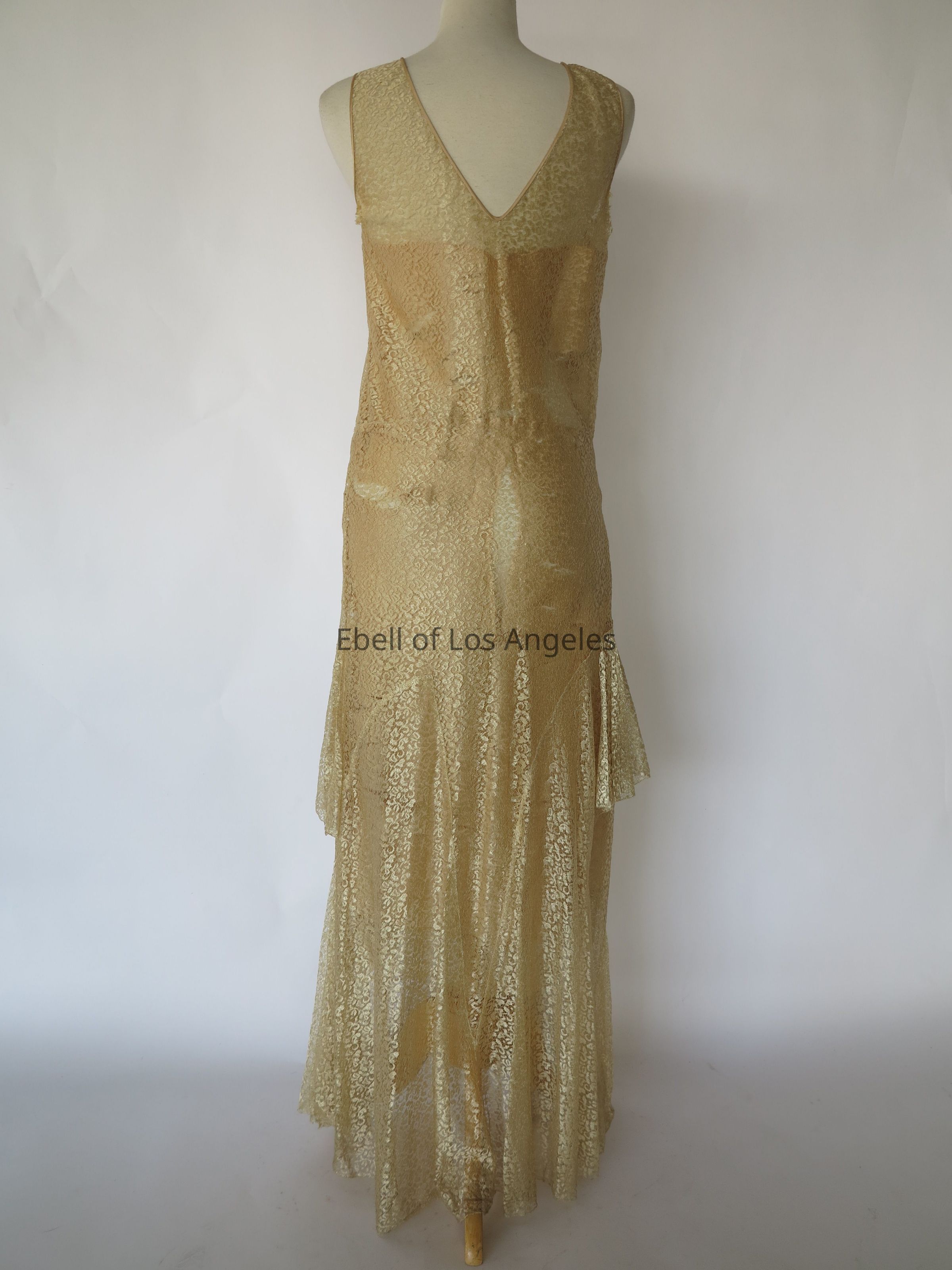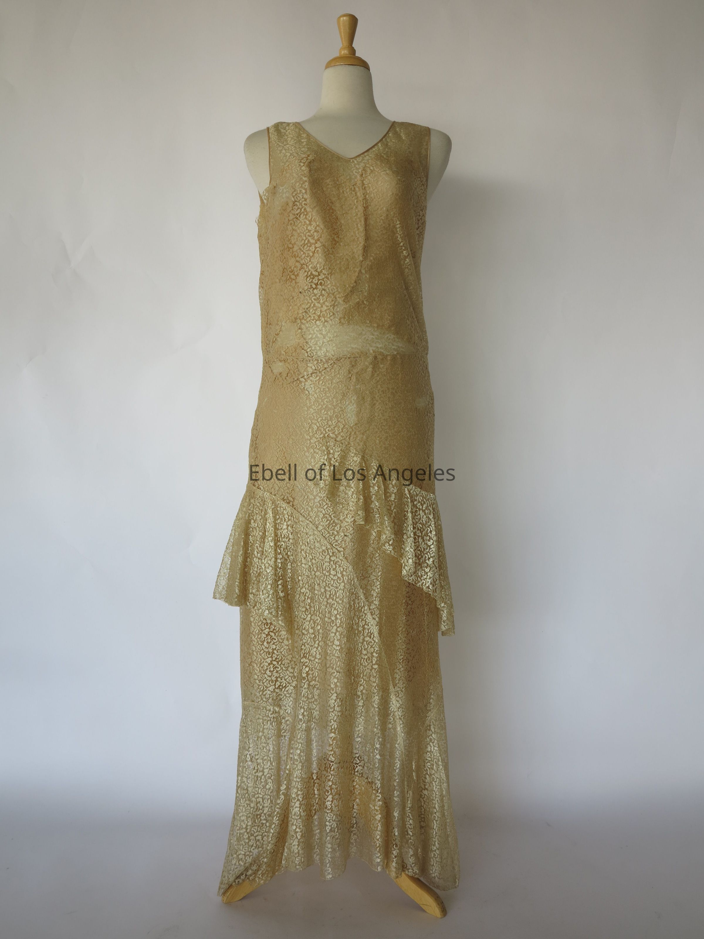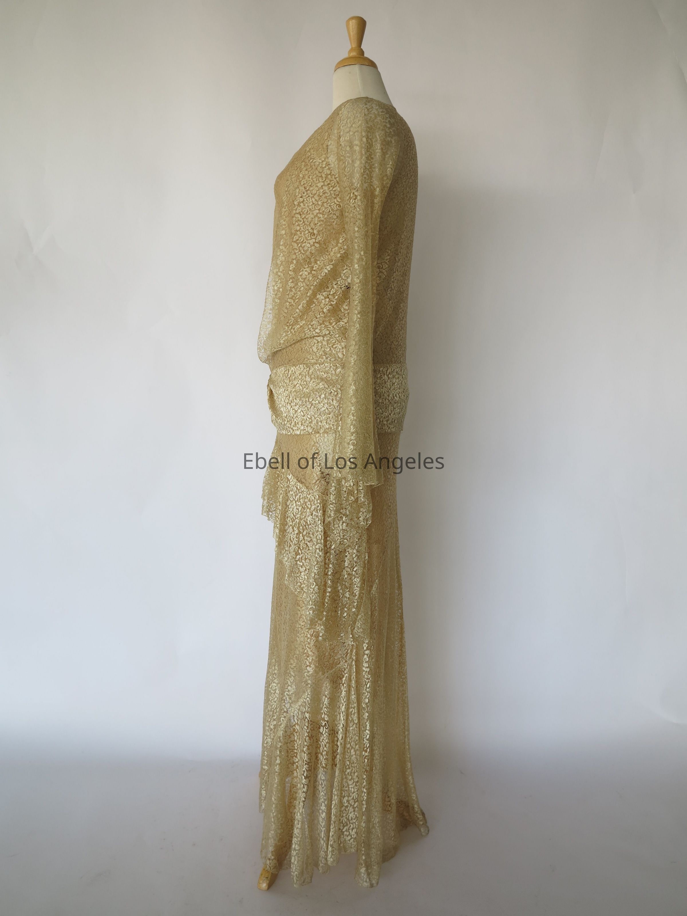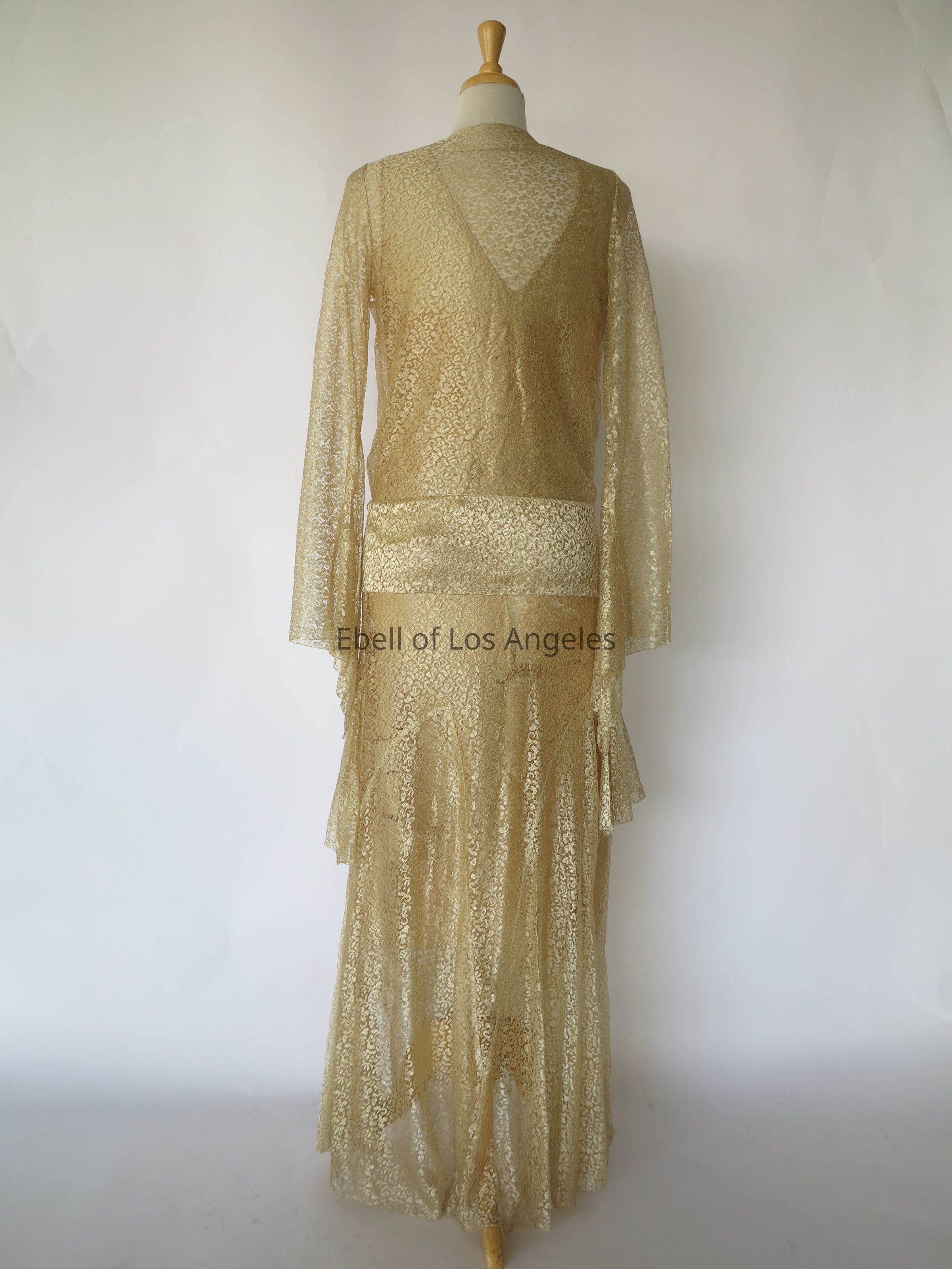 Long sleeve lace jacket with closure at peplum and sleeveless v-neck long flounced lace dressEntry/Object ID