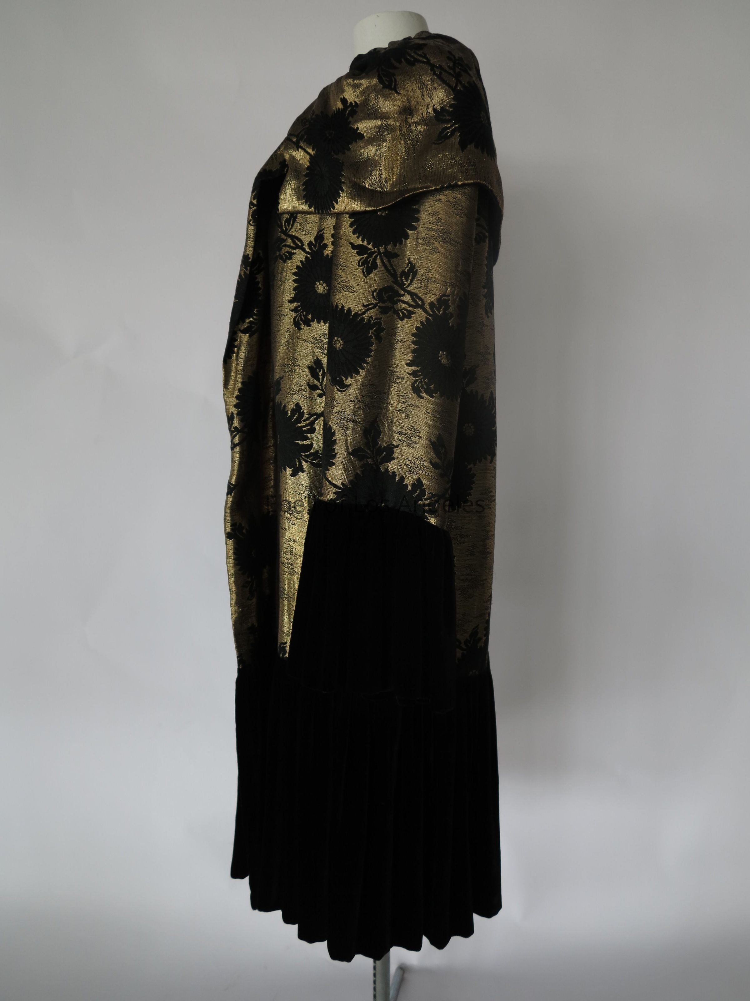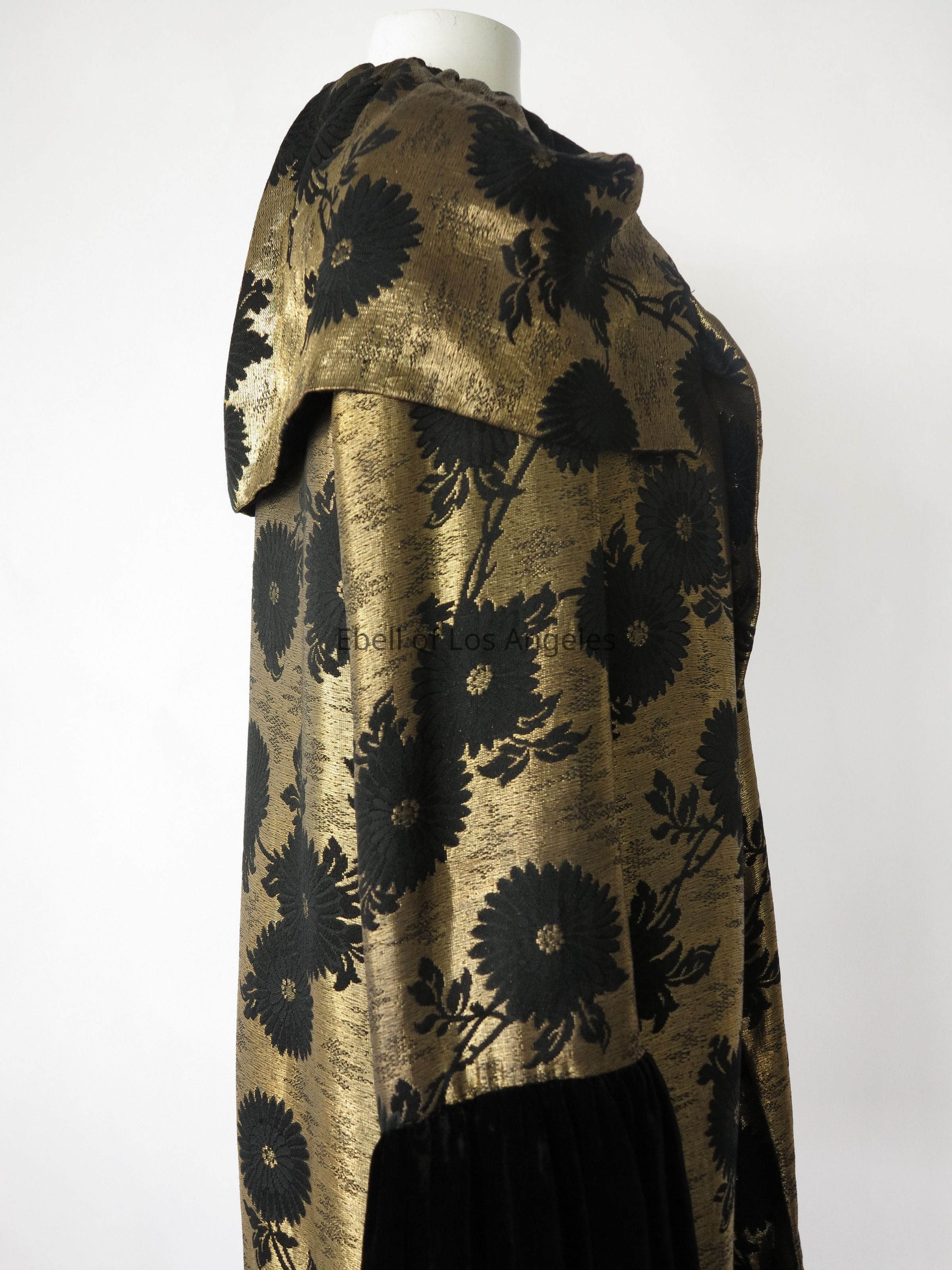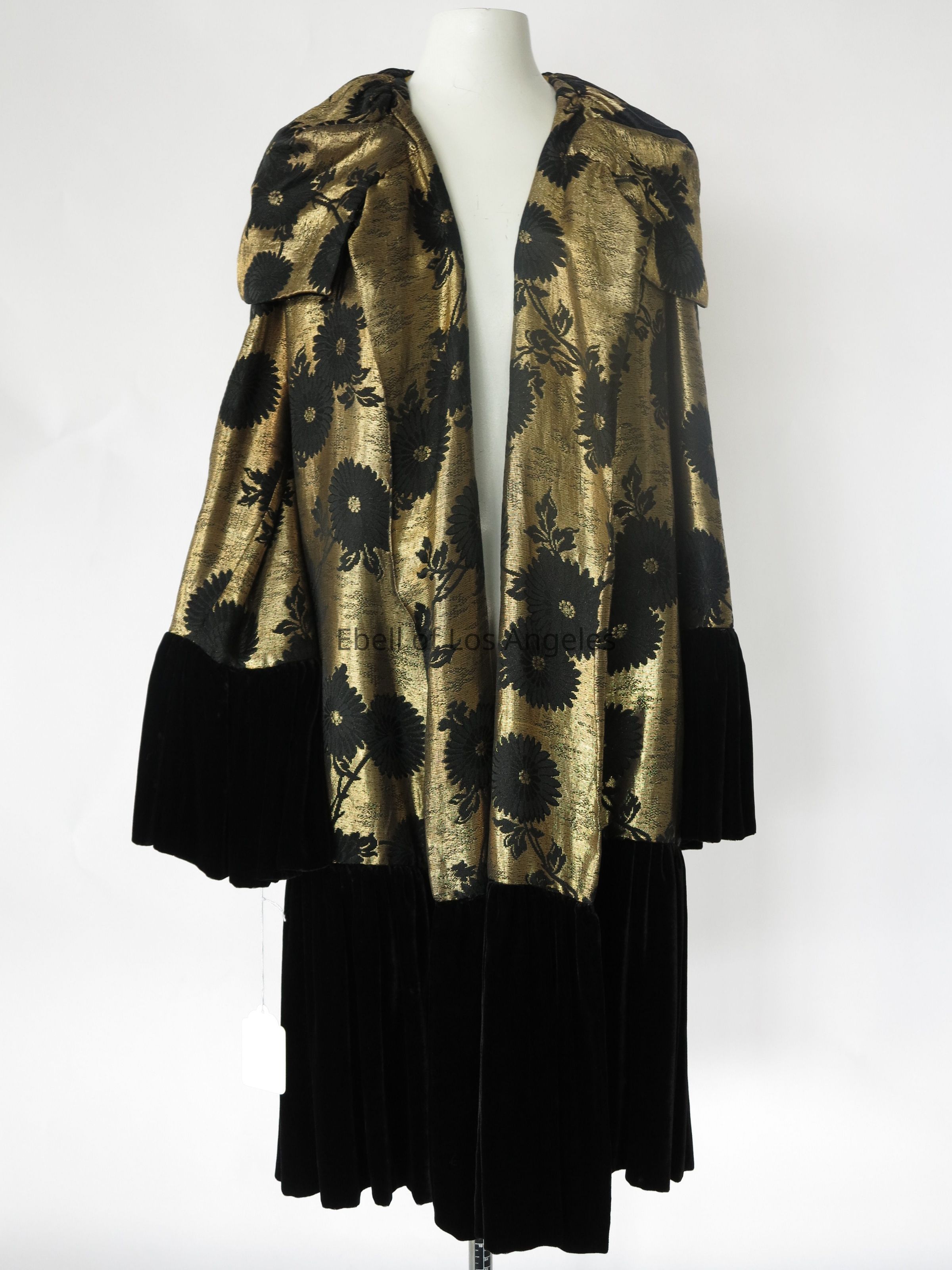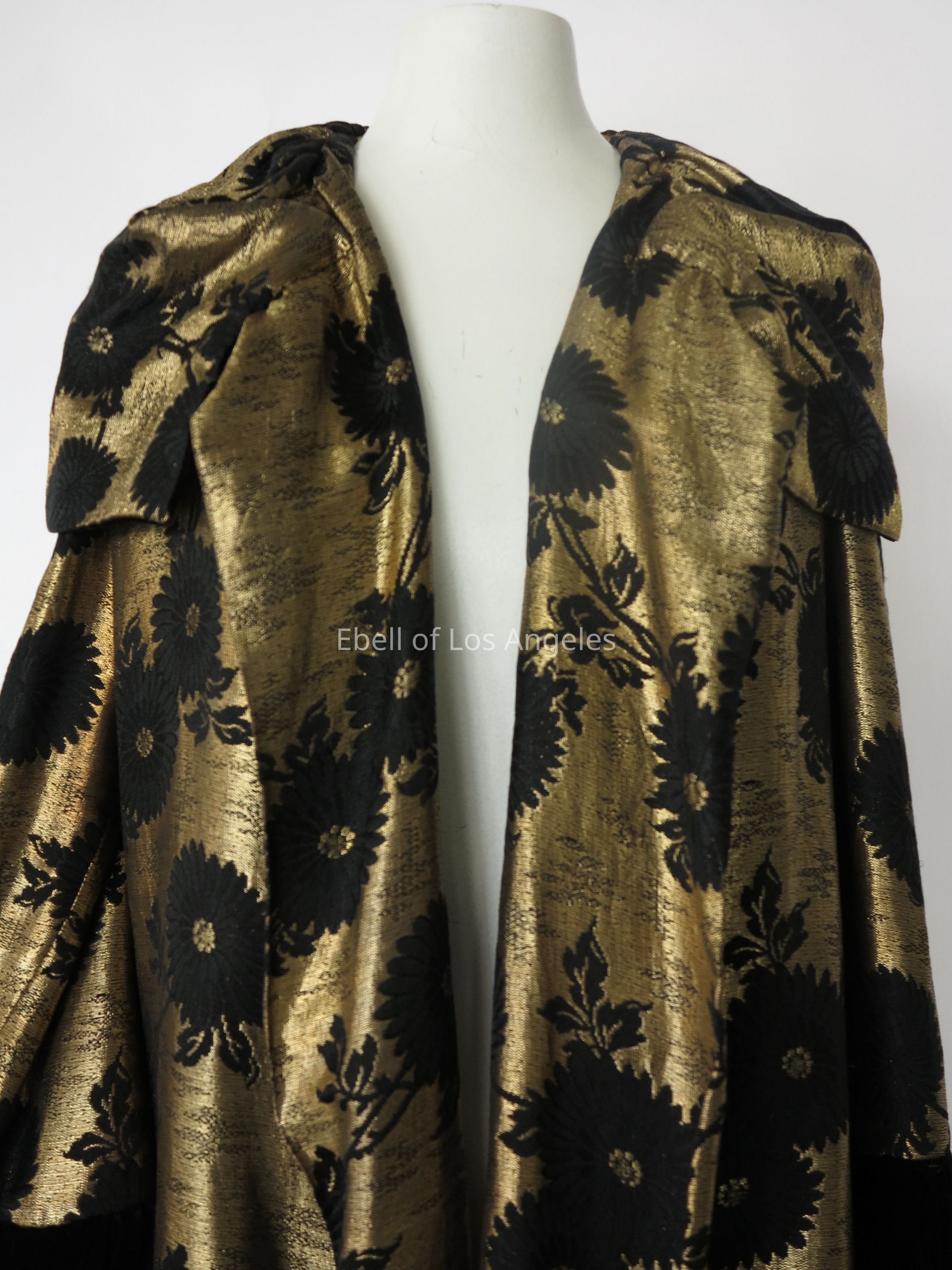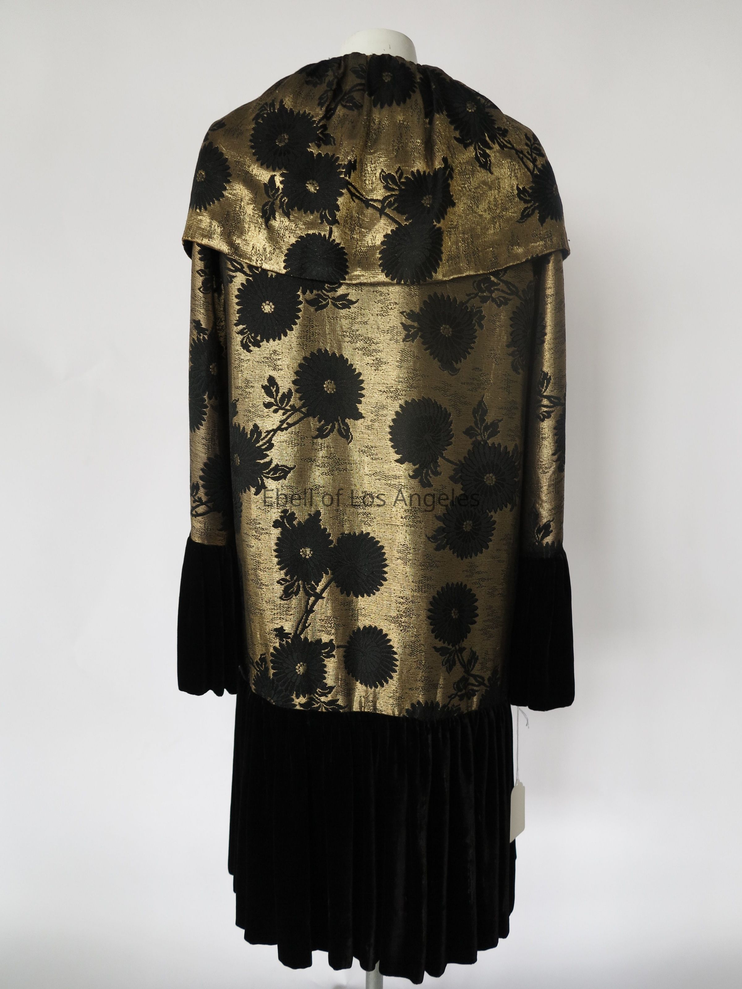 Open front long sleeve gold brocade coat with black velvet cuffs and hem and shawl collarCollection