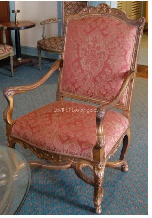 Regency style gold painted and carved armchair with fitted upholstered seat and back. The fabric is salmon colored damask and the chair is heavily carved on the top, arms, legs and stretchers with shell motifs.Collection