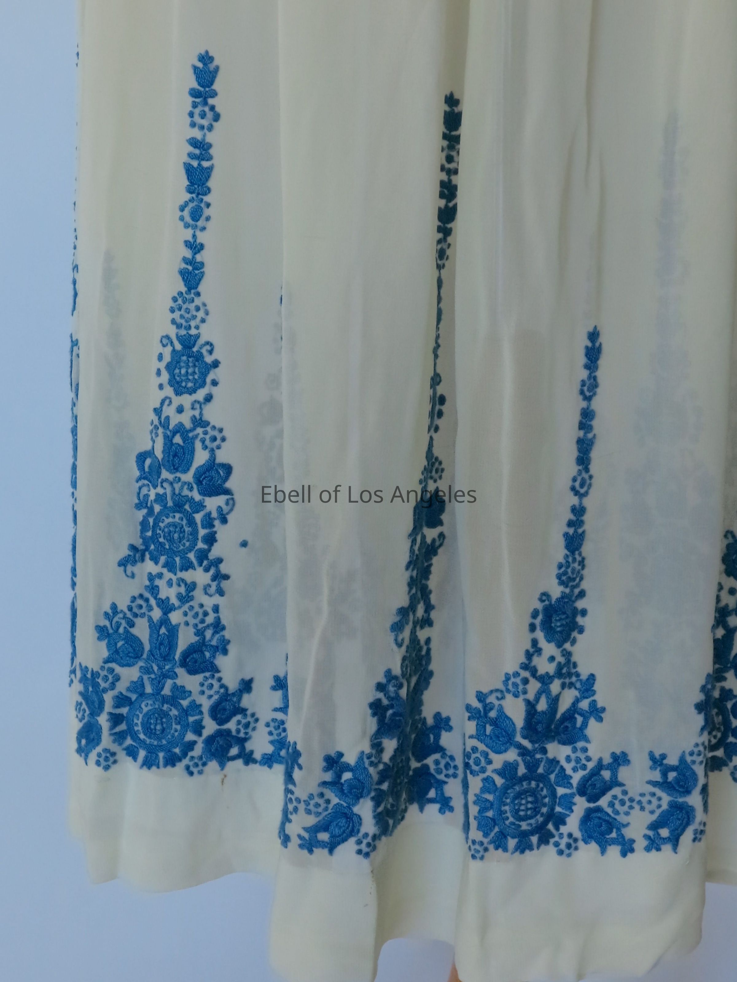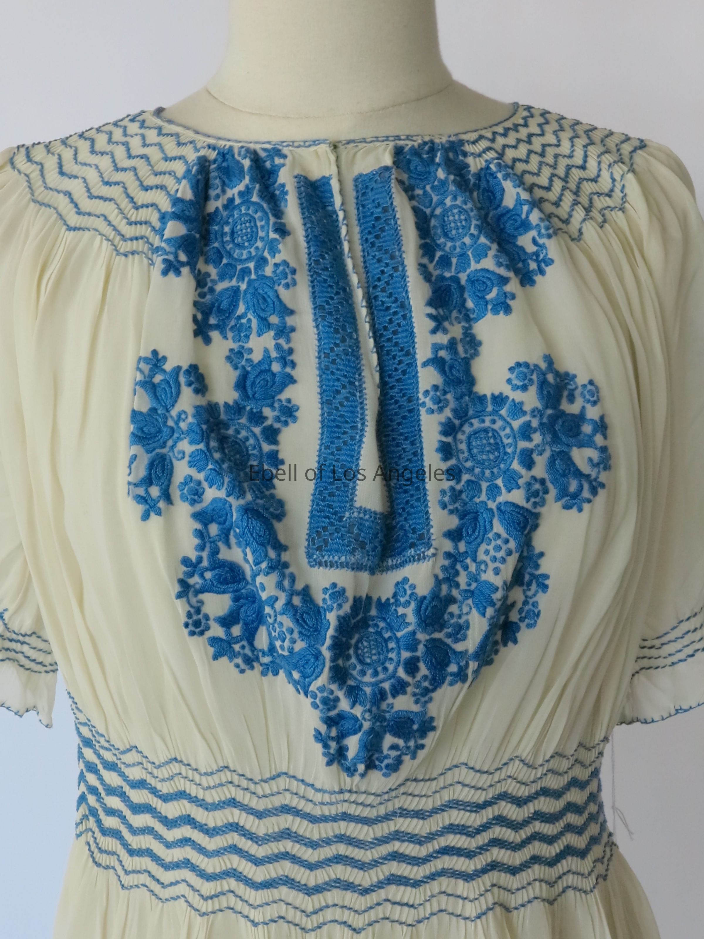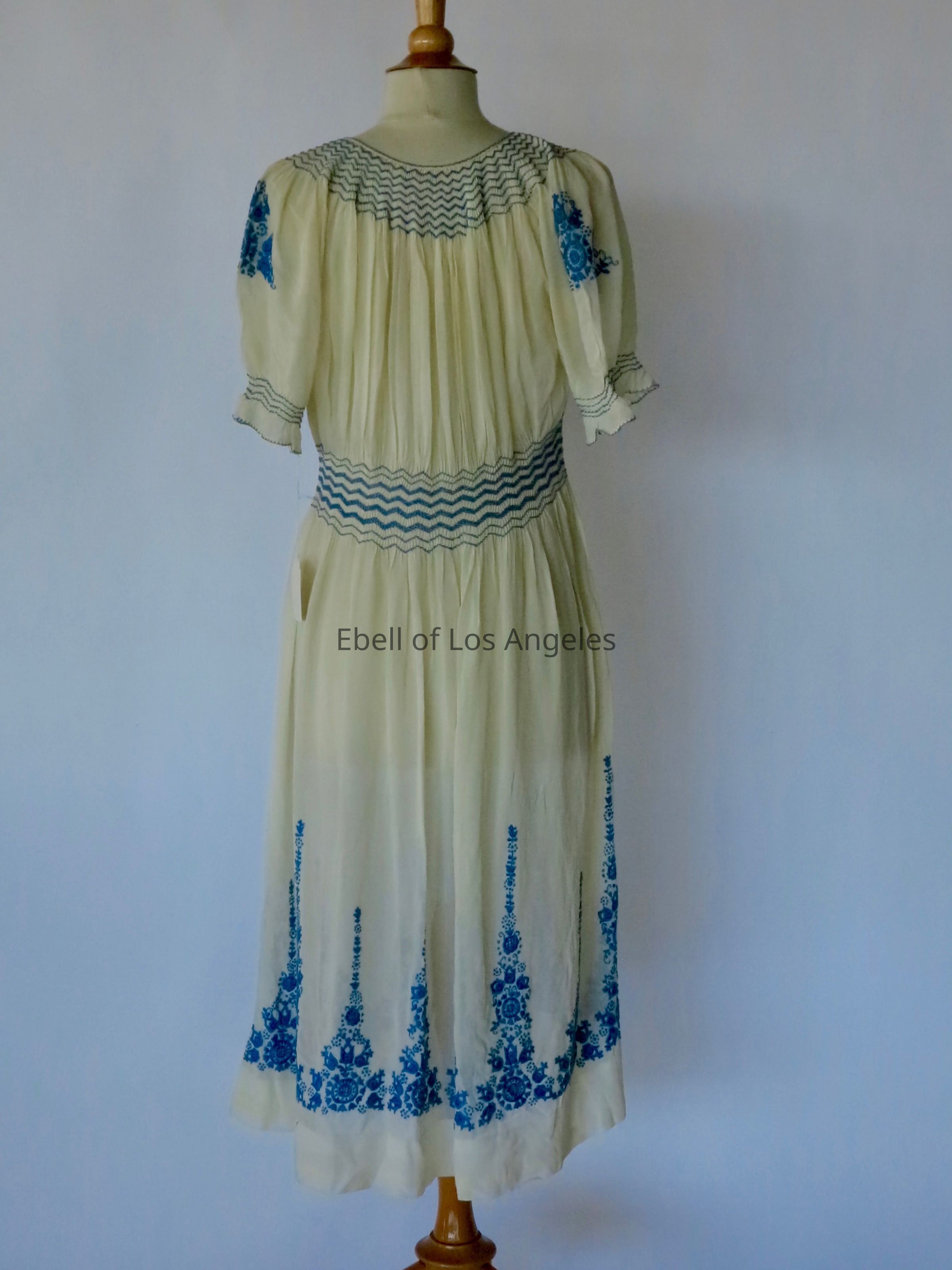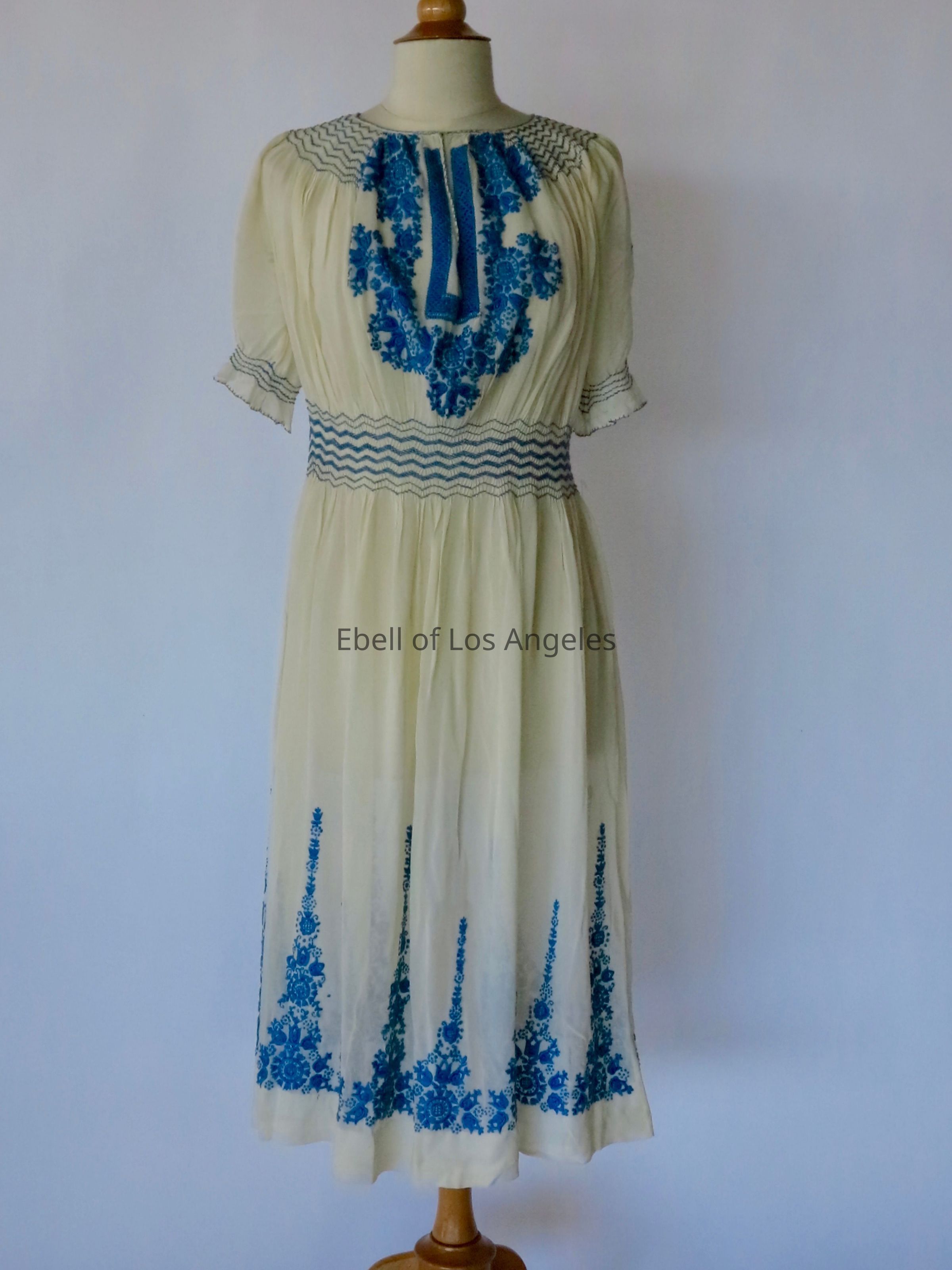 Peasant style dress with smocked waist, embroidered bodice and hem