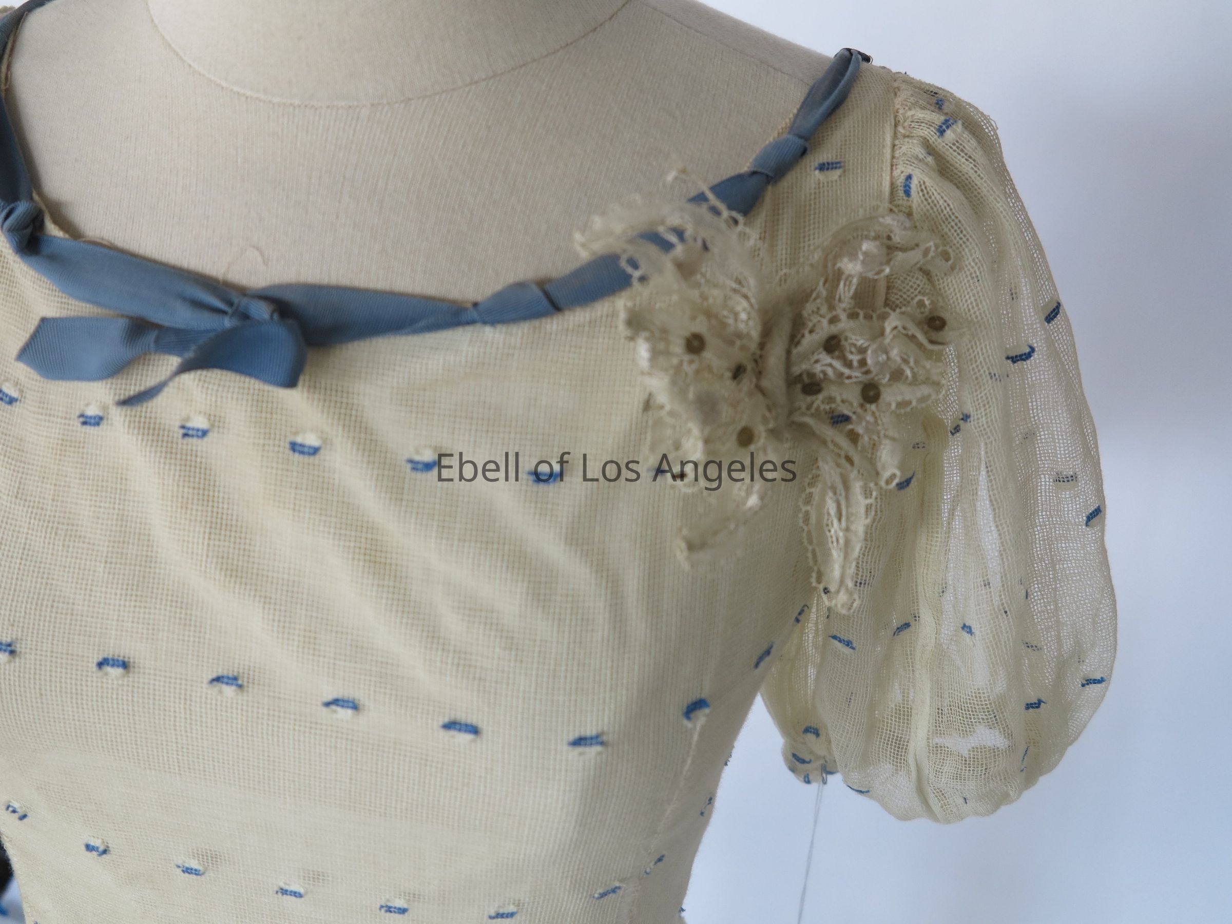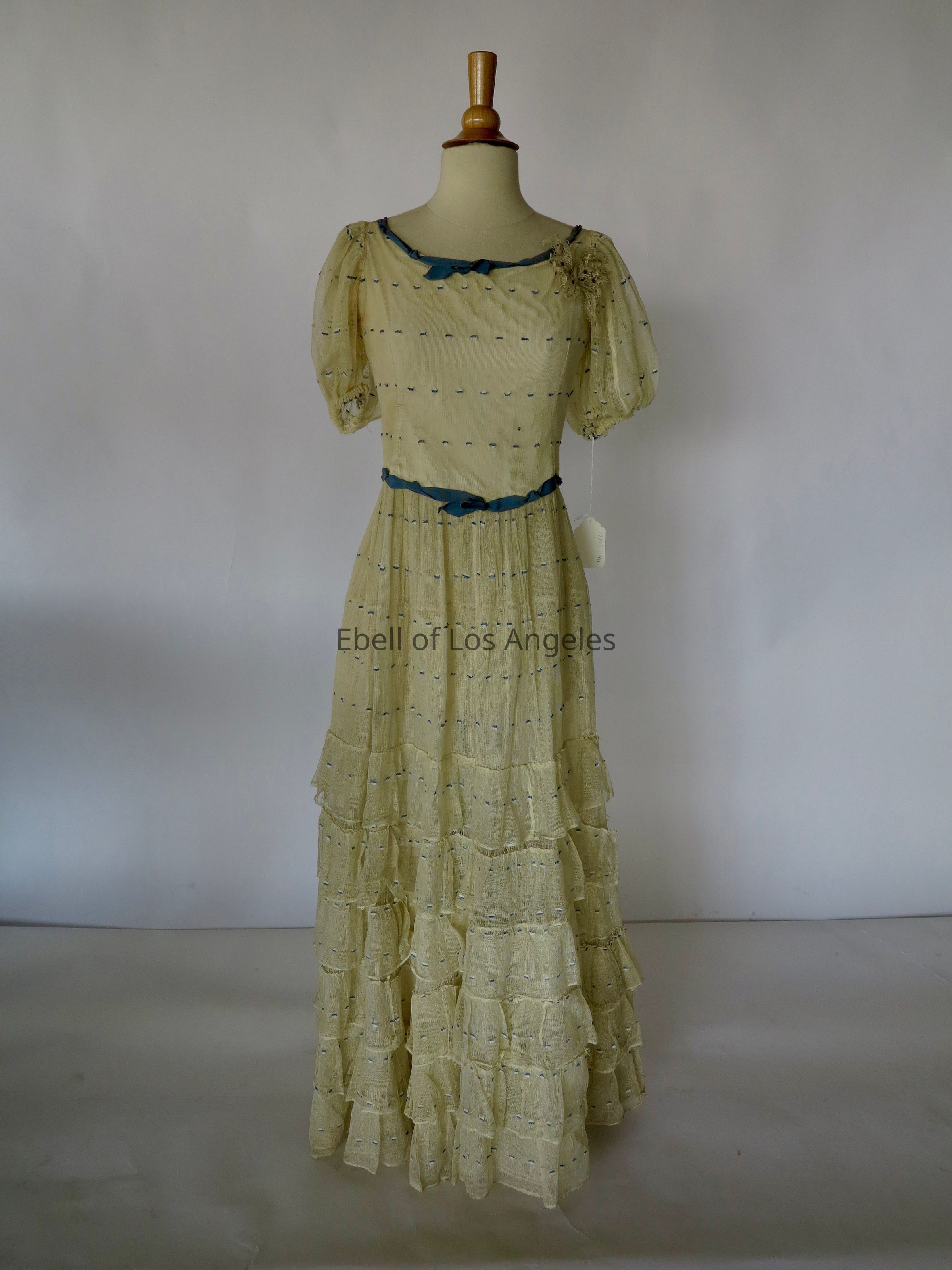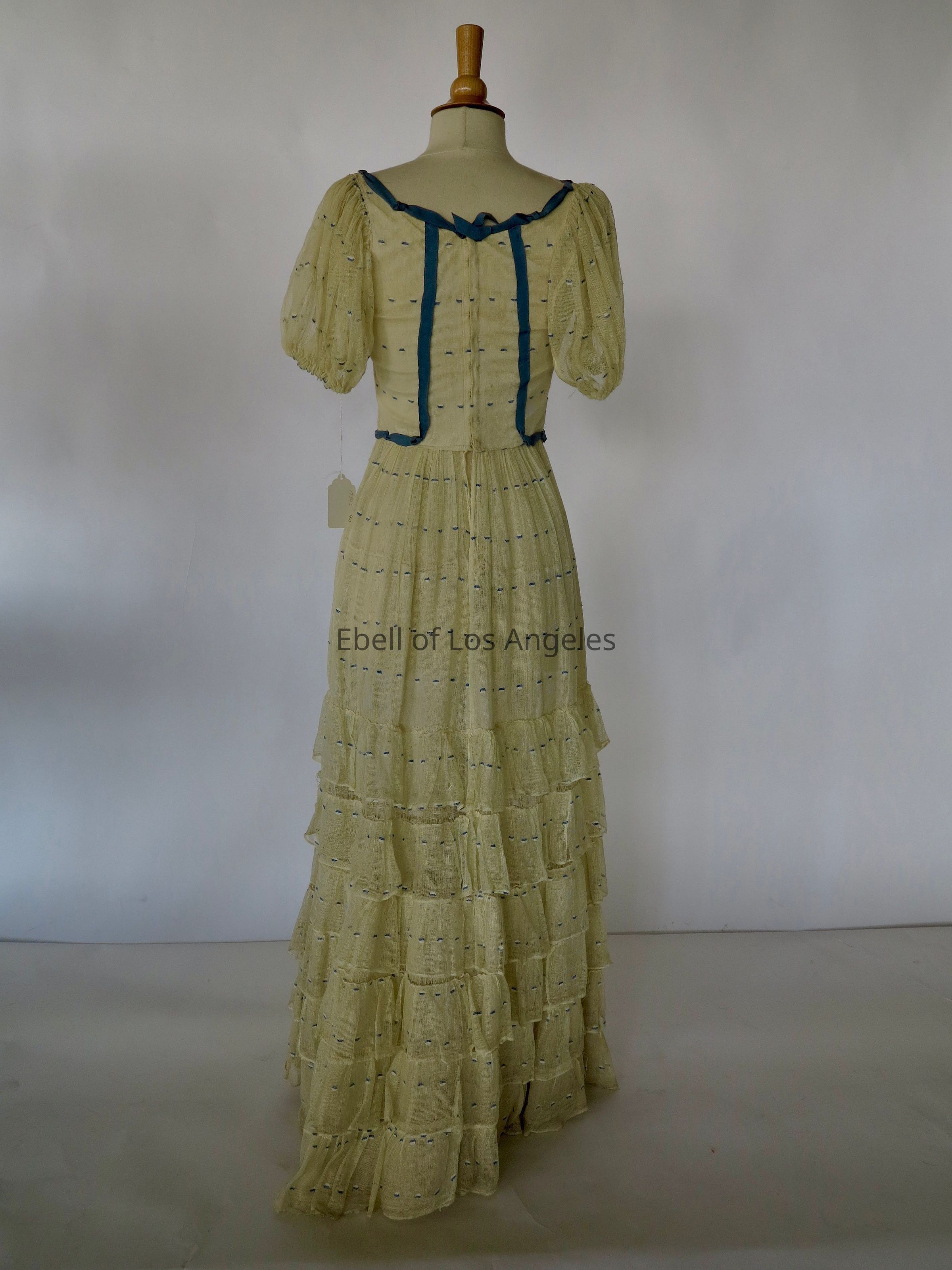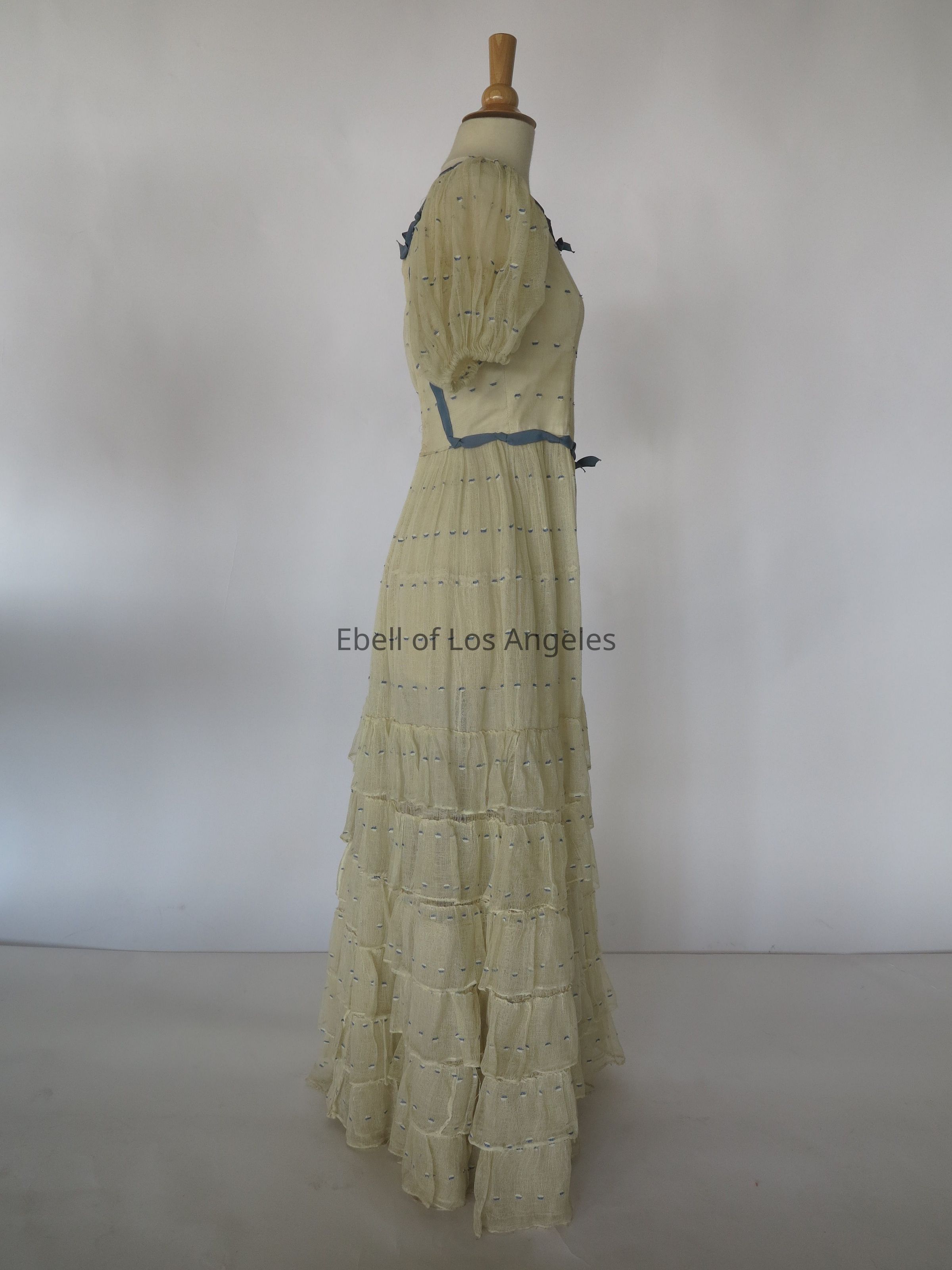 Puff sleeve long gauze dress with tiered skirt and blue ribbon trim