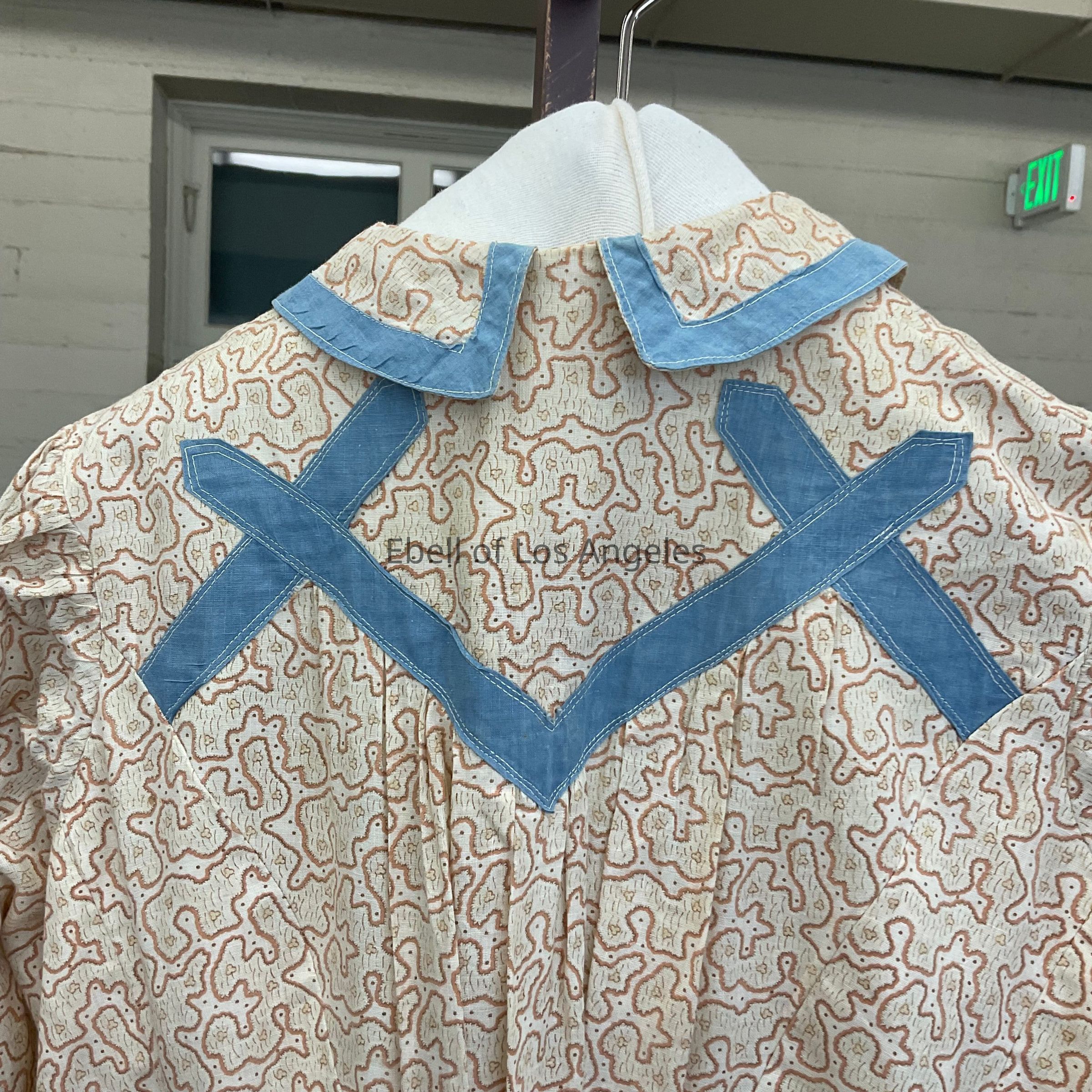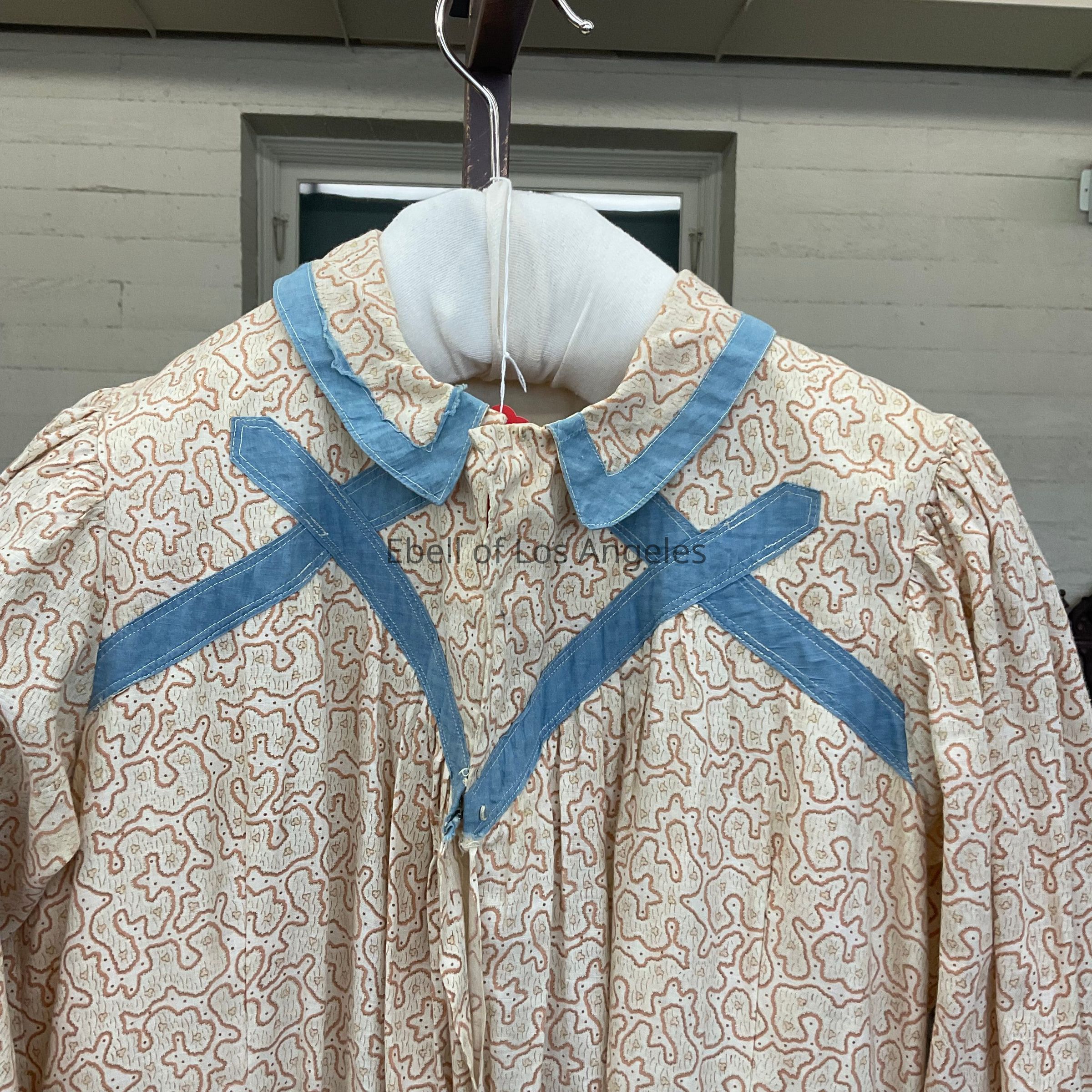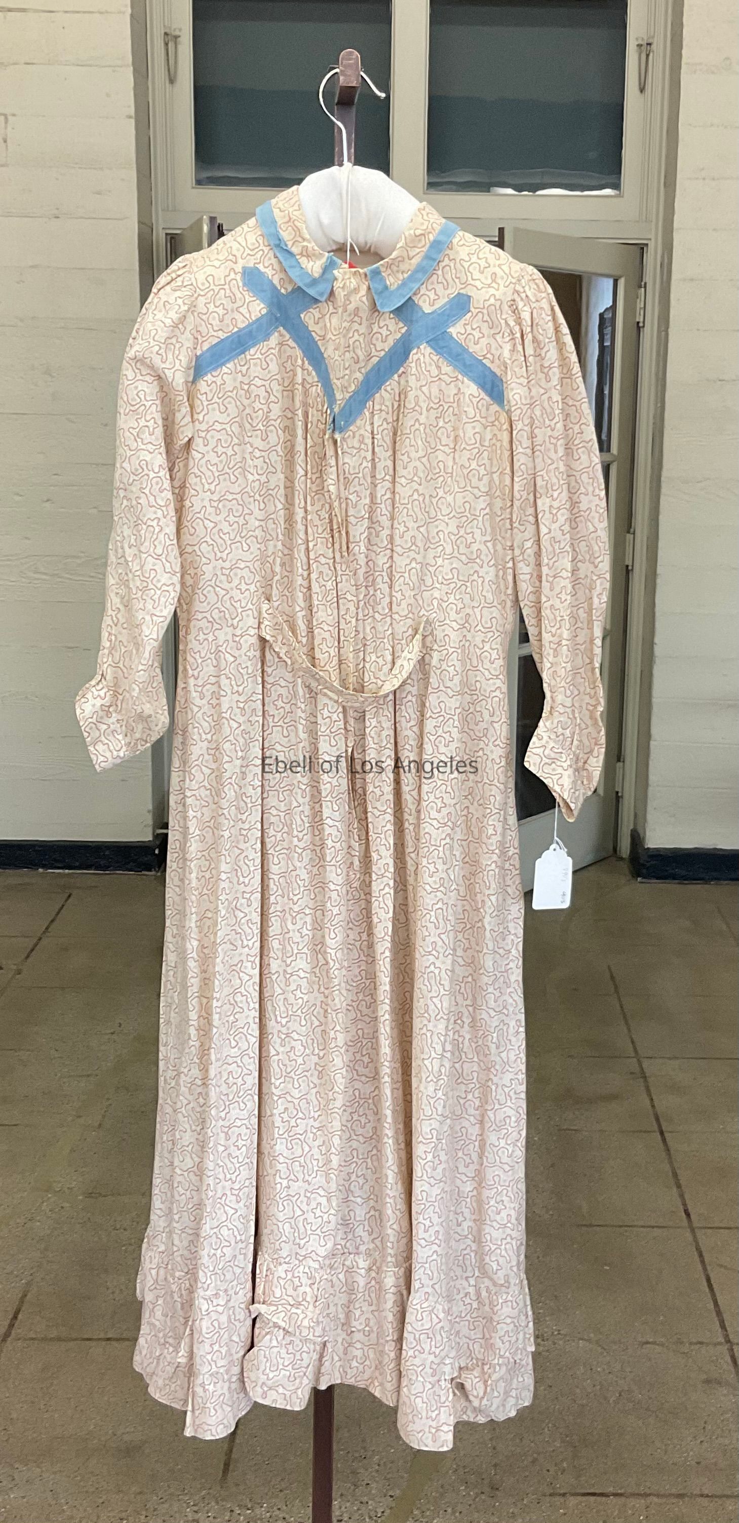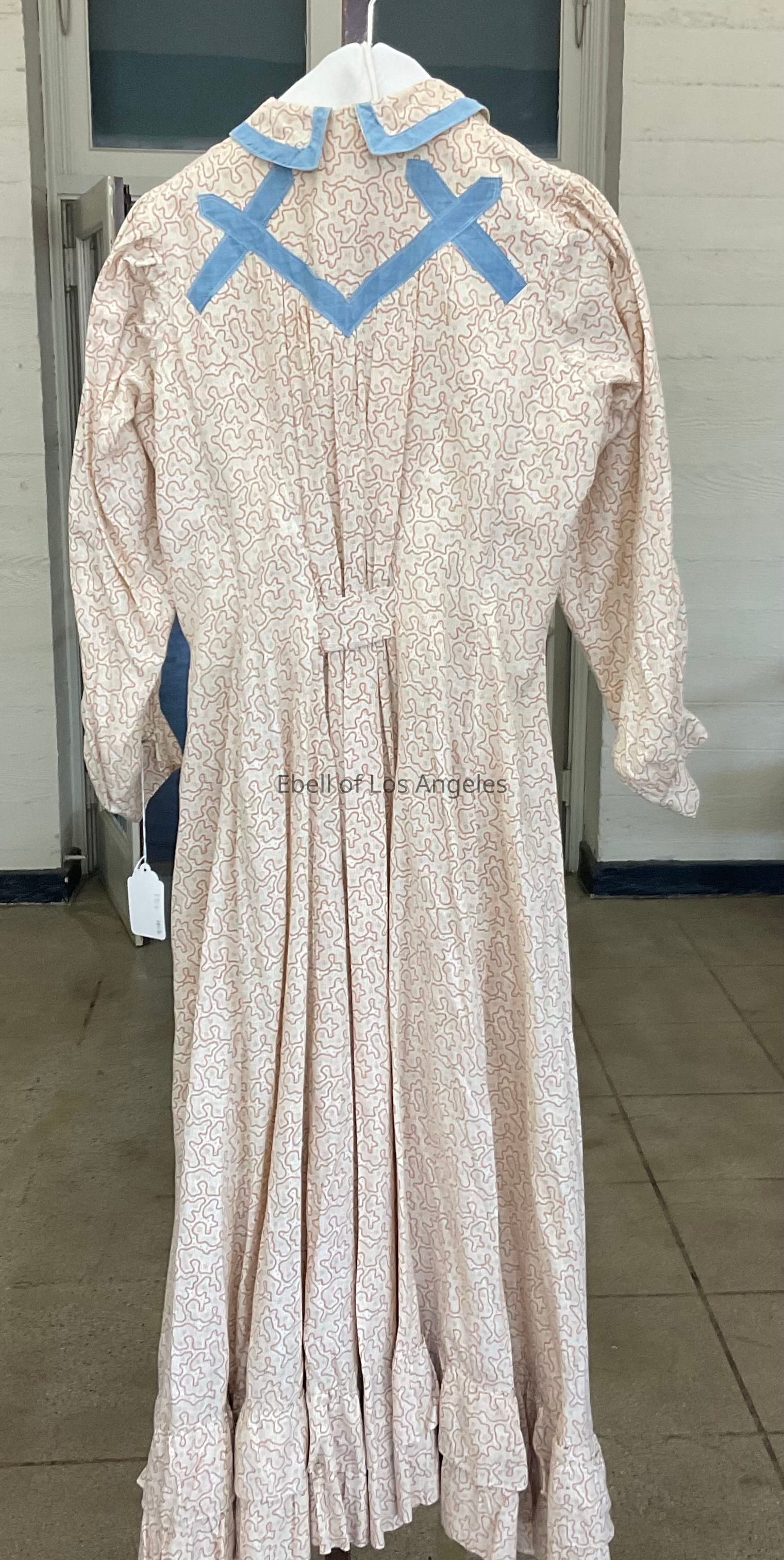 Long sleeve full length wrapper work dress with contrast blue fabric trim at collar and bodiceEntry/Object ID