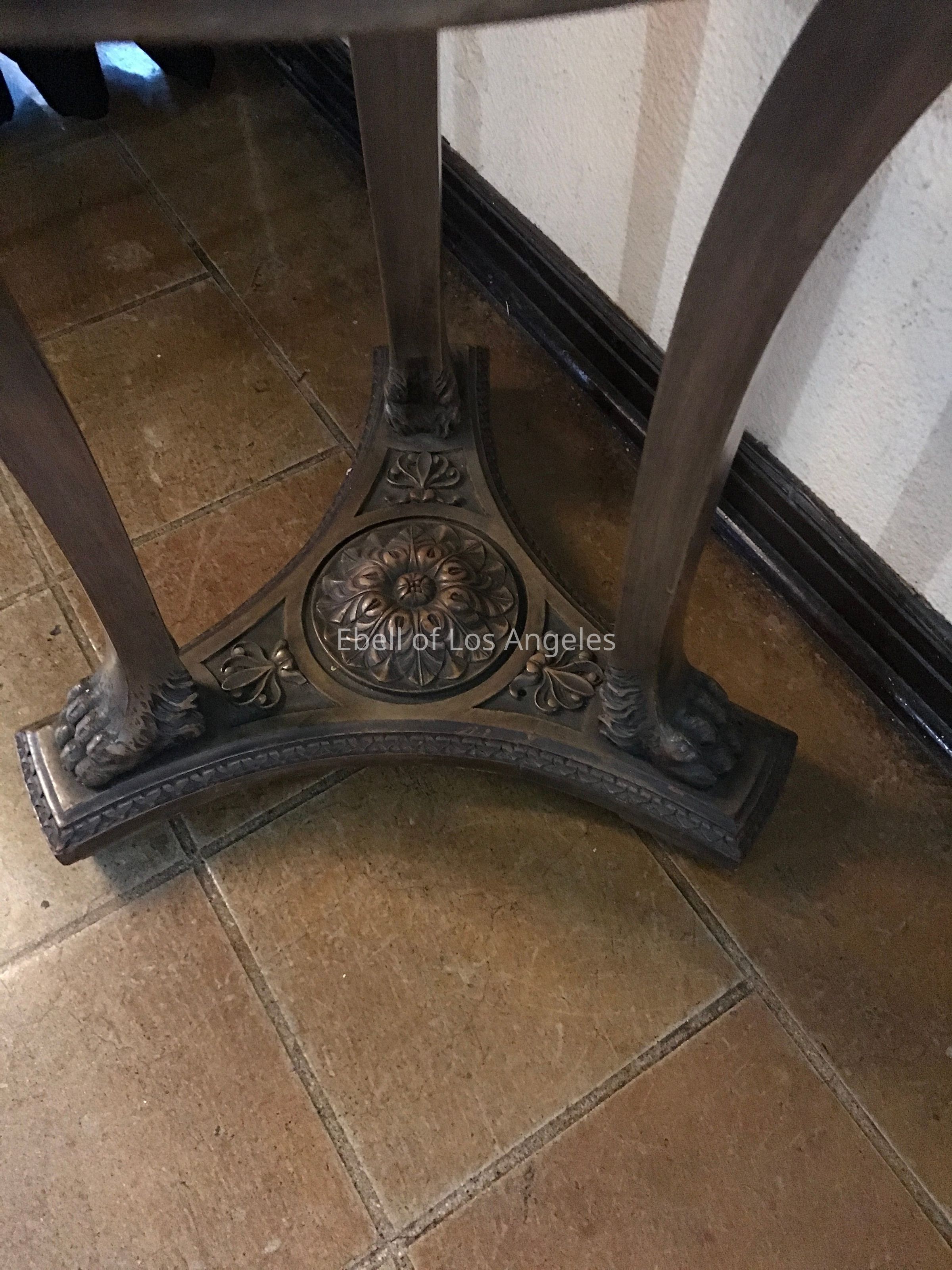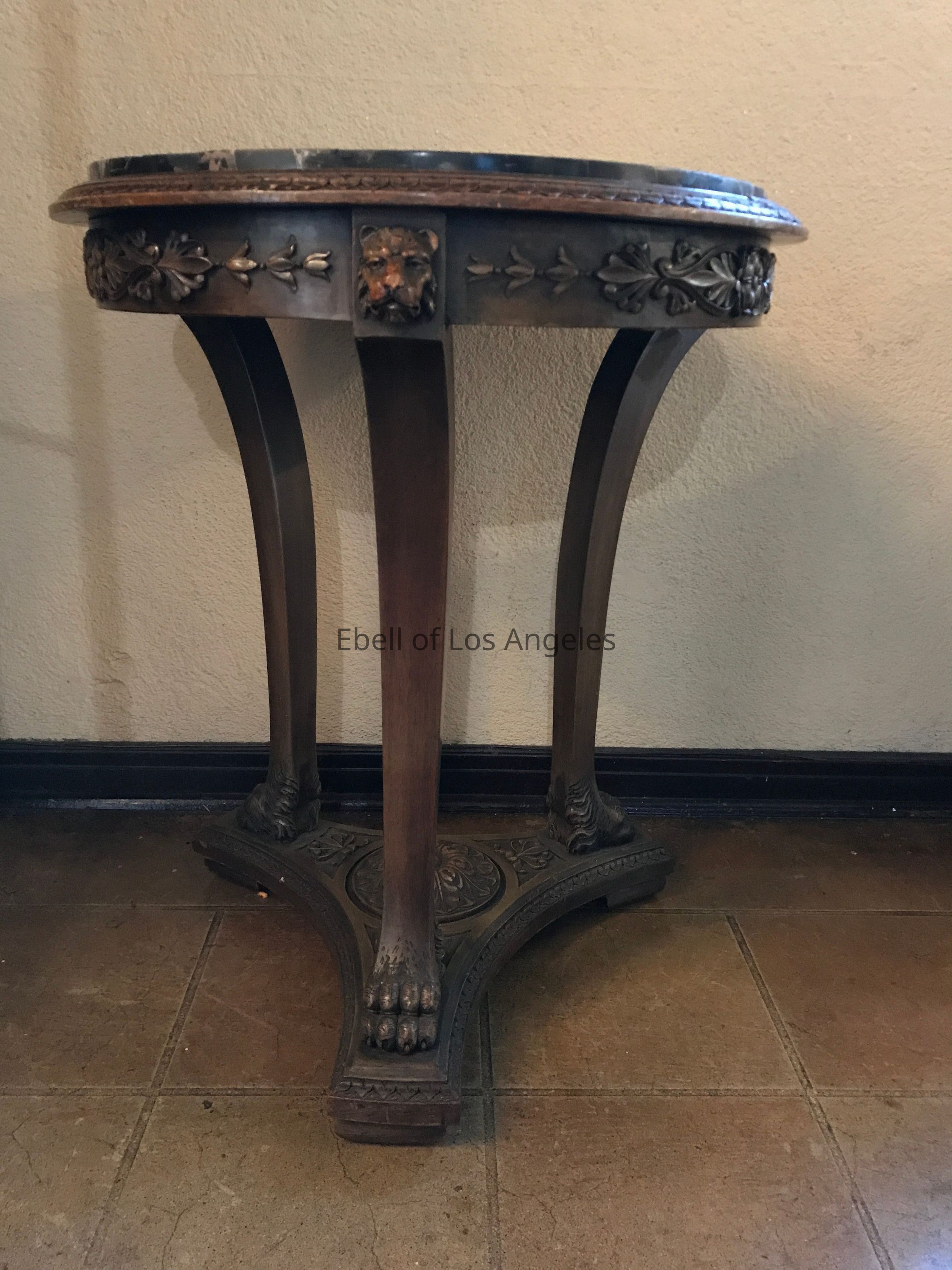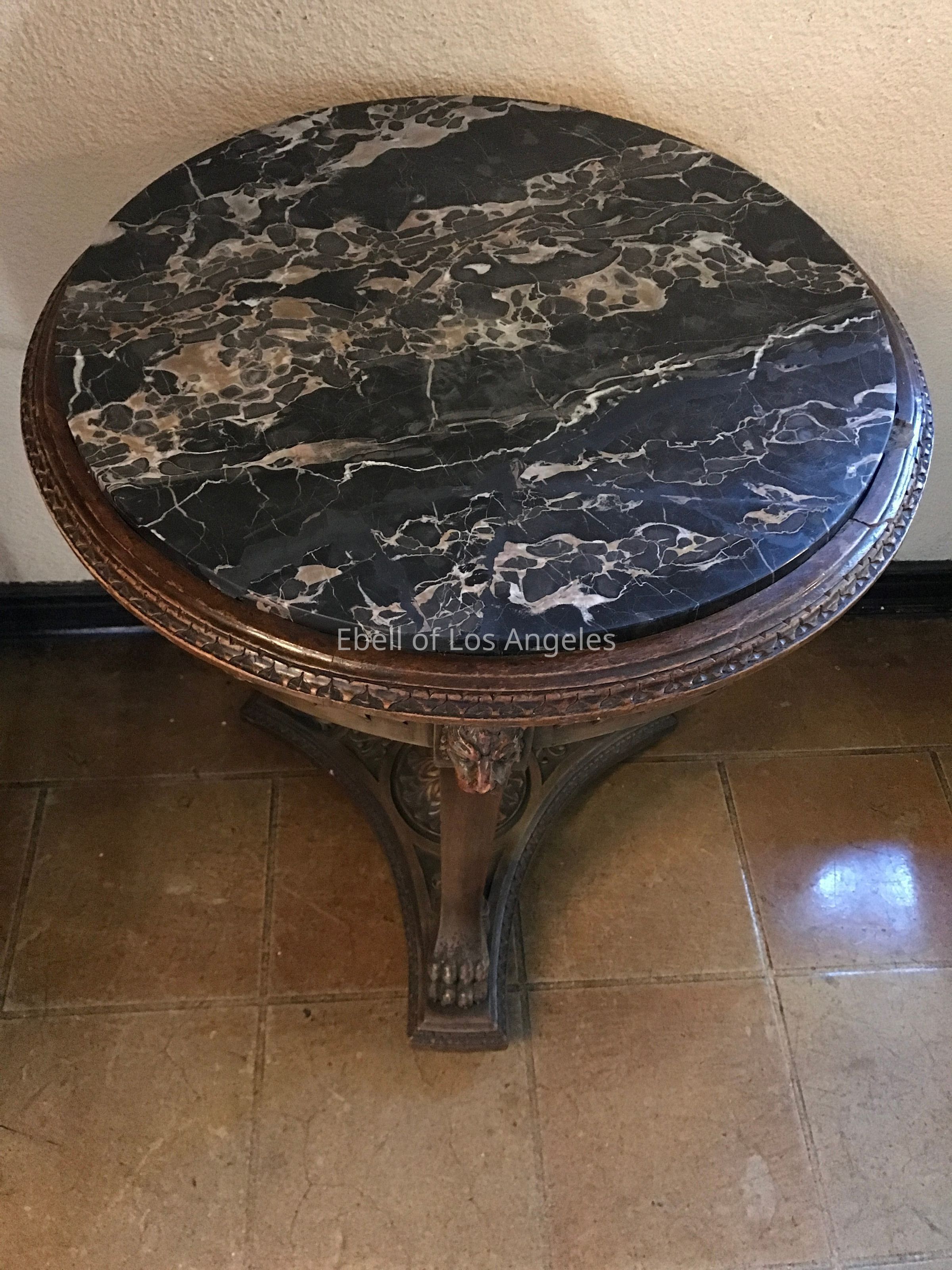 Pair of Renaissance revival style carved walnut gueridons/accent tables with three curved legs ending in lion's paw feet. Black marble top with white veining. Inlay floral design on base. Carving along the apron with lion head accents.Collection