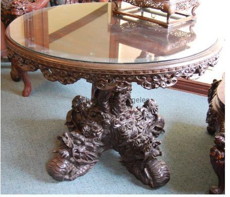 Carved Japanese hardwood occasional table, last quarter 19th century. Circular top carved in a low relief with a narrow band of iris stalks and edged with a beaded trim above a narrow frieze along apron carved in high and pierced relief with leafy iris scrolls. The top is supported on a central pedestal carved with acanthus leaves and splaying out at the base into four dragon head and feet whose eyes are inlaid in mother of pearl and ivory. The table is topped with glass.Collection