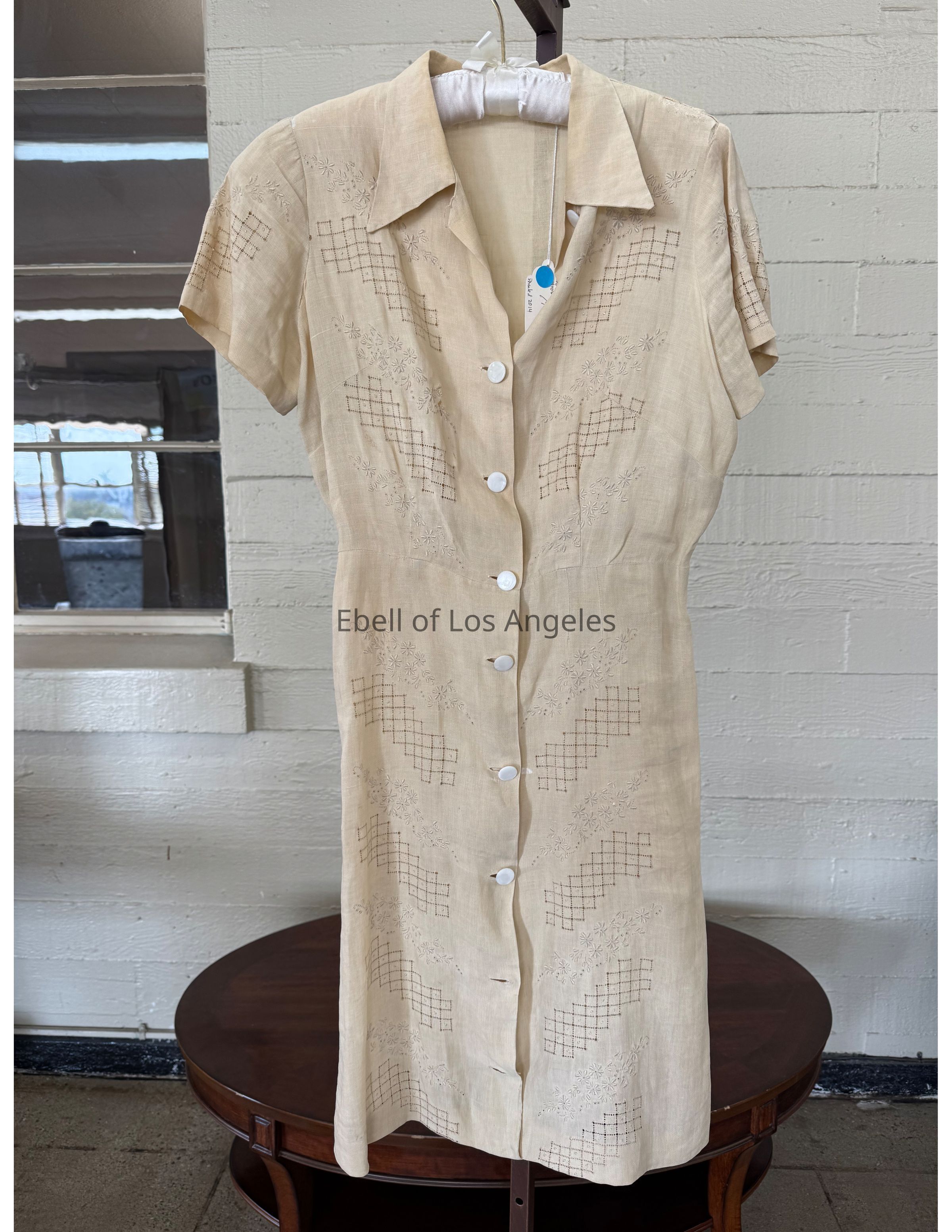 Shirtwaist dress with fitted waist, drawn thread, notched collar, short sleeves