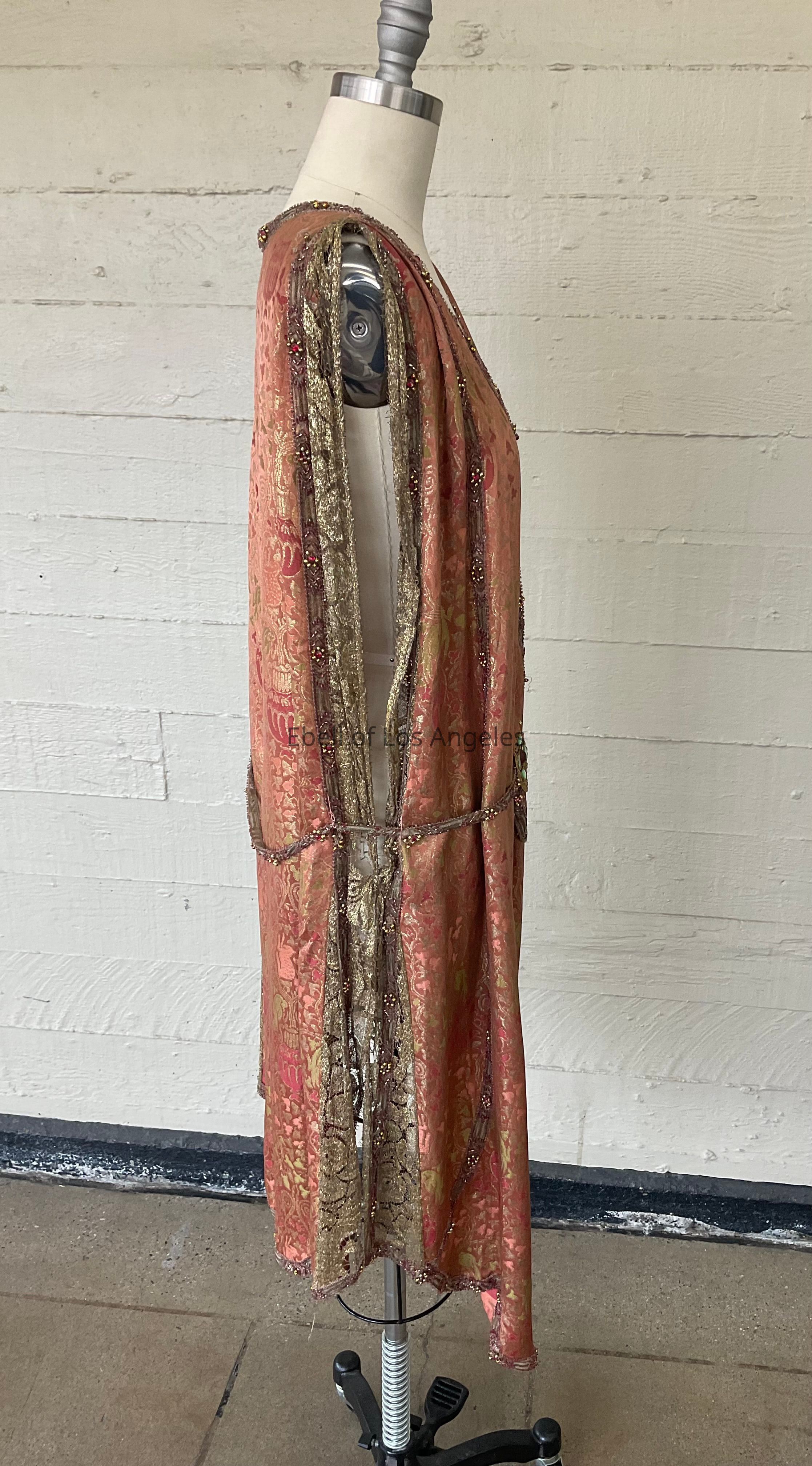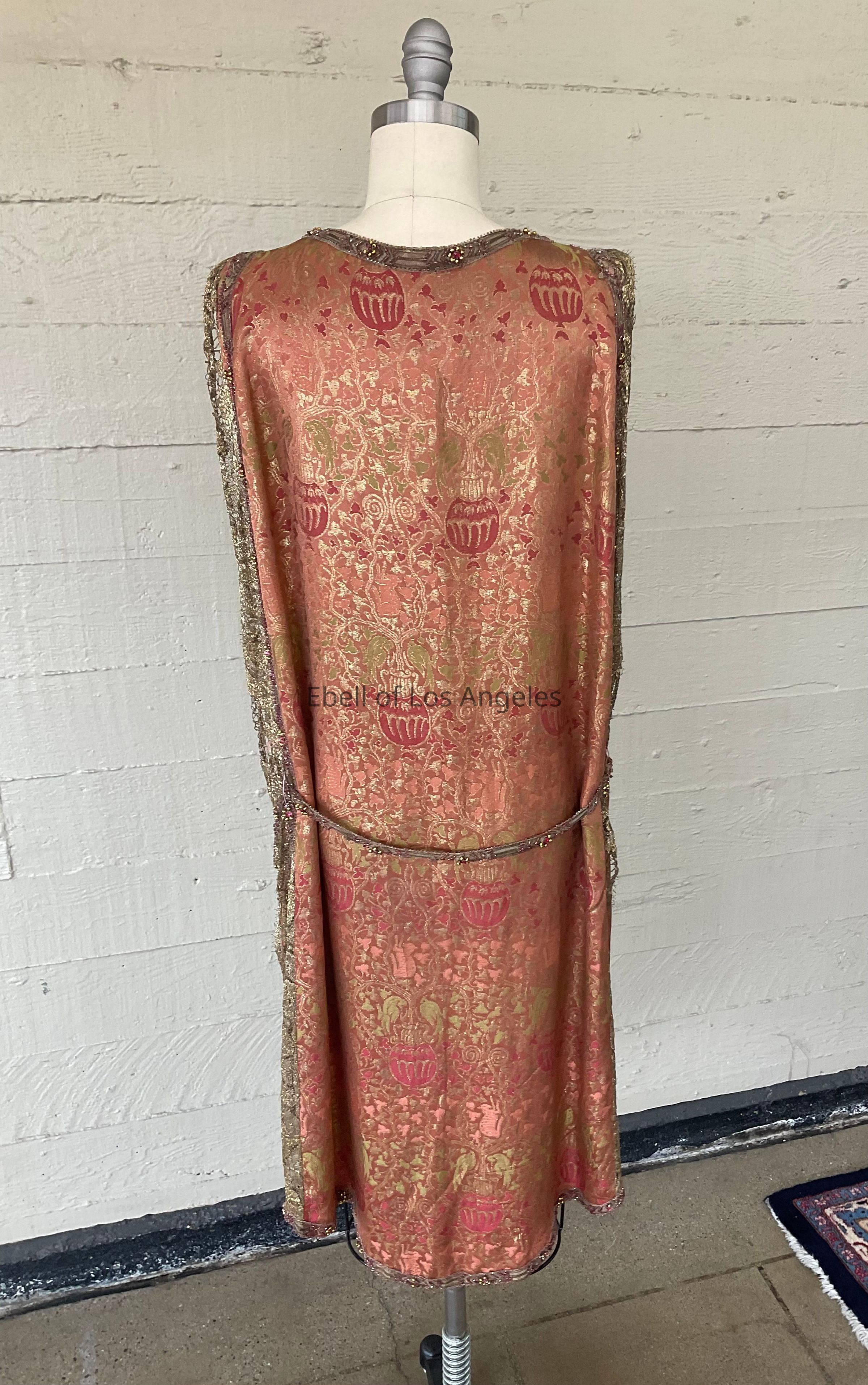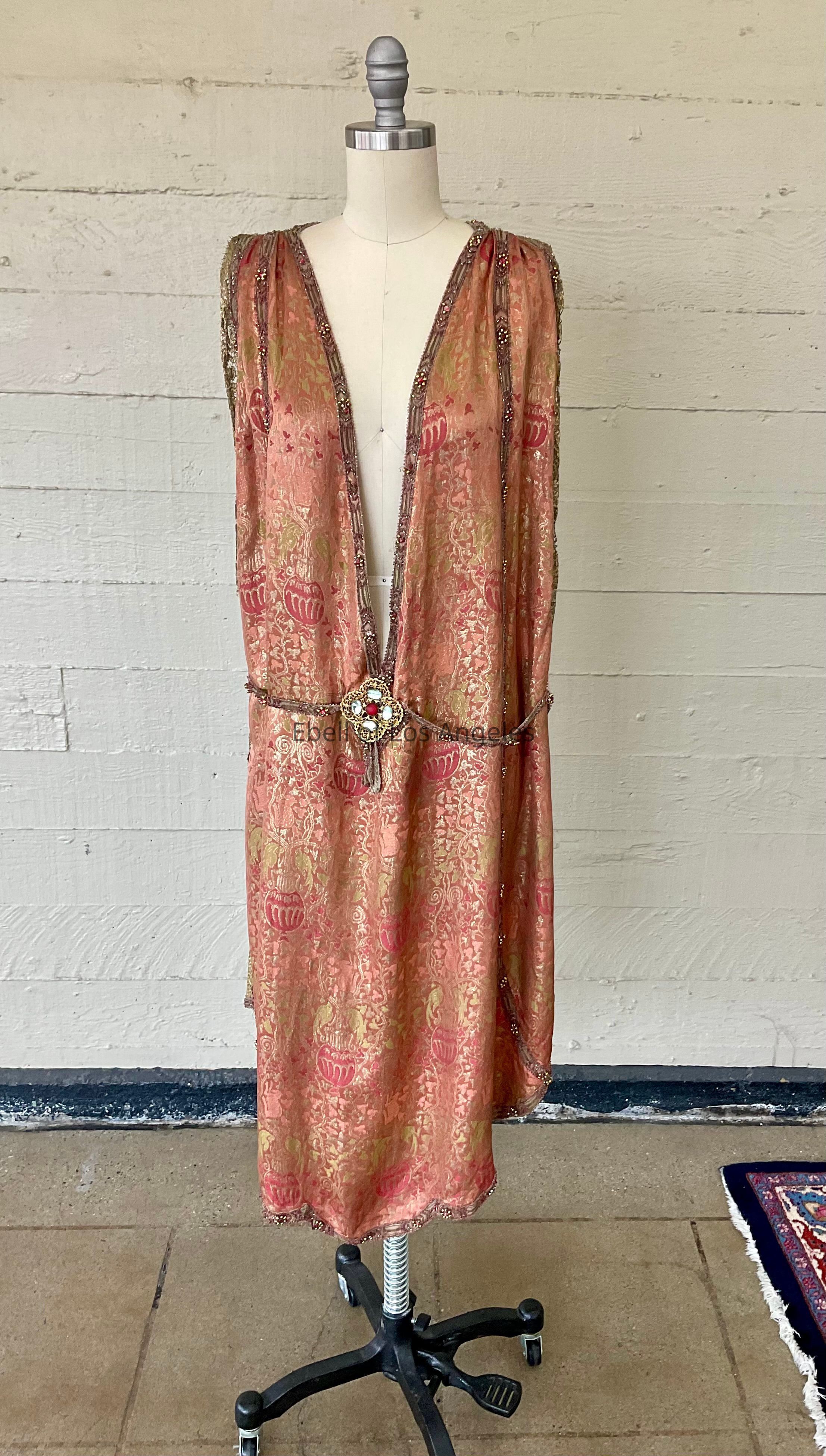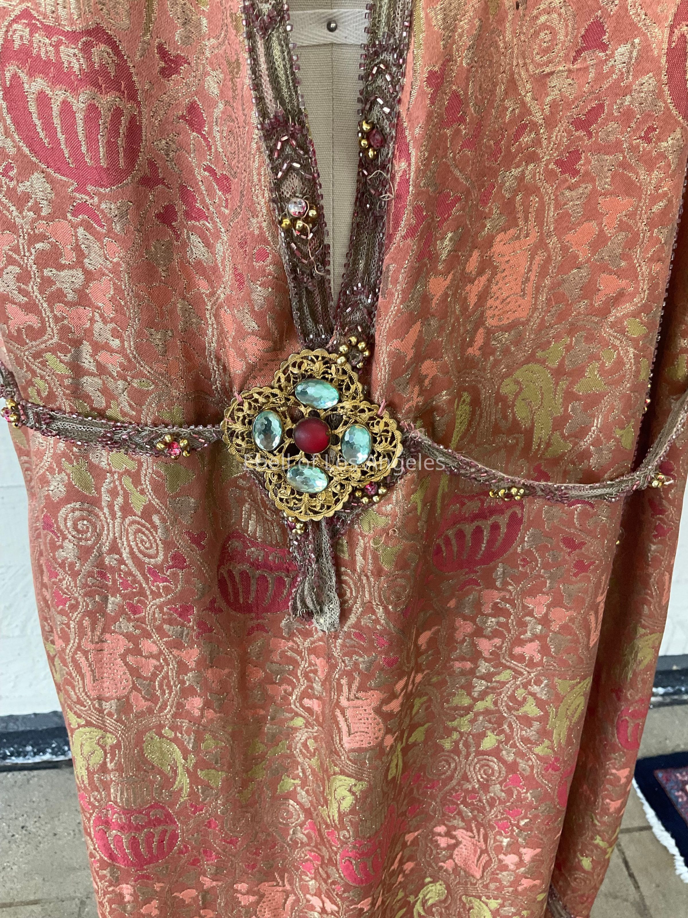 Brocade tabard dress with beaded metallic trim and metallic lace with embellished belt