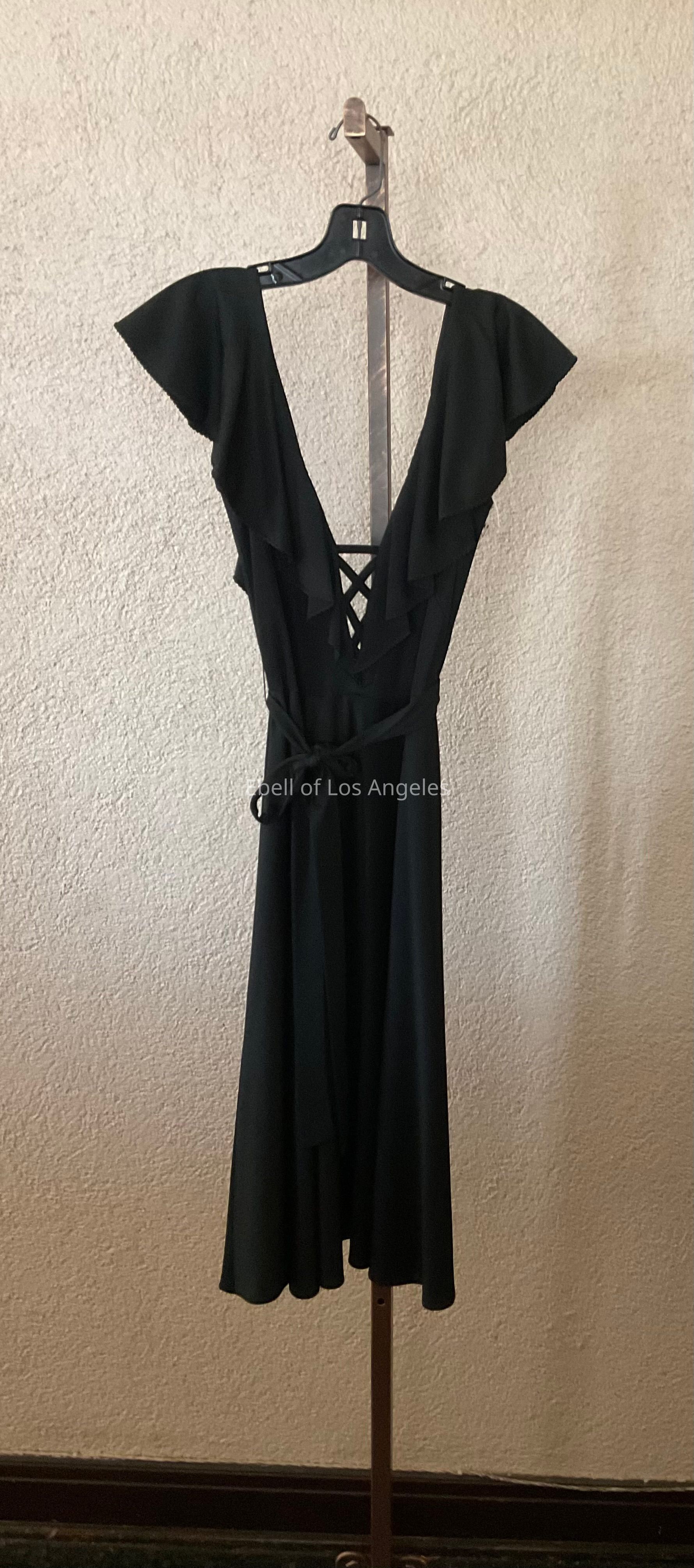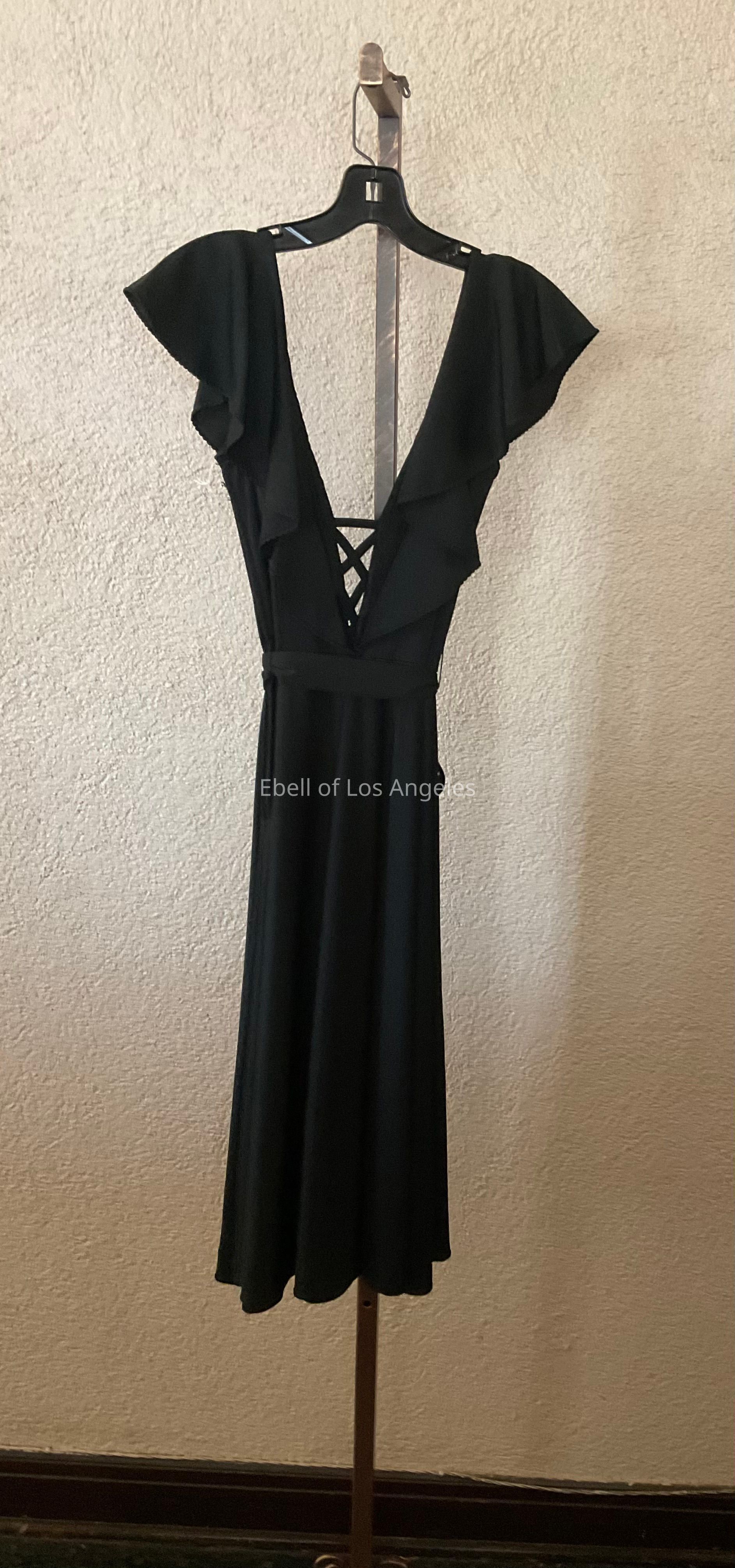 Ruffle neck sleeveless calf length jersey dress with self tie and deep V laced neckline