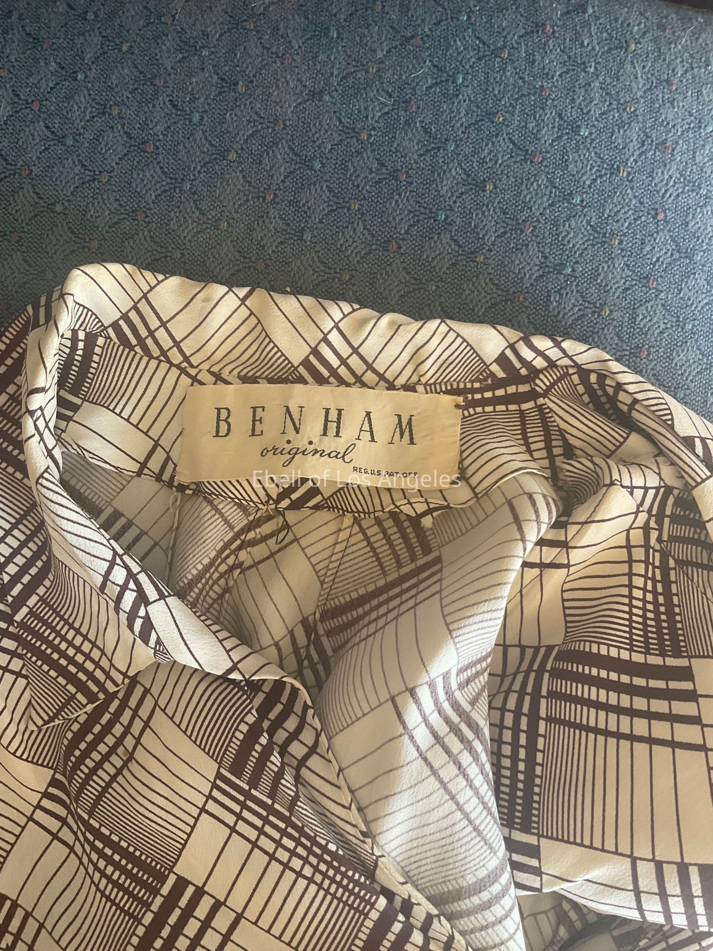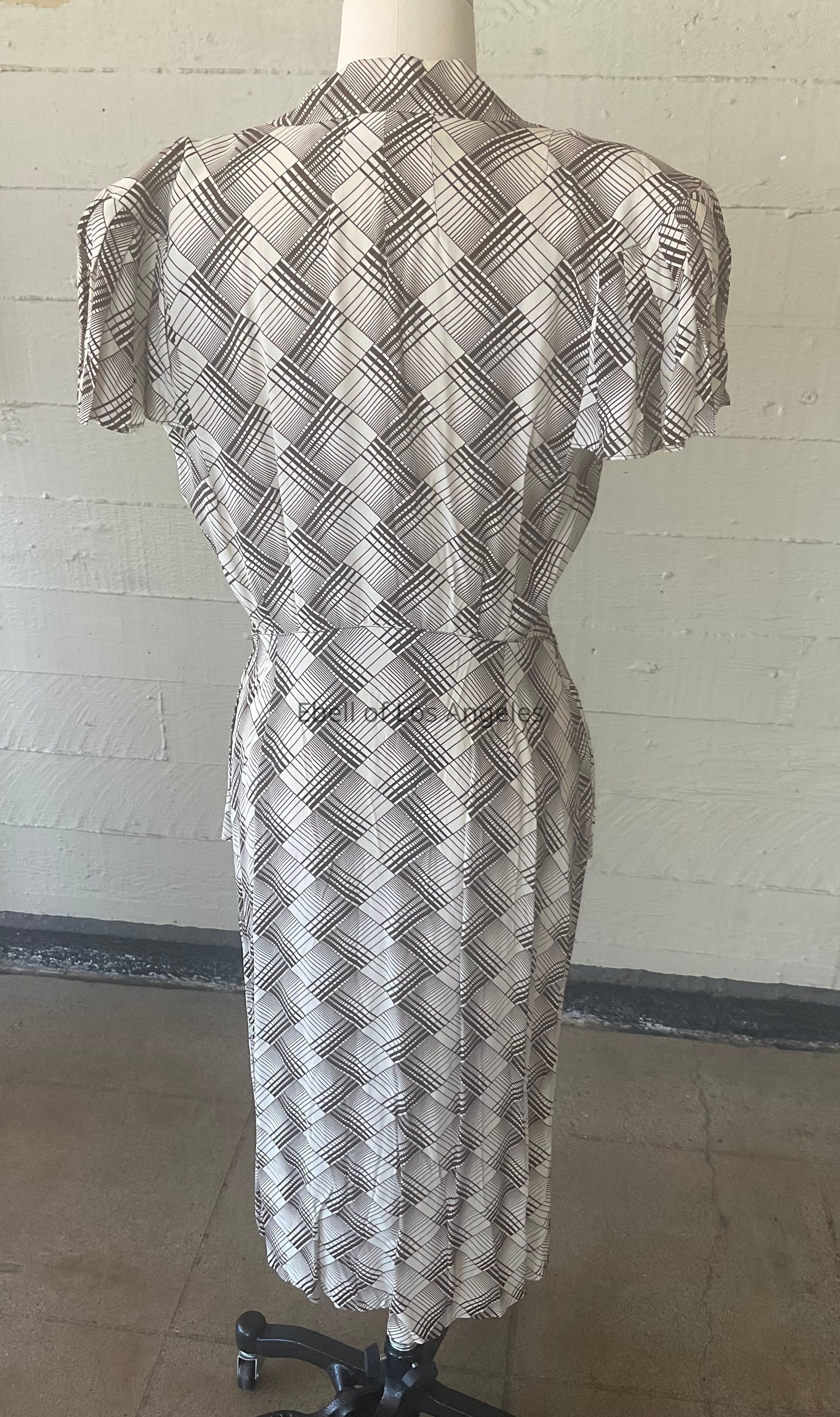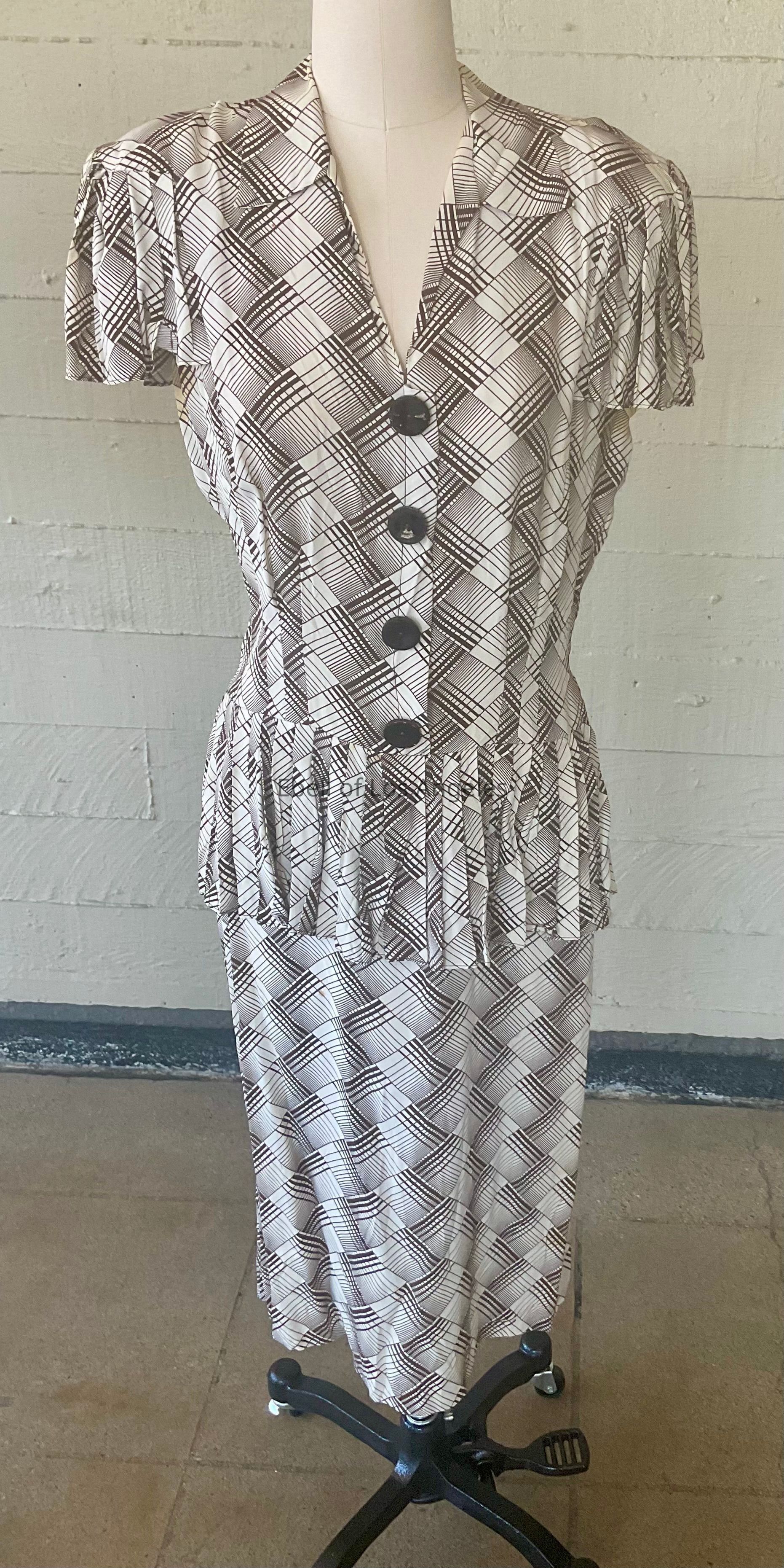 Geometric print day dress with peplum, notched collar, front buttons and pleated short sleeves